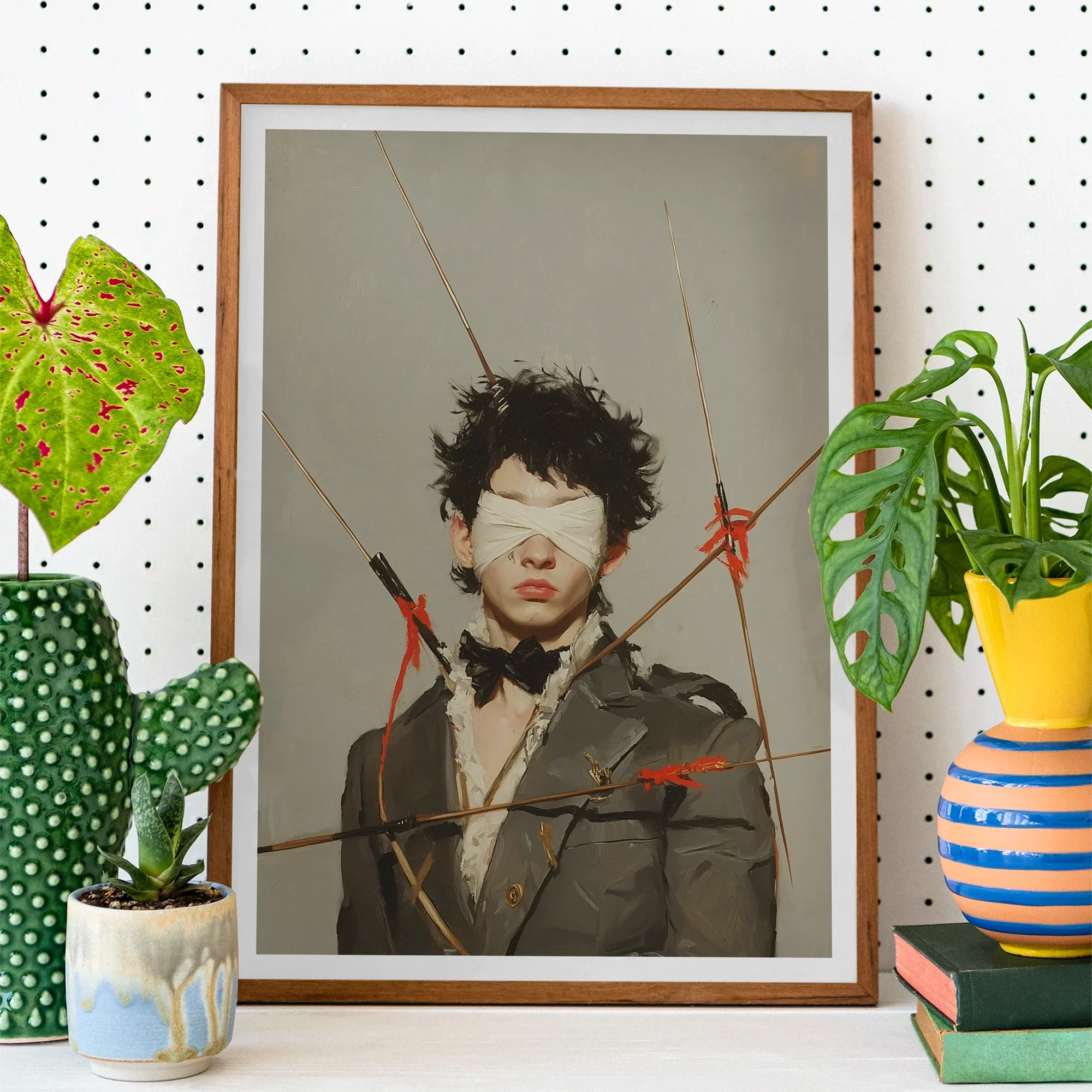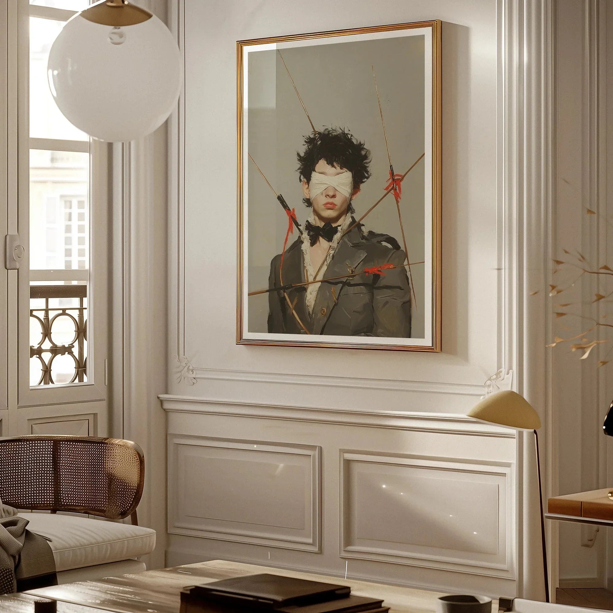 De pijlen zijn ceremonieel, zeker, maar de manier waarop hij ertussen staat—hoofd schuin, heupen scheef—herinterpreteert hun motief. Geen straf—interpunctie. Scherpe decoraties voor een stijlmoordenaar. Met elke rode draad als een afluisterapparaat naar zijn ziel. Elke pijl: een gerucht geformaliseerd.