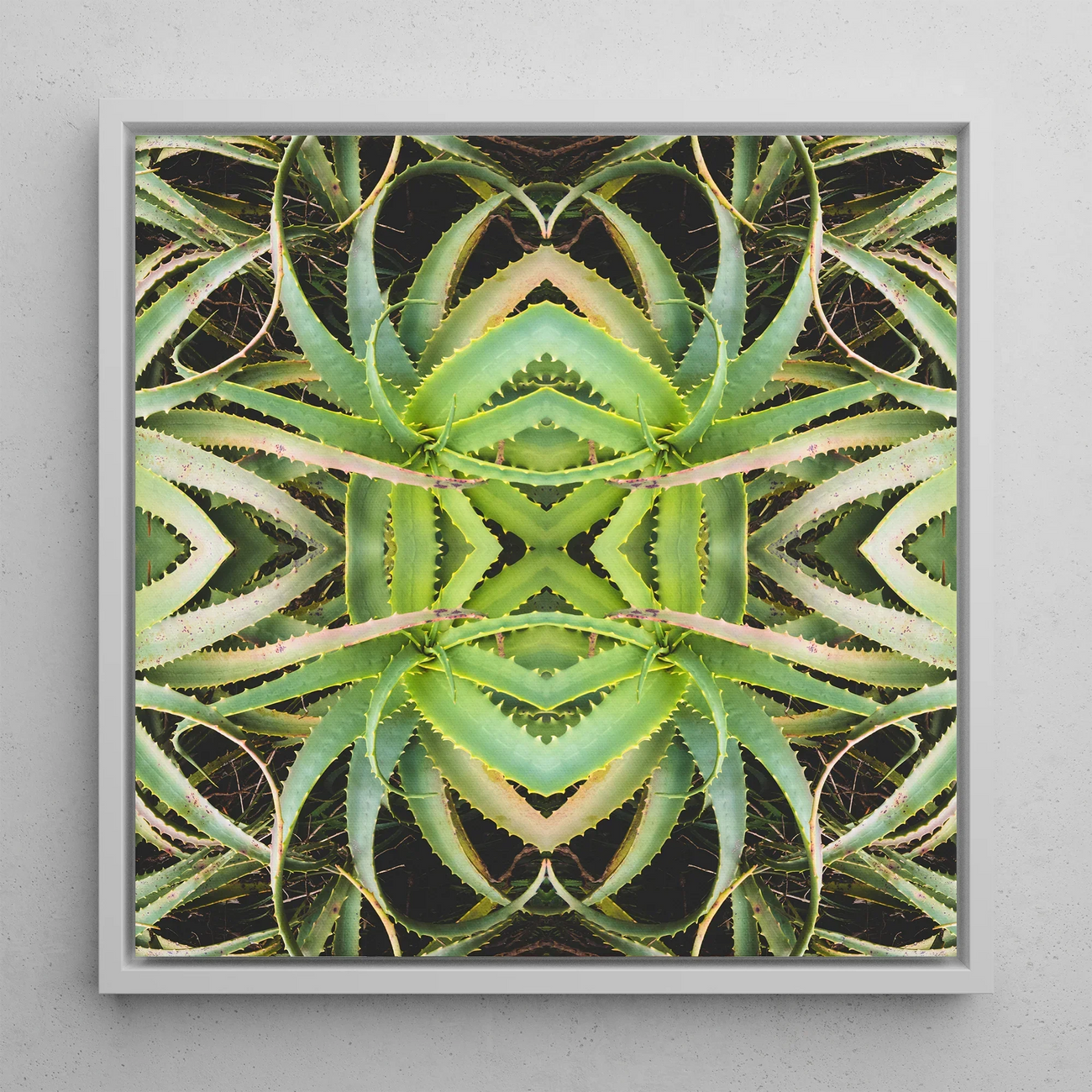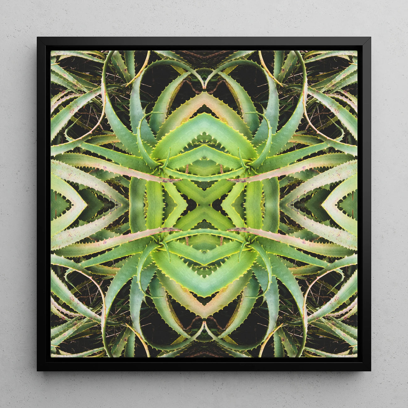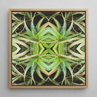 Dit is niet slechts botanische kunst - het is een psychedelische verkenning van de fractale ontwerpen van de natuur. De gespiegelde aloëbladen stralen naar buiten en vormen concentrische ringen van de stekelige pracht. Je ontdekt nieuwe details bij elke kijk: kleine doornen, subtiele gradiënten en het samenspel van licht en schaduw. Het slanke zwarte frame biedt een opvallend contrast, waardoor de levendige greens knallen.