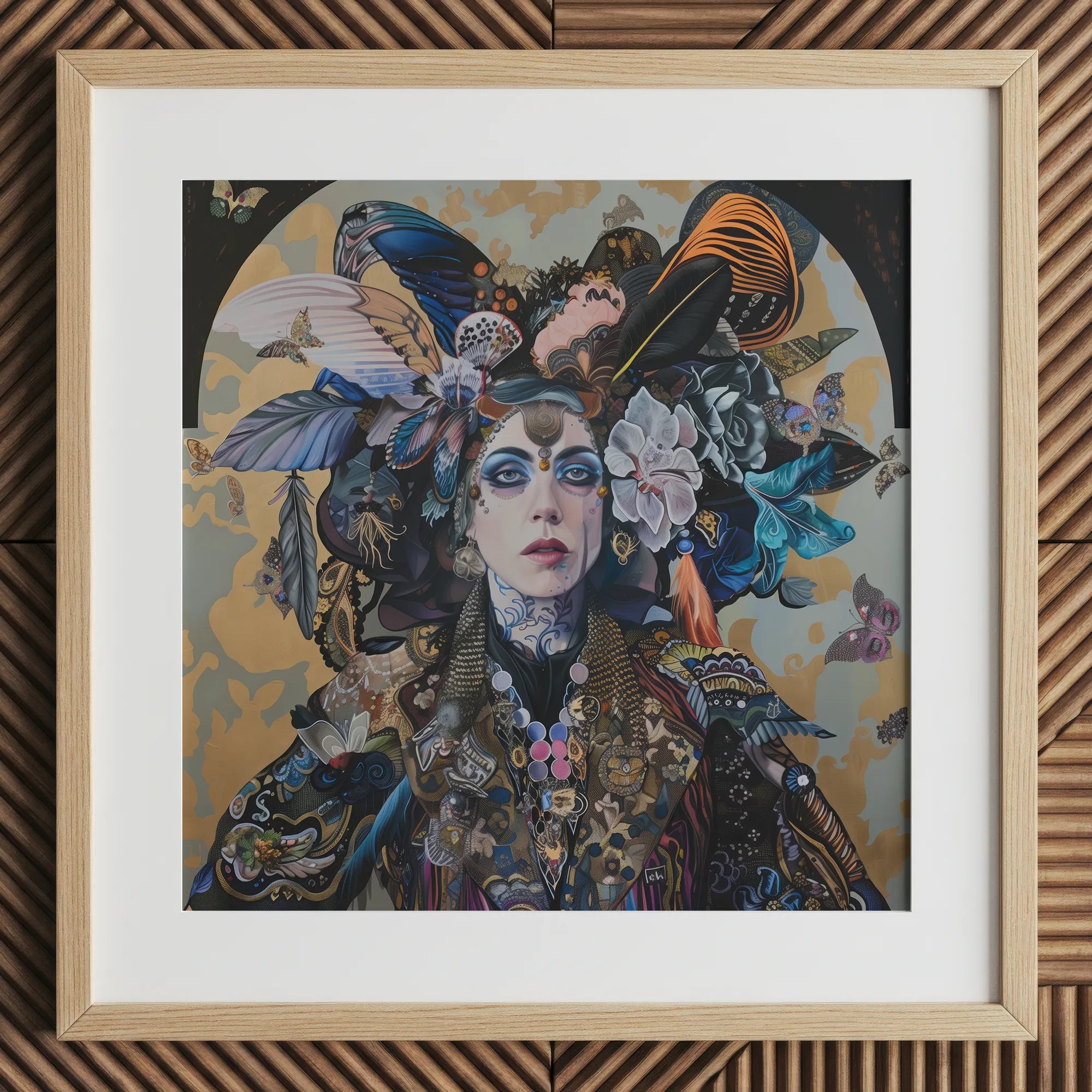 Je staat op de drempel, starend in de surrealistische wereld van de Hierophant. Haar aanwezigheid eist je aandacht op—omringd door vlindervleugels, hoofd gekroond in een uitbarsting van levendige bloemen en cryptische veren. Gewaden beladen met ingewikkelde patronen, die verhalen weven van wet en rebellie, traditie en transformatie.