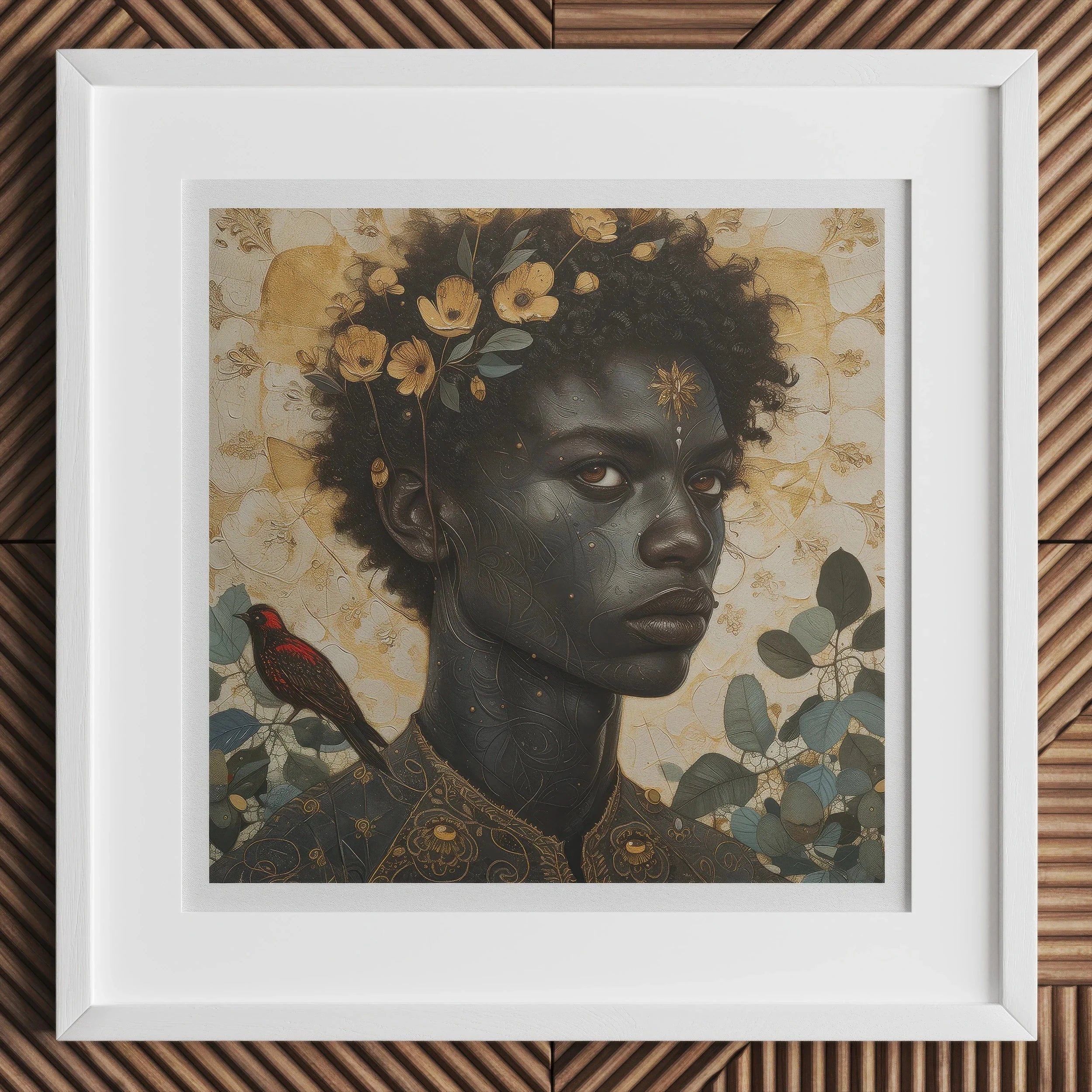 Bloemen bloeien uit hun haar, niet als versiering, maar als getuigenis. Wild en ongehoorzaam, wortelen ze zich in goddelijkheid, bewijs dat schoonheid en veerkracht hetzelfde zijn. Het goud op hun voorhoofd pulseert als een begraven zon, als een kracht die te groot is om te dimmen. En dan, de vogel—een figuur van stille uitdaging. Roodgevederd, waakzaam, gezeten op de drempel tussen gezien en ongezien. Een getuige. Een metgezel. Een spiegel.