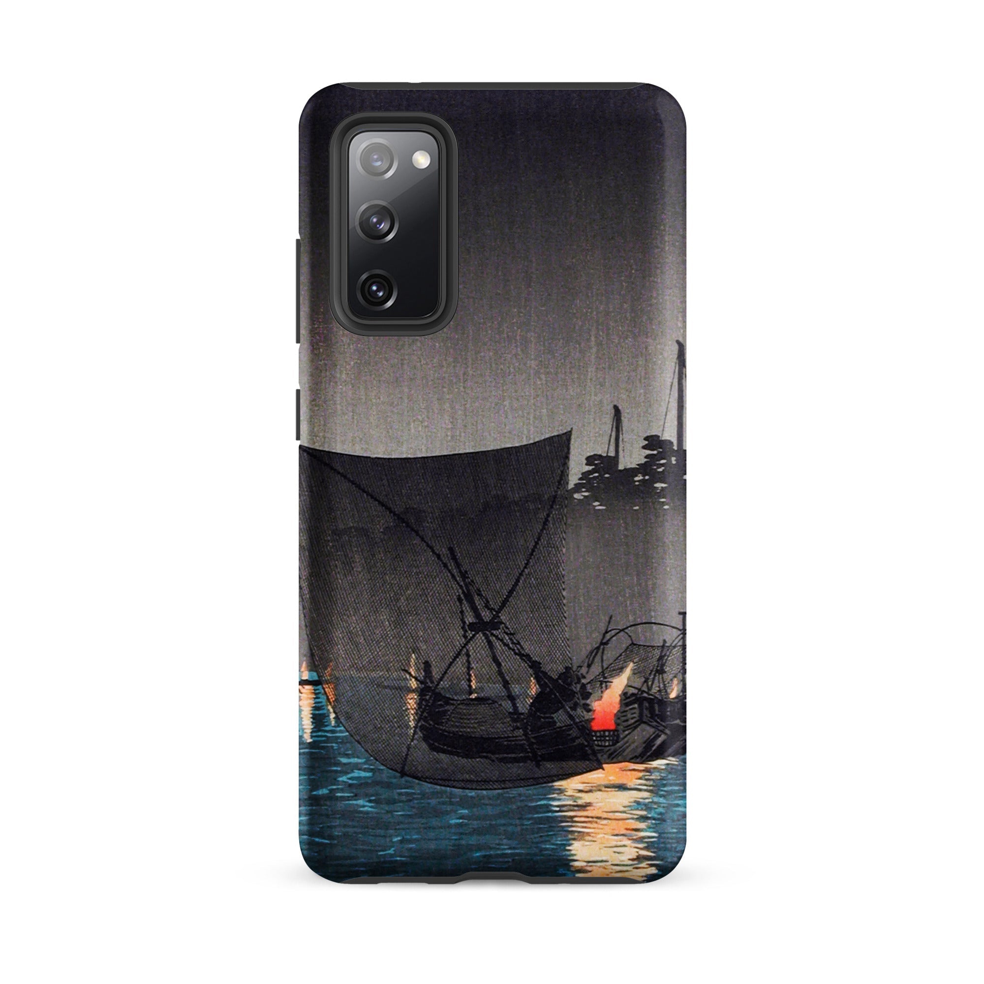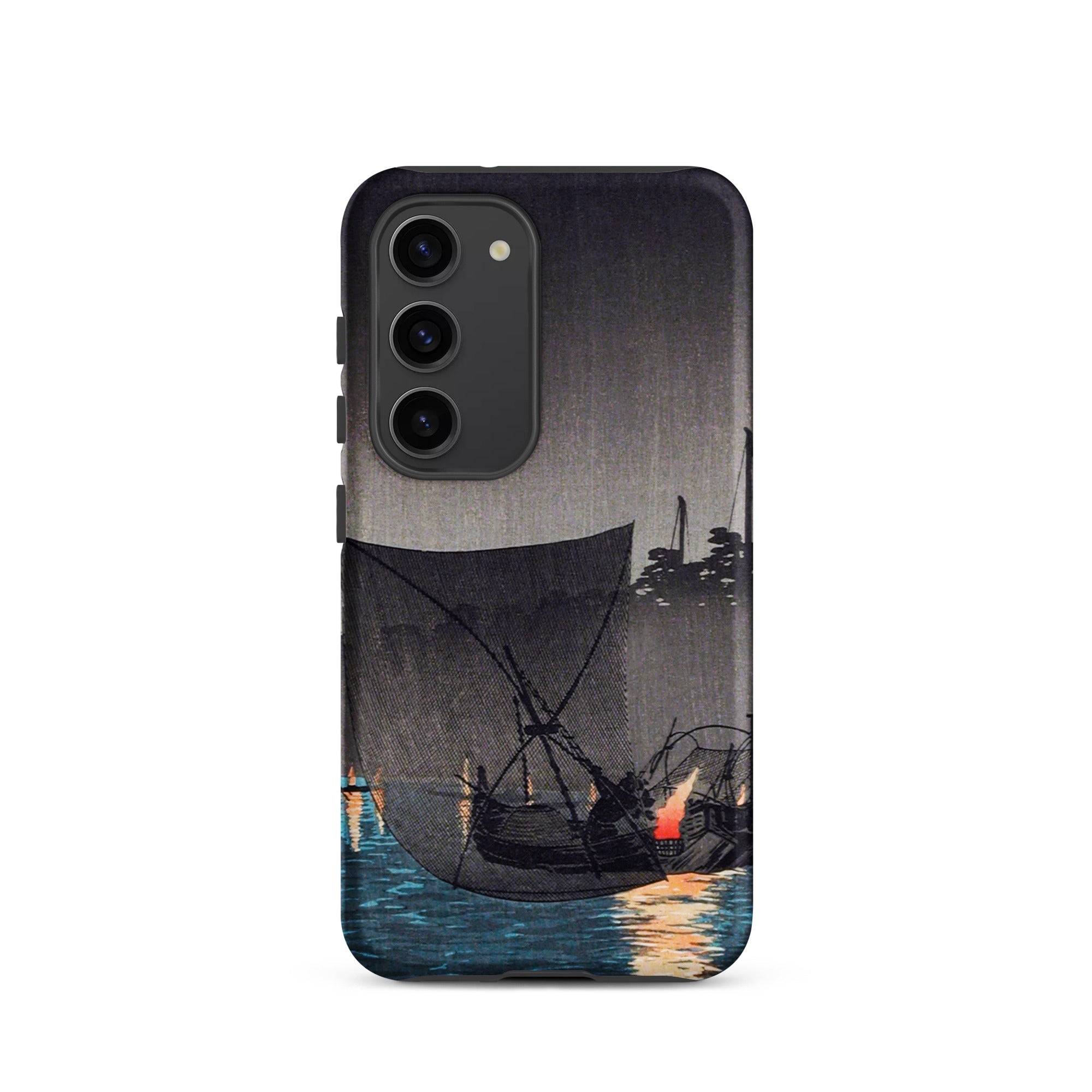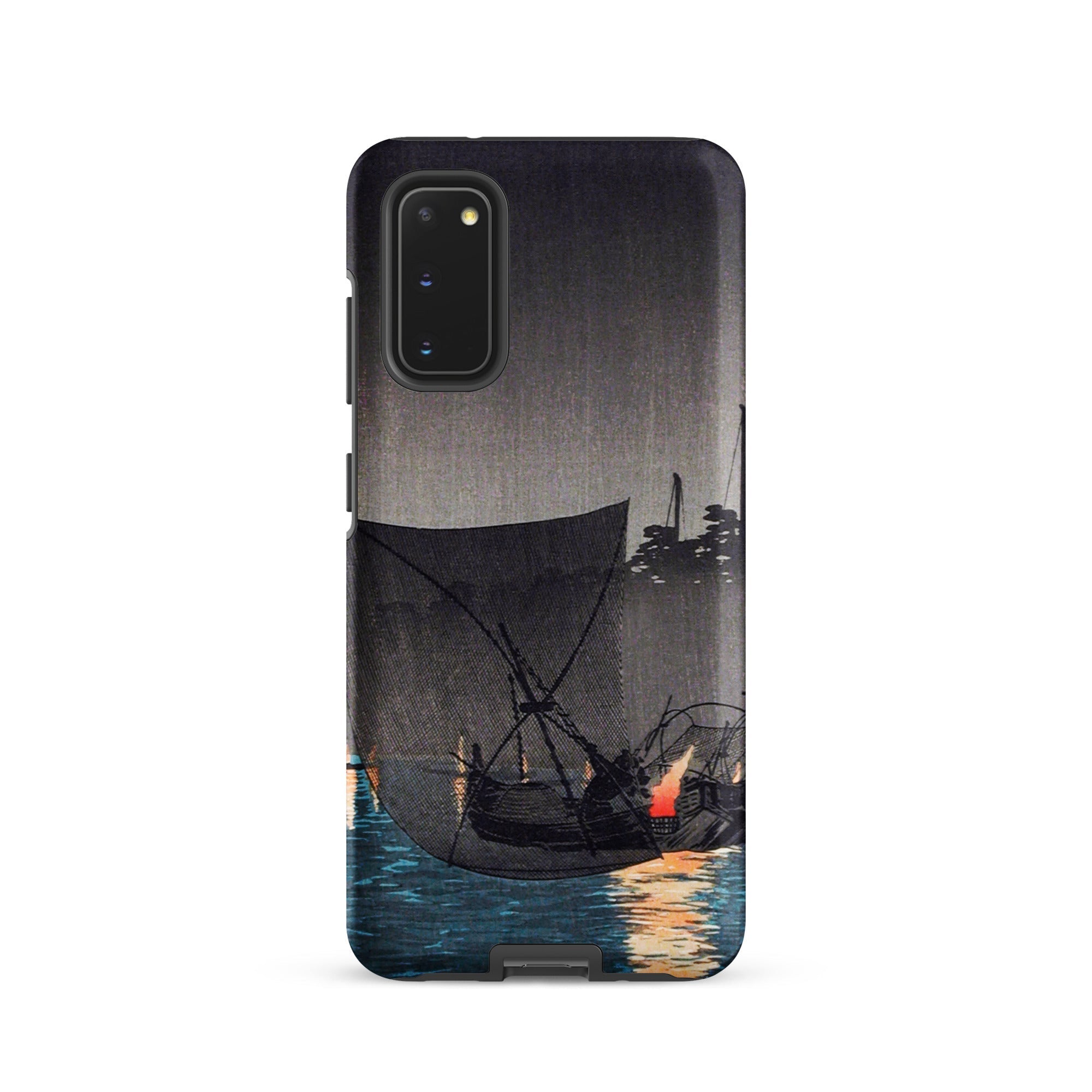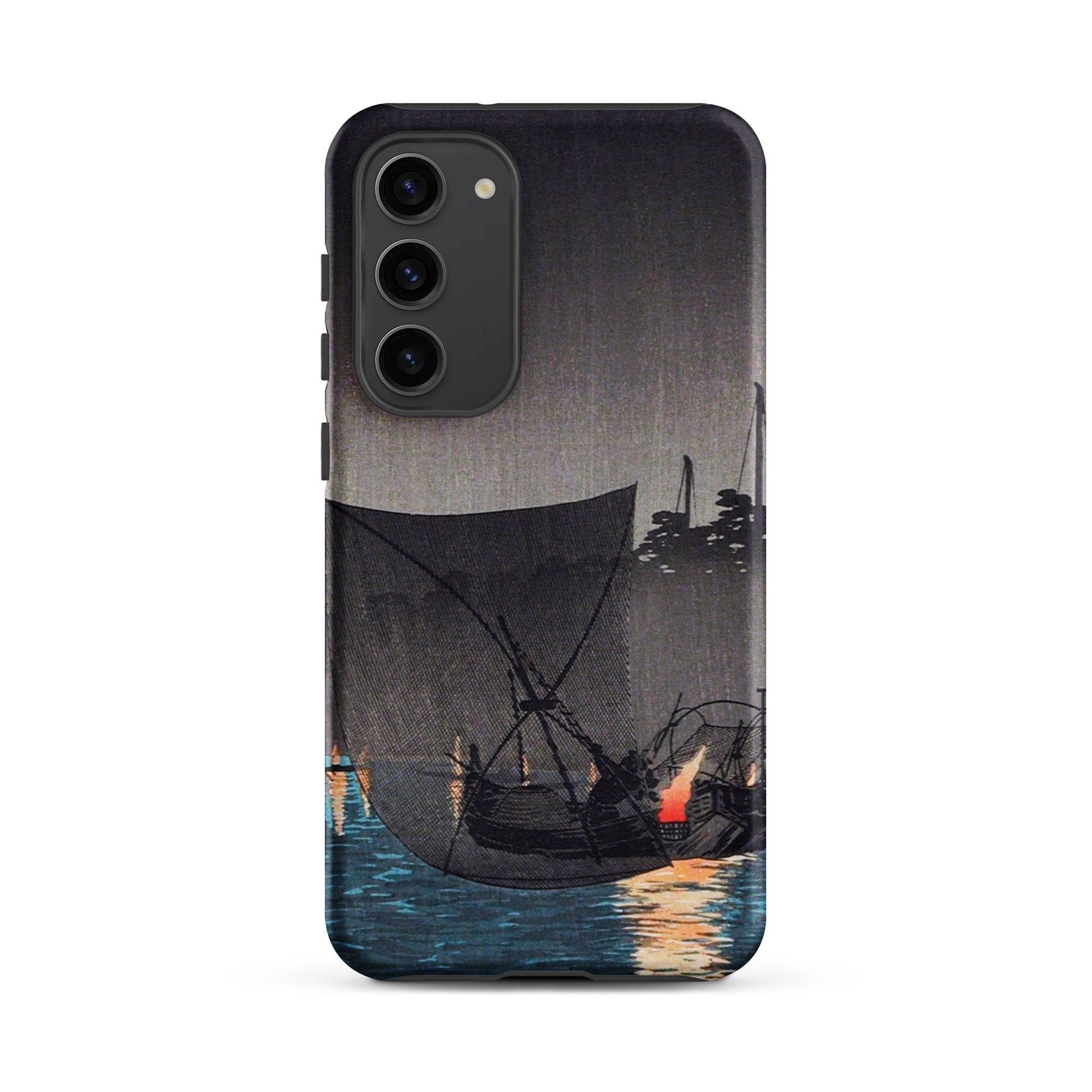 Een scène van handel en ritueel, waar nachtelijk vissen met fakkels een dans werd tussen werk en kunst. Deze Samsung-hoes draagt dezelfde ingetogen elegantie, een draagbaar eerbetoon aan de gouden eeuw van de Japanse prentkunst.
