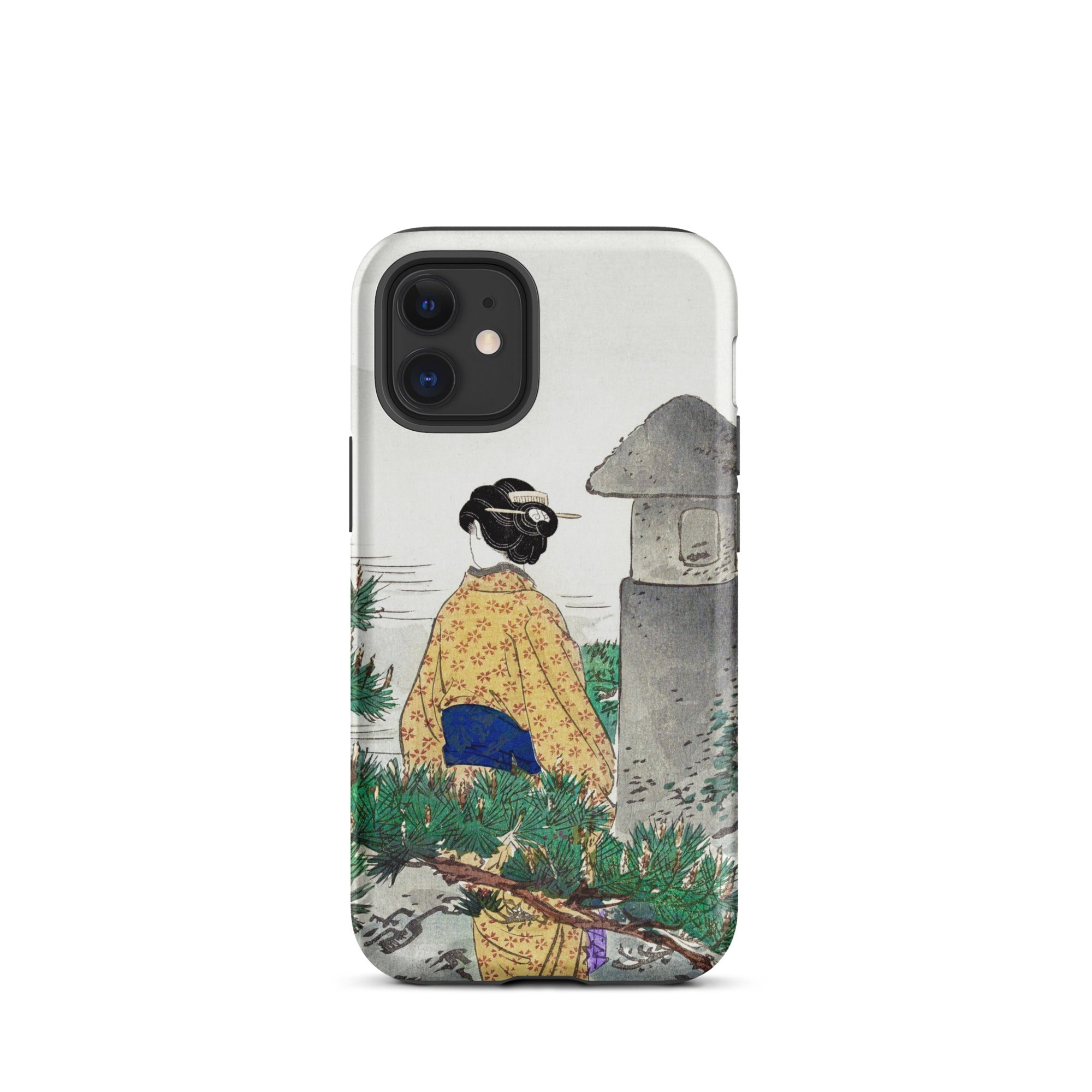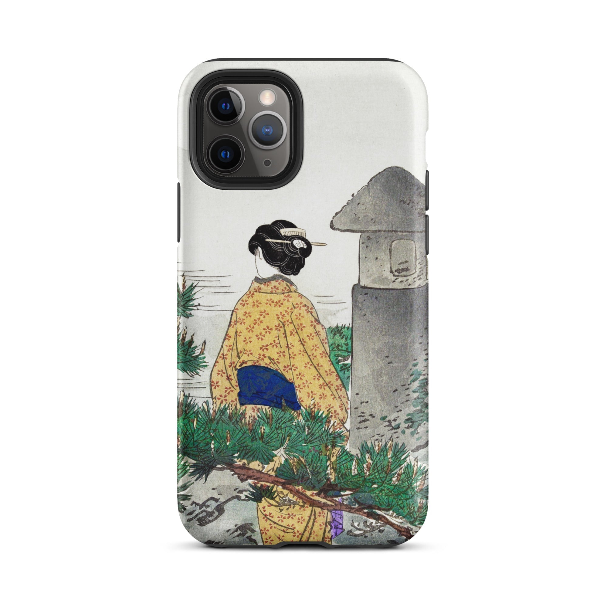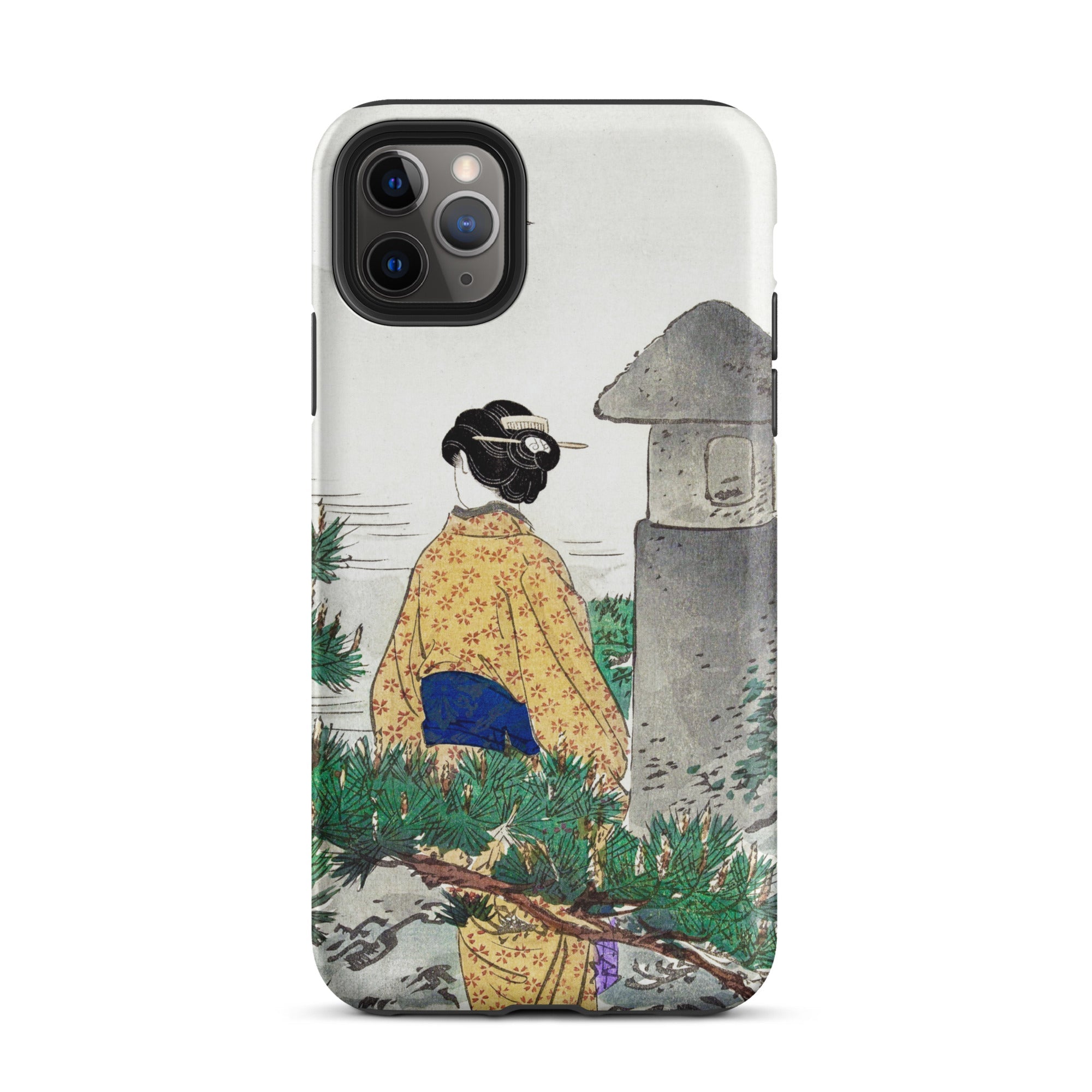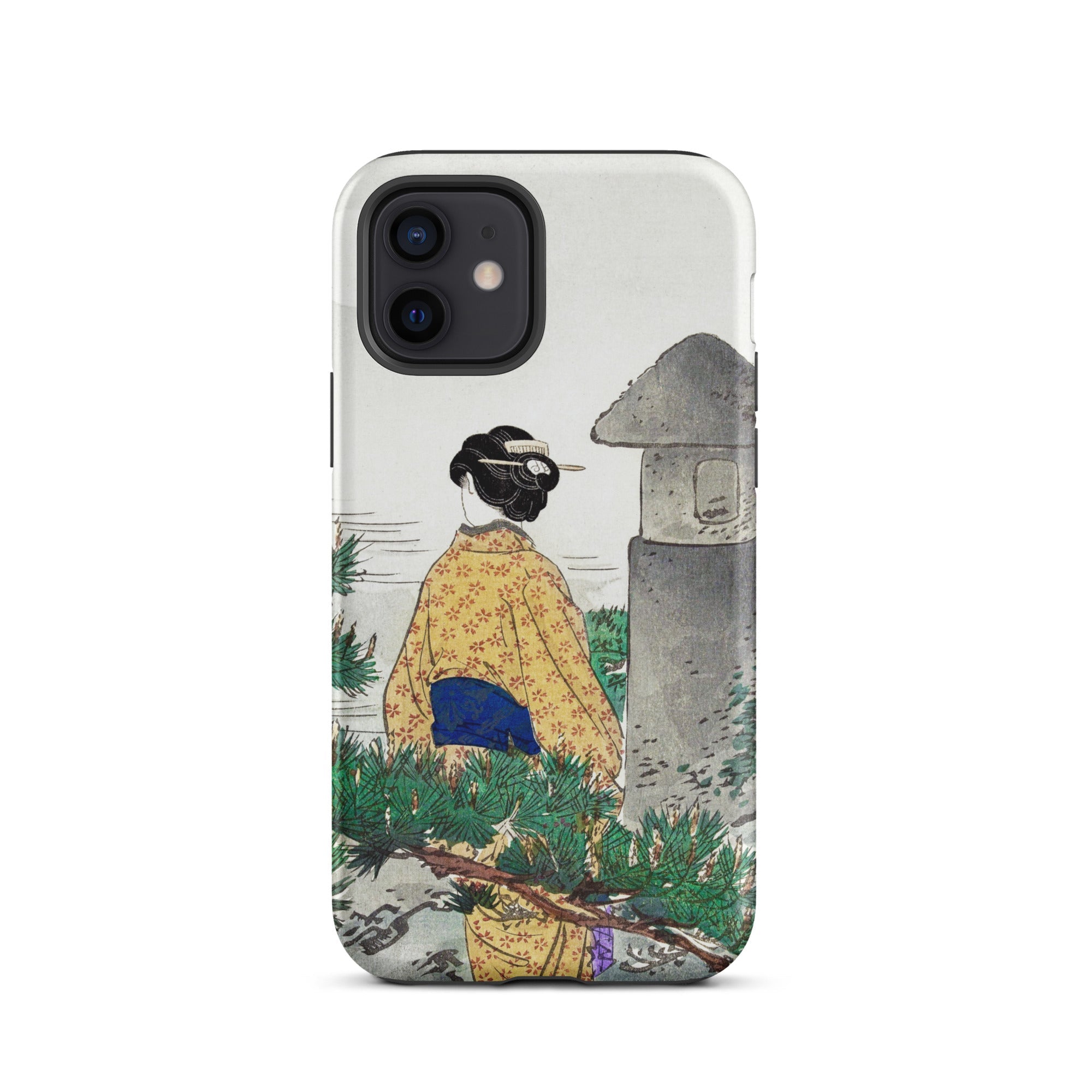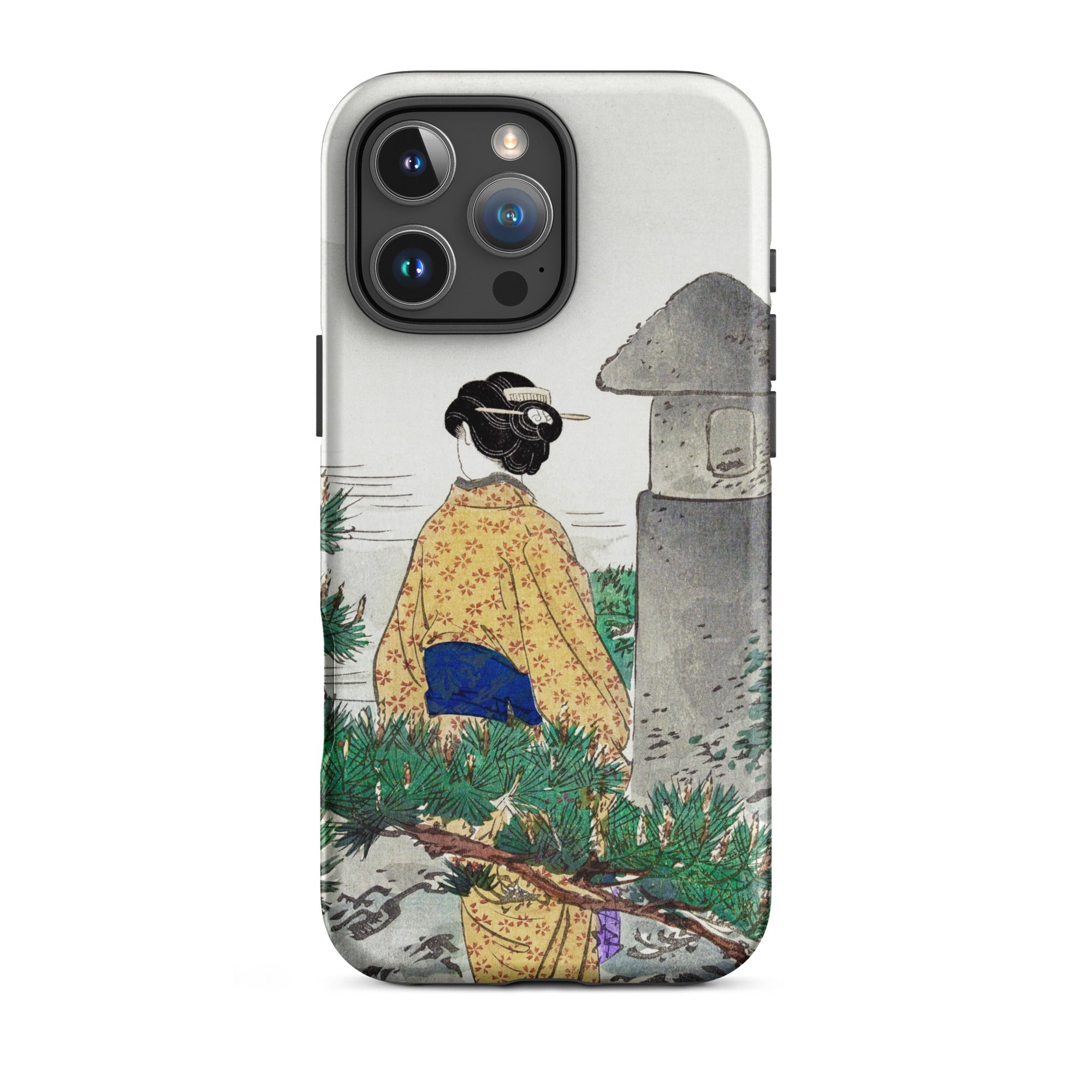 Je wordt met deze prachtige Ogata Gekko naar een serene maanverlichte tuin getransporteerd iPhone geval. Het lichtgevende ontwerp legt het contemplatieve moment van een geisha vast voor een stenen lantaarn, haar gouden kimono levend met delicate bloemenpatronen.