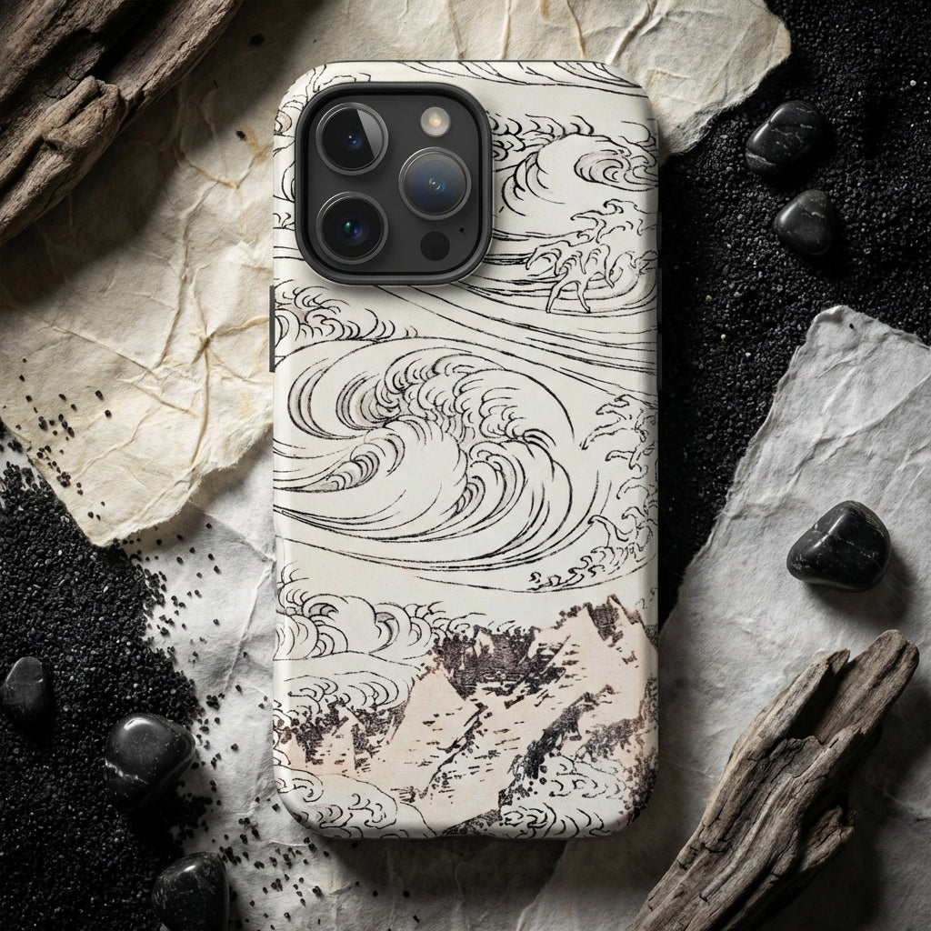 Op deze iPhone-hoes is de kustlijn geen toevluchtsoord. Het barst in perzikgekleurde platen—bijna vlees, bijna klif—gegraveerd met haastige, spookachtige lijnen. De golven komen niet in sets maar in spreuken, elke kromme tentakel wijst op krachten ouder dan de maan. Er is geen blauw. Geen kalmte. Alleen de rand van het papier en de geometrie van onrust.