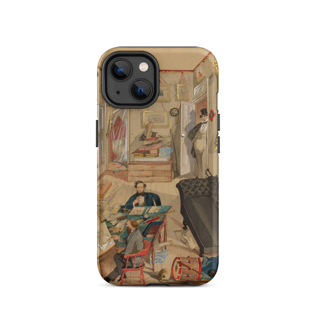 De surrealistische humor van deze antieke illustratie weerspiegelt het koortsachtige creatieve proces zelf—boeken die wankel gestapeld zijn als onvoltooide ideeën, een weggegooide trommel die fluistert van vergeten ritme, een schedel die vanaf de vloer gluurt als een memento mori van artistieke obsessie. Deze hoes is geen gewoon accessoire; het is een draagbare galerie van satirische kunstgeschiedenis, een tastbaar relikwie van 19e-eeuwse illustratie, literaire excentriciteit en vintage printontwerp. Draag de echo's van de Romantiek, de puls van esthetische wanorde en de humor van artistieke chaos—alles in de palm van je hand.