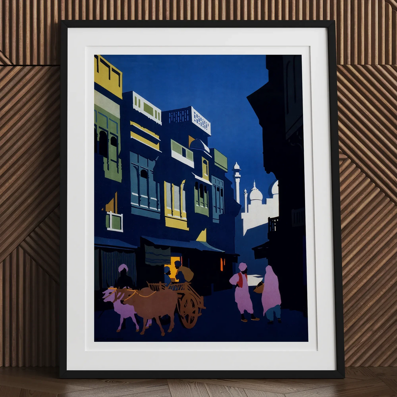 Beneath a cobalt moon, this Indian evening exhales into twilight. Where an ox-drawn cart sways between carved archways and Mughal eaves, guiding travelers past sari-colored stalls and lamplit courtyards.