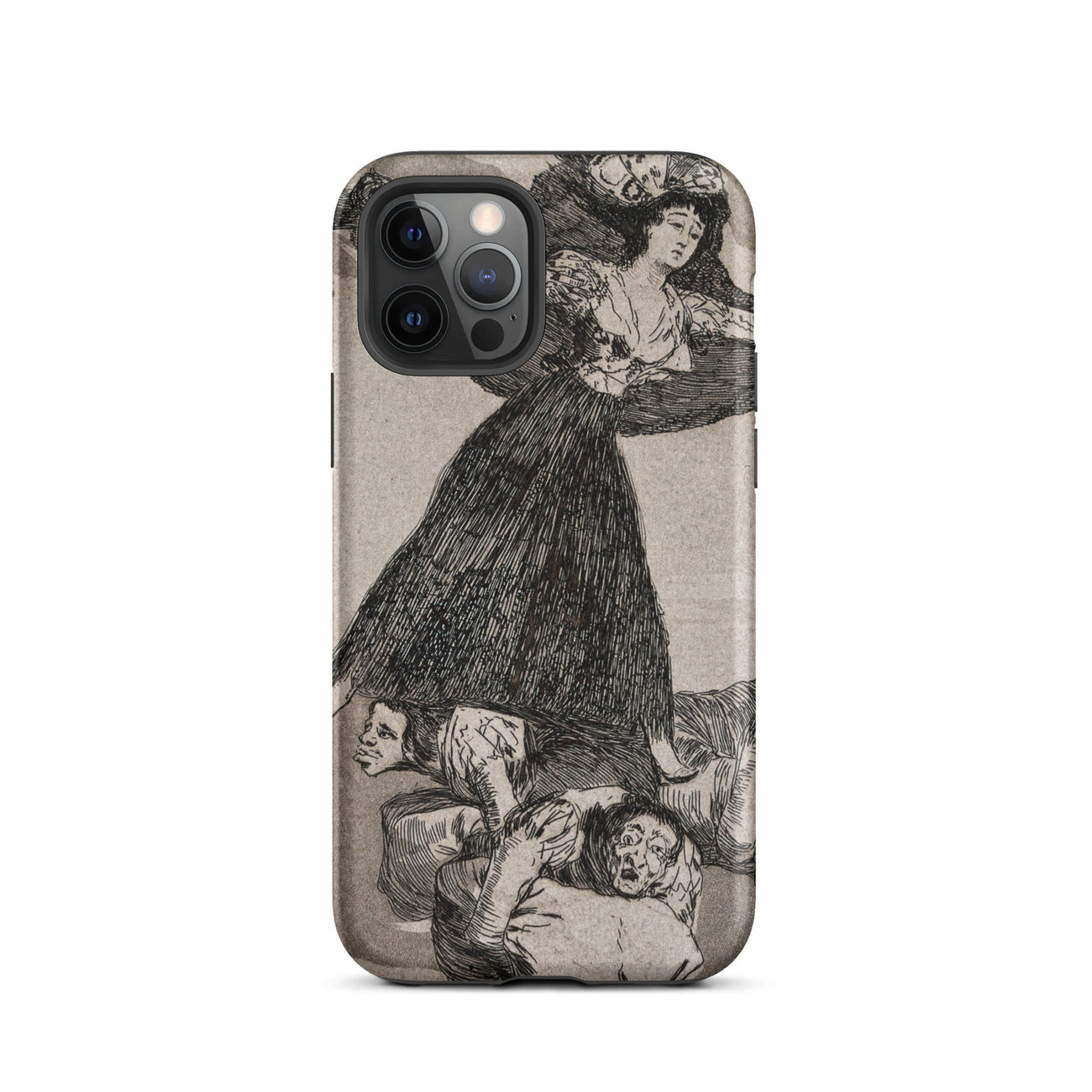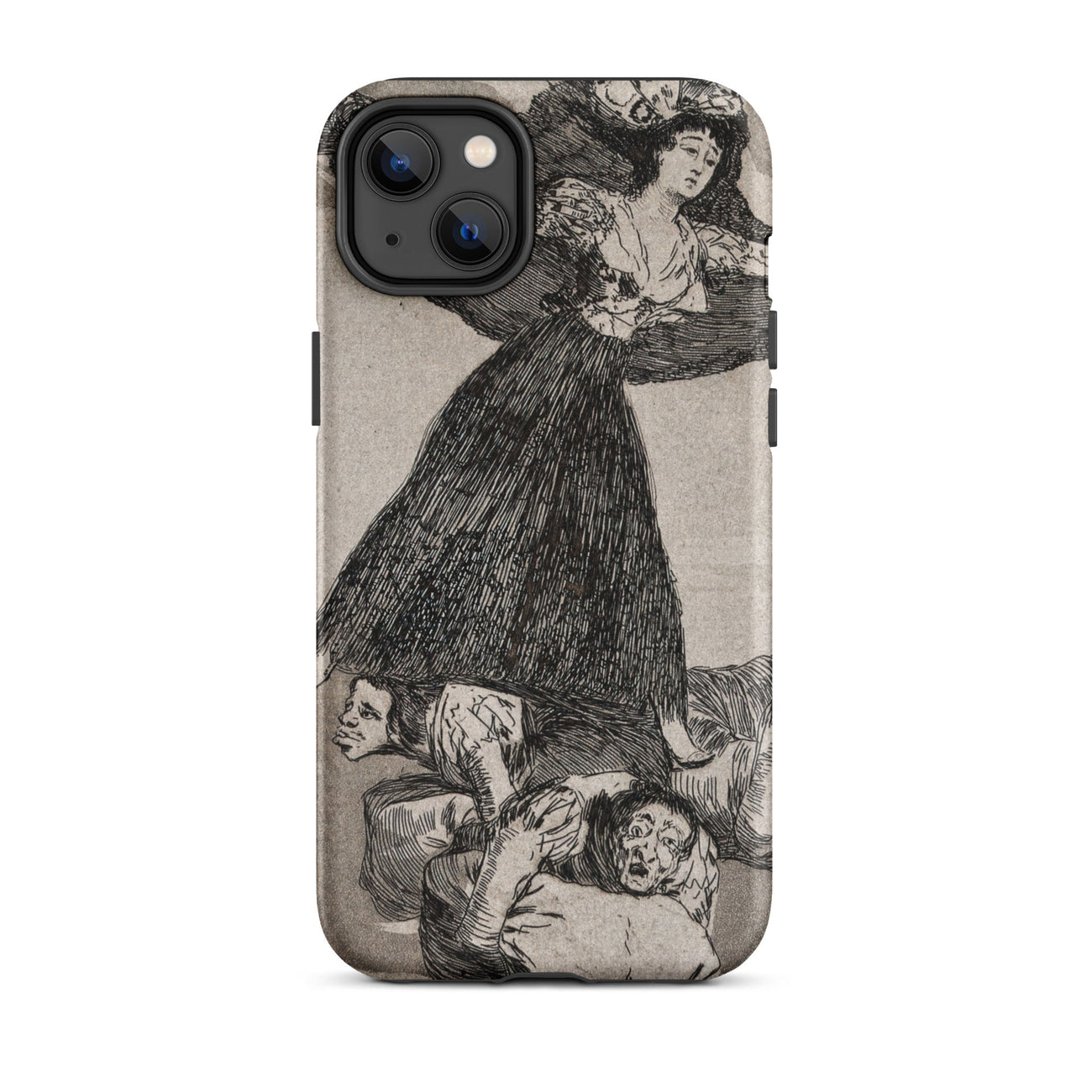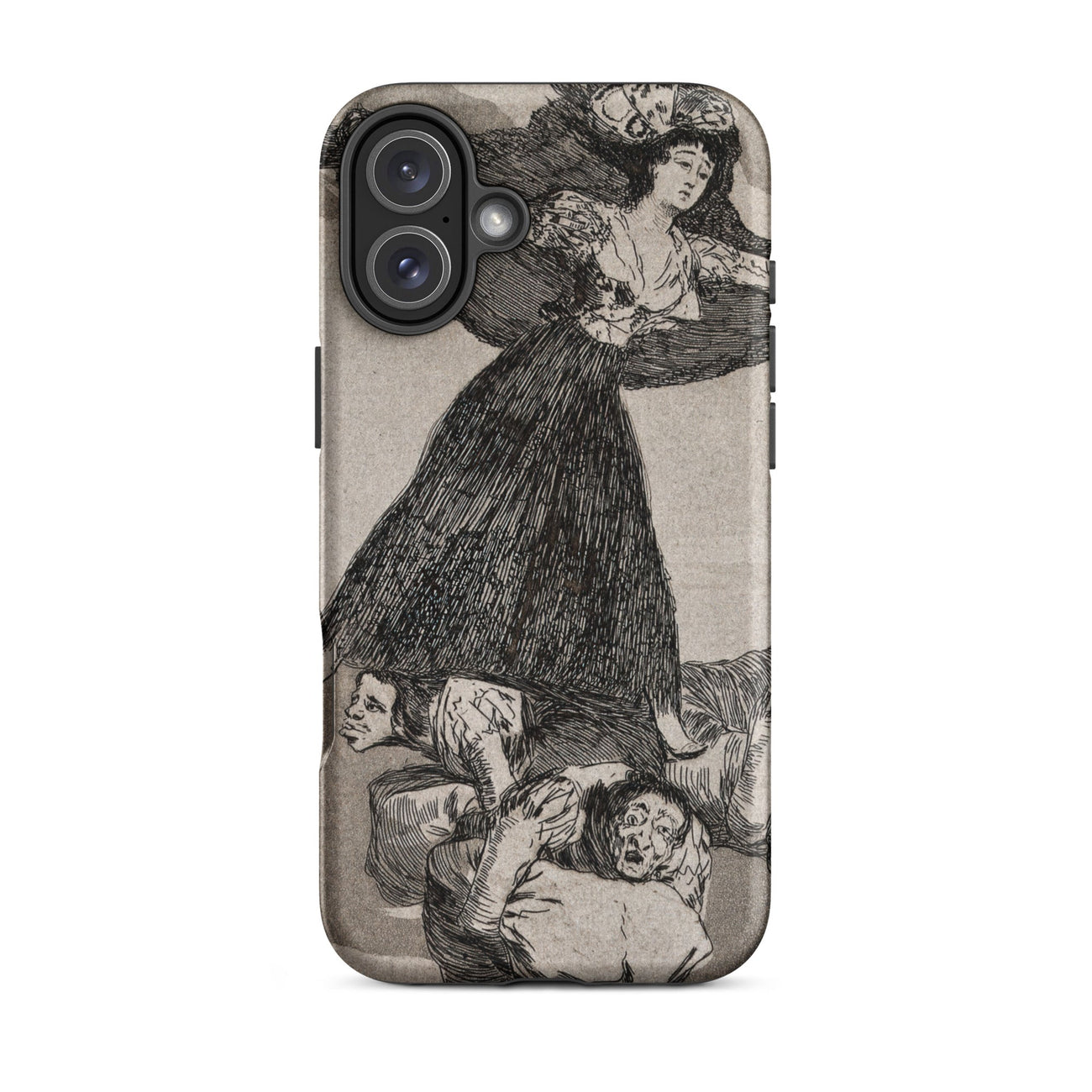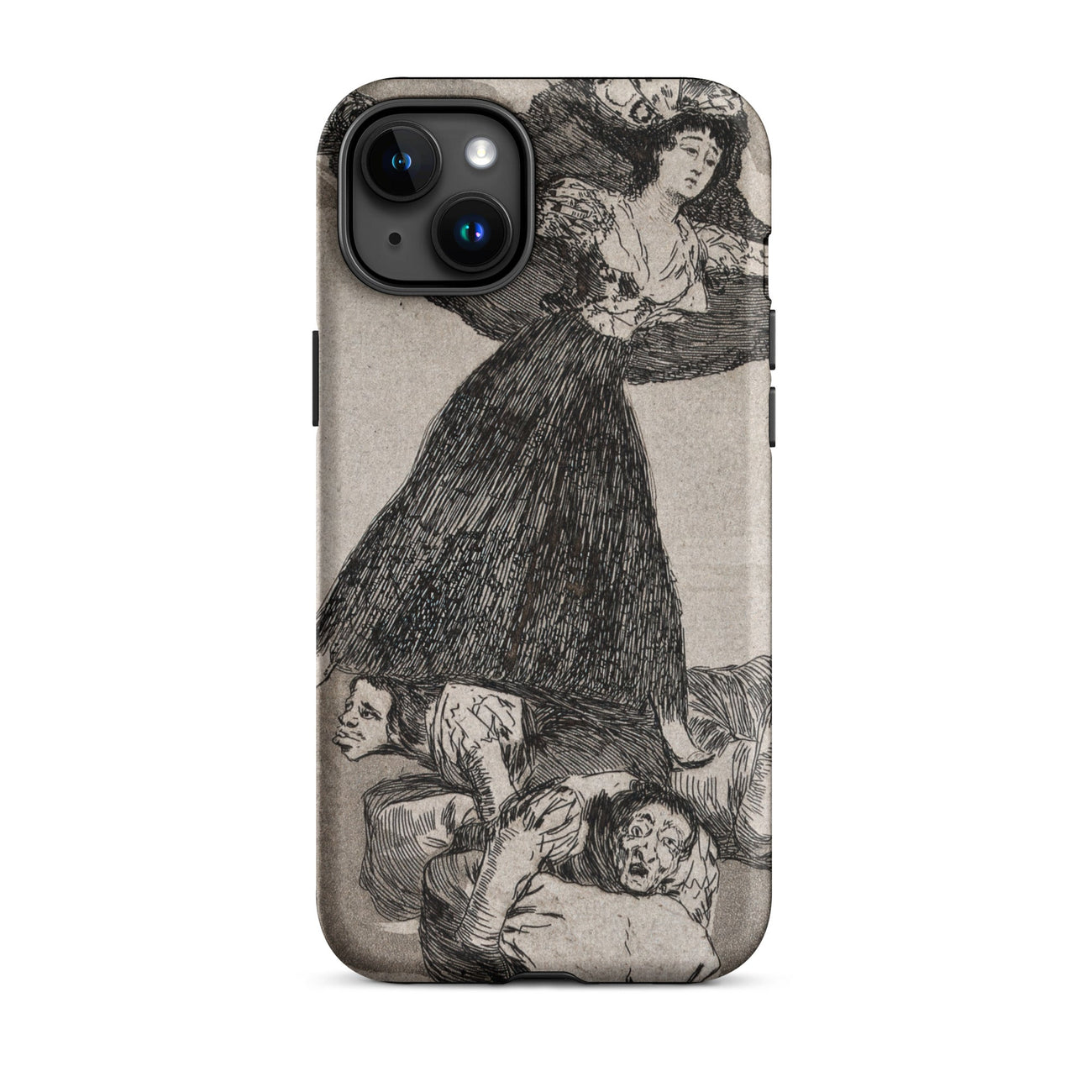 Francisco Goya’s A Young Woman Flying in the Air hurls its heroine above a heap of writhing figures, her dark skirt sweeping like a storm cloud through etched void. The iPhone case renders every cross-hatched incision, each strained gesture, every haunted face beneath her.