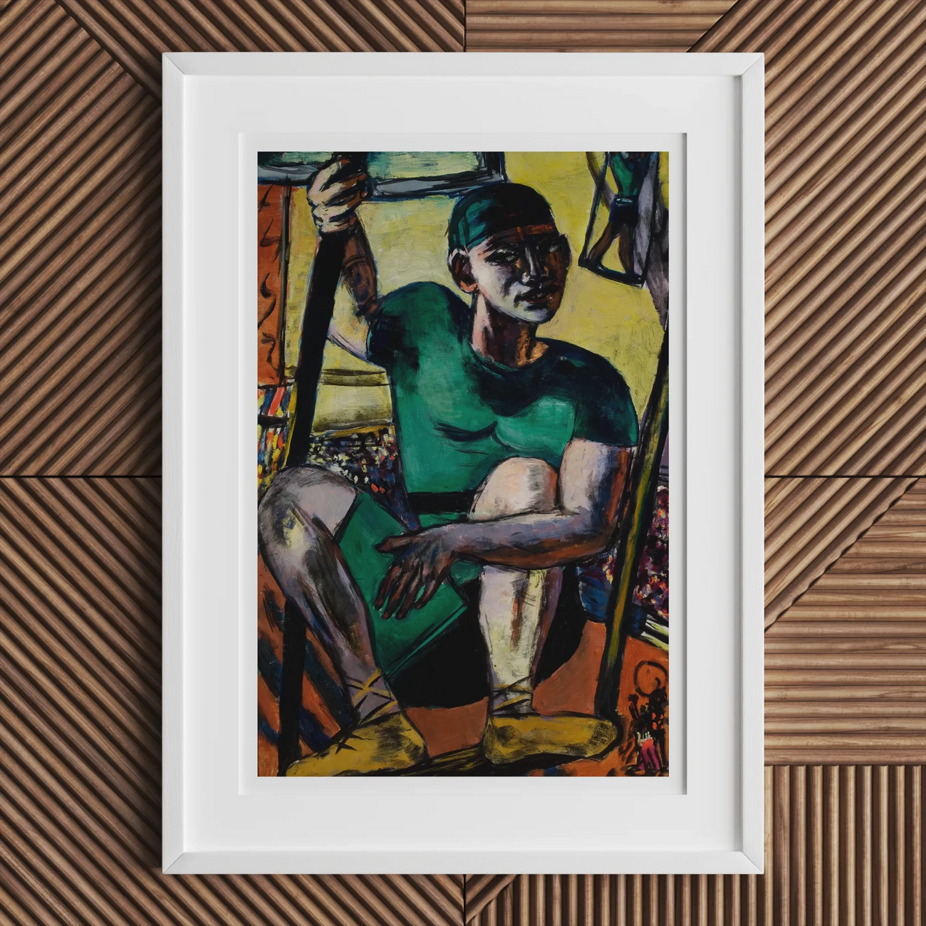 Max Beckmann's Acrobat on the Trapeze embodies the raw energy of German Expressionism, capturing a performer's taut physicality against a vibrant, fractured backdrop. This 1940s oil painting juxtaposes the acrobat's green-clad form with a kaleidoscope of yellow, orange, and blue hues, creating a palpable tension between stillness and motion.