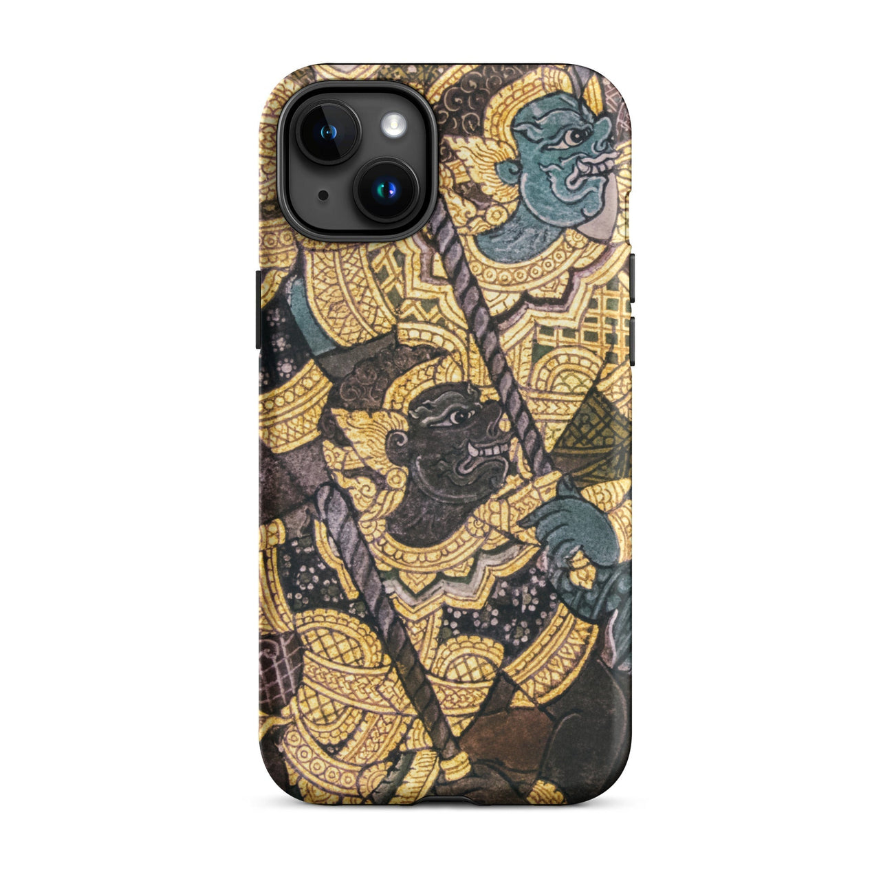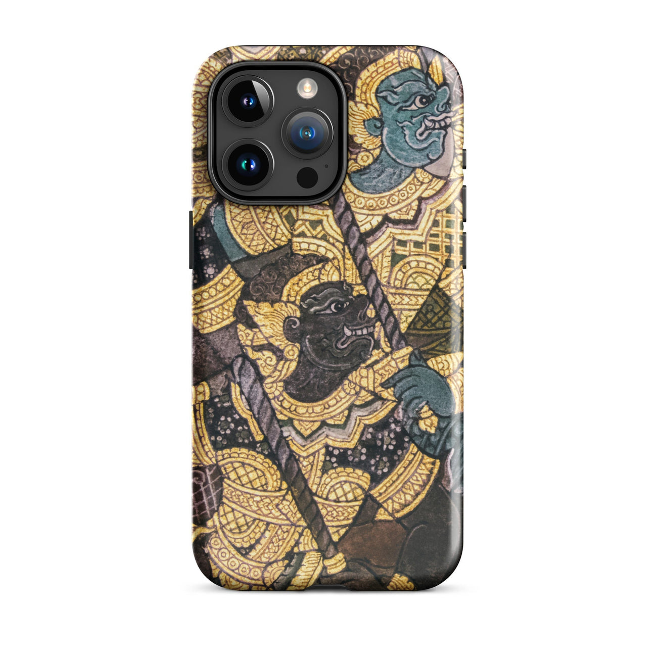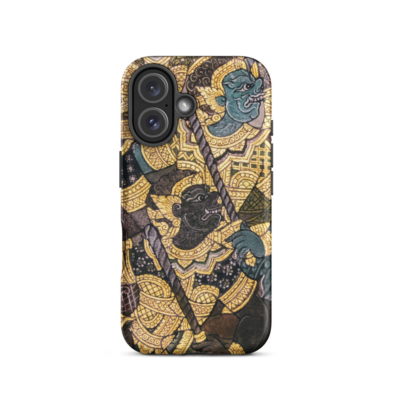 Wrap your iPhone in the mystique of ancient Thai artistry with this case featuring a spellbinding Ramayana battle scene. The fresco, a tour de force of Ayutthaya-era temple painting, explodes with mythological drama. Ochre-skinned warriors, their limbs adorned in shimmering gold leaf, clash spears beneath ornate crowns.