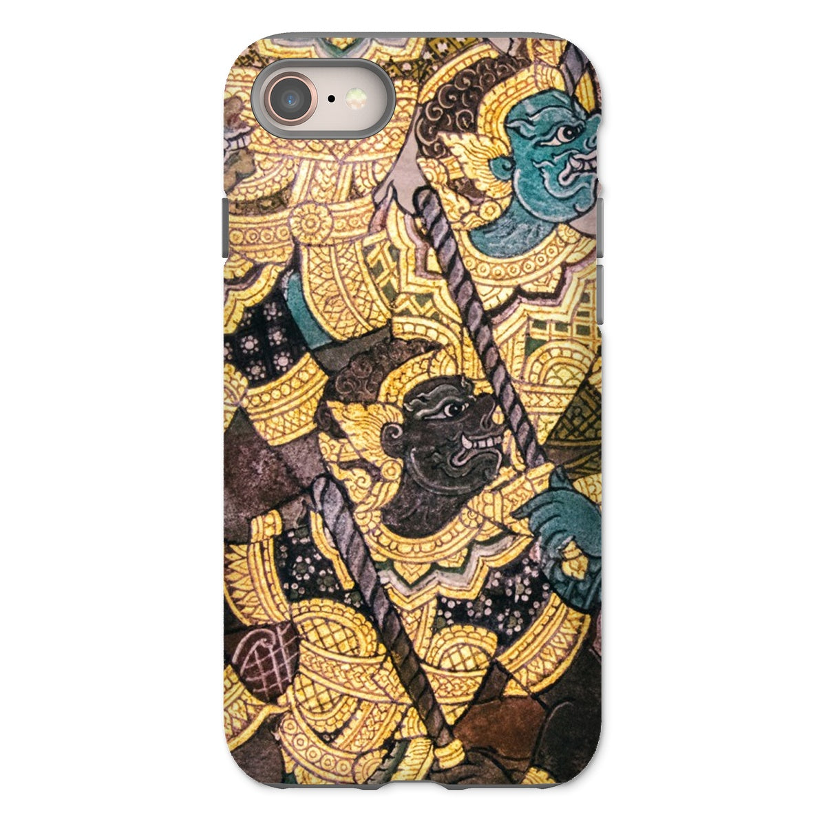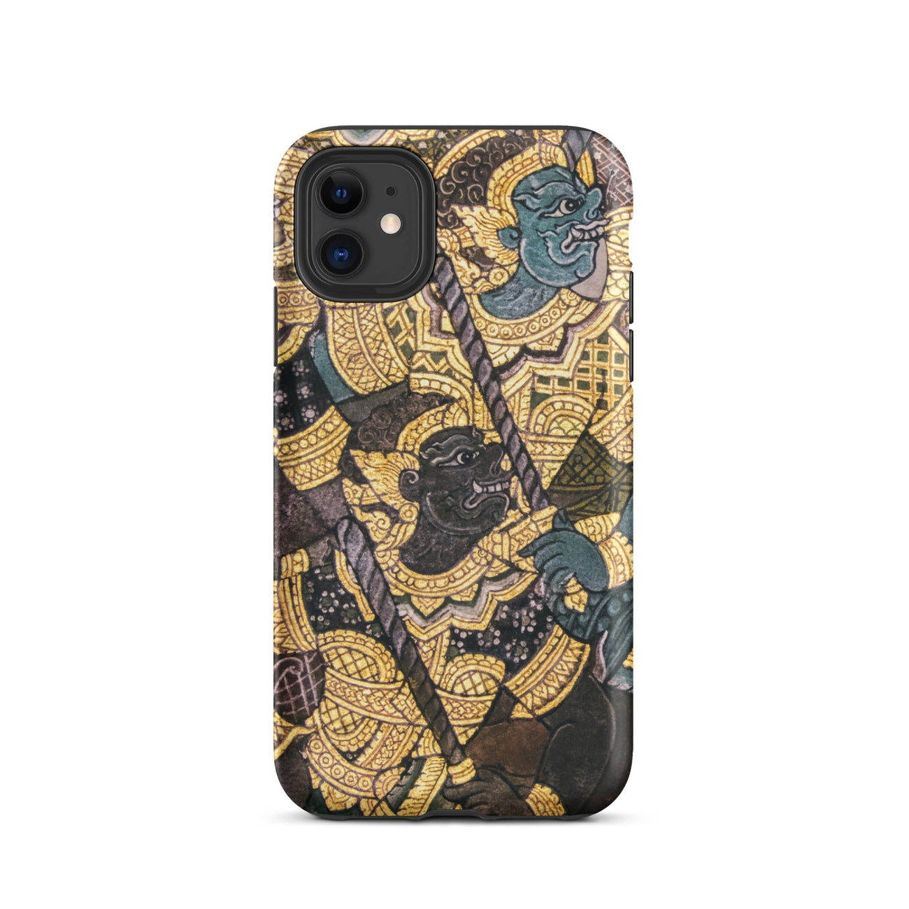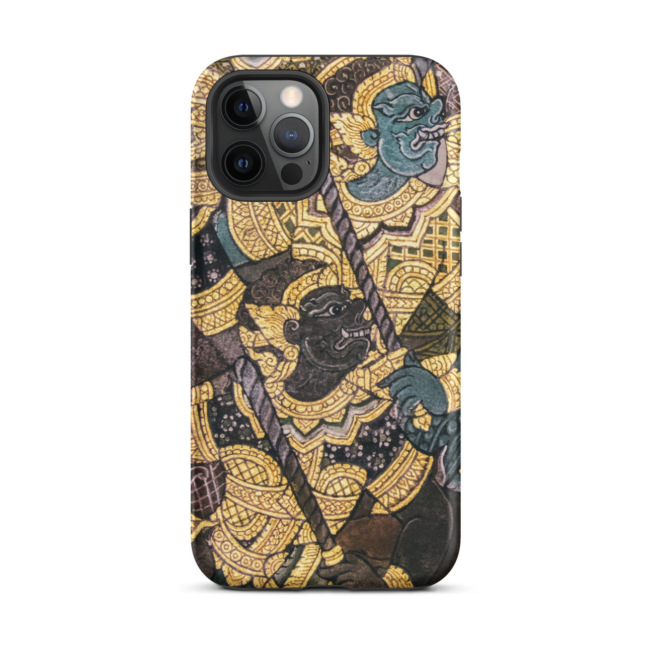 Wrap your iPhone in the mystique of ancient Thai artistry with this case featuring a spellbinding Ramayana battle scene. The fresco, a tour de force of Ayutthaya-era temple painting, explodes with mythological drama. Ochre-skinned warriors, their limbs adorned in shimmering gold leaf, clash spears beneath ornate crowns.