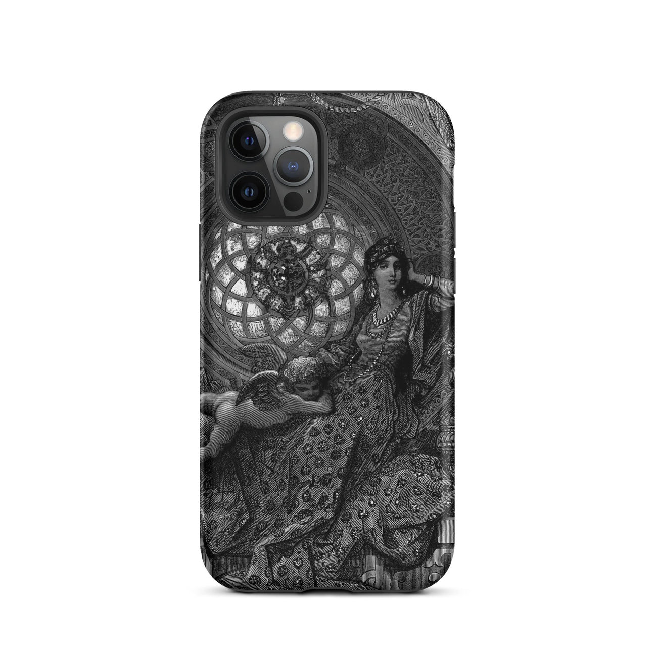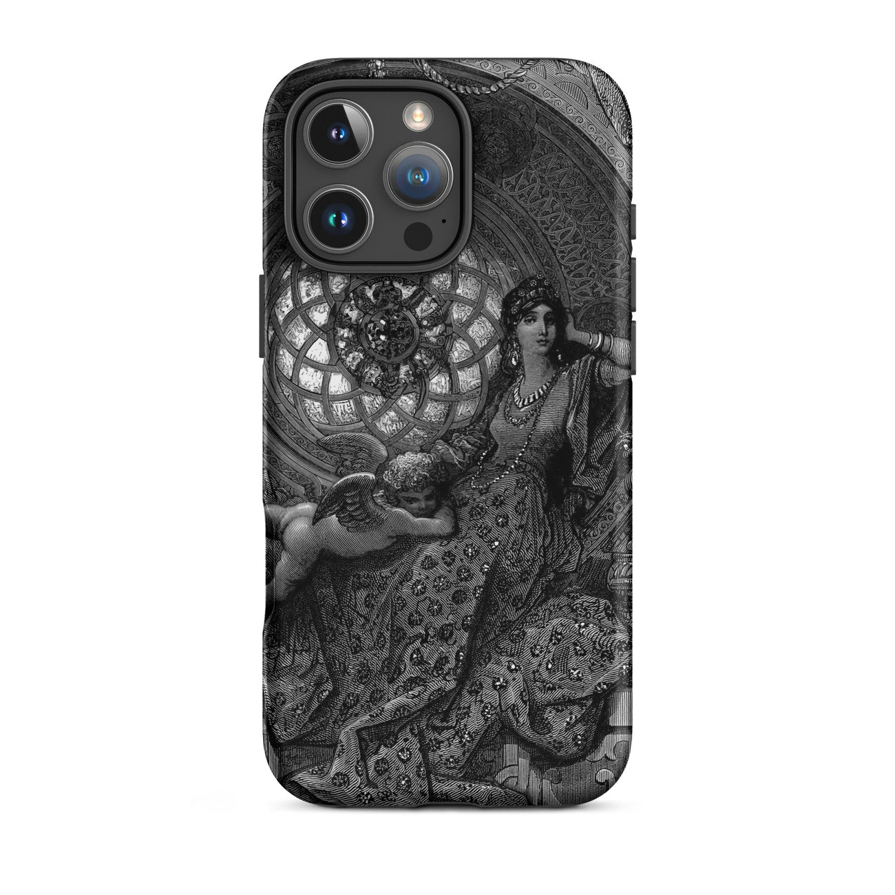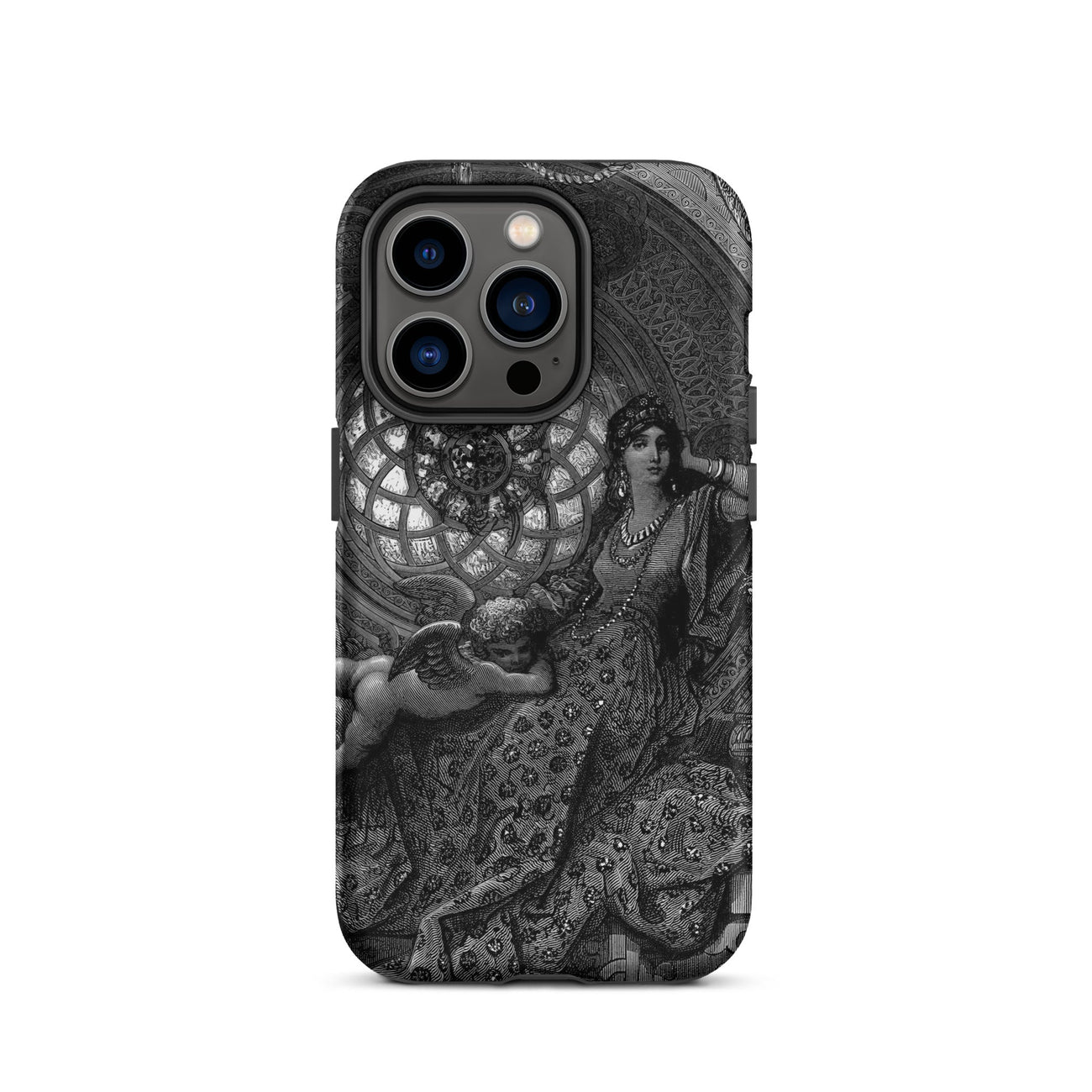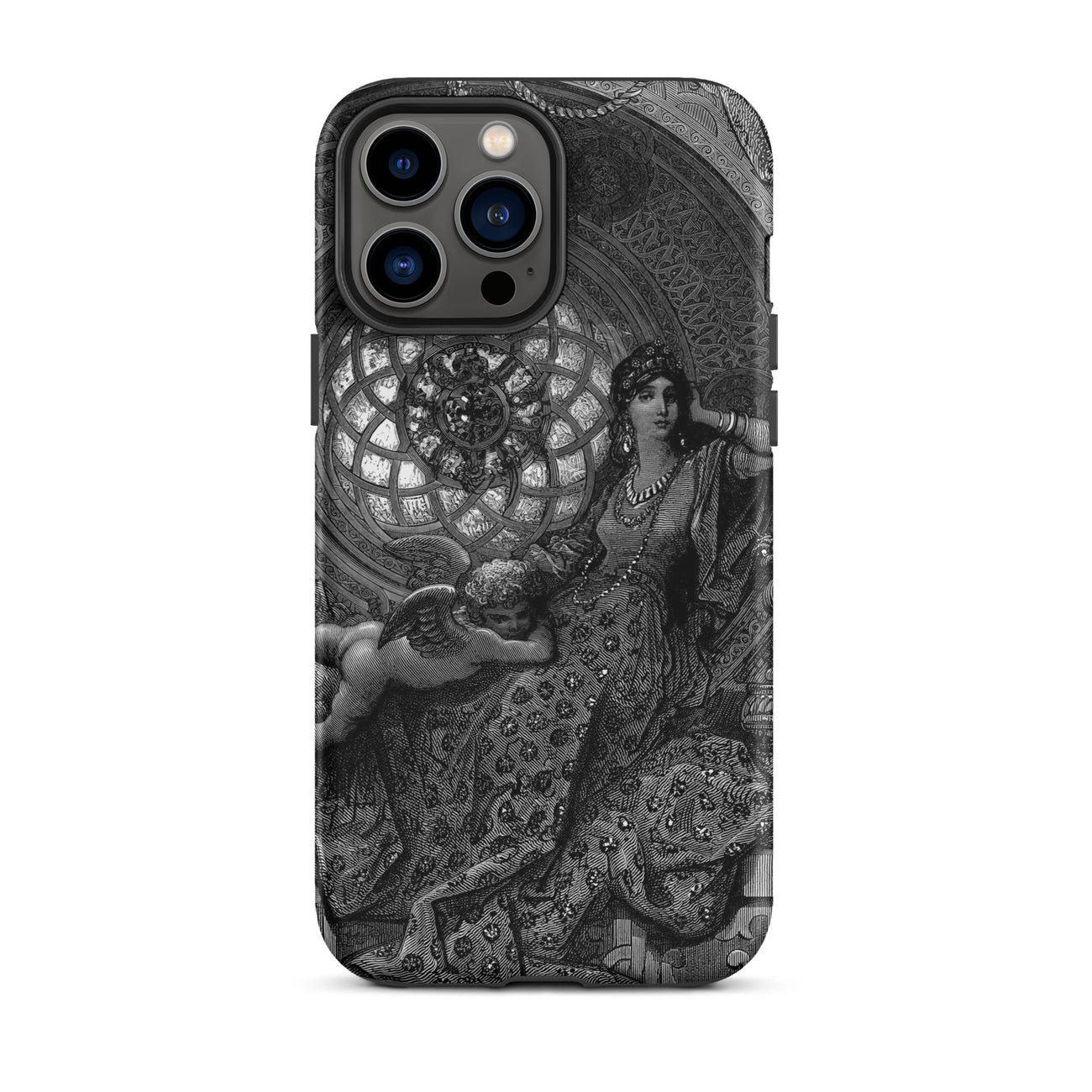 Gustave Doré’s Alcina’s Beauty Overcomes All of Ruggiero’s Misgivings swirls across this iPhone case with hypnotic density. The sorceress reclines beneath an ornate dome, her robe thick with patterned weight, while a winged cherub clings to her side.