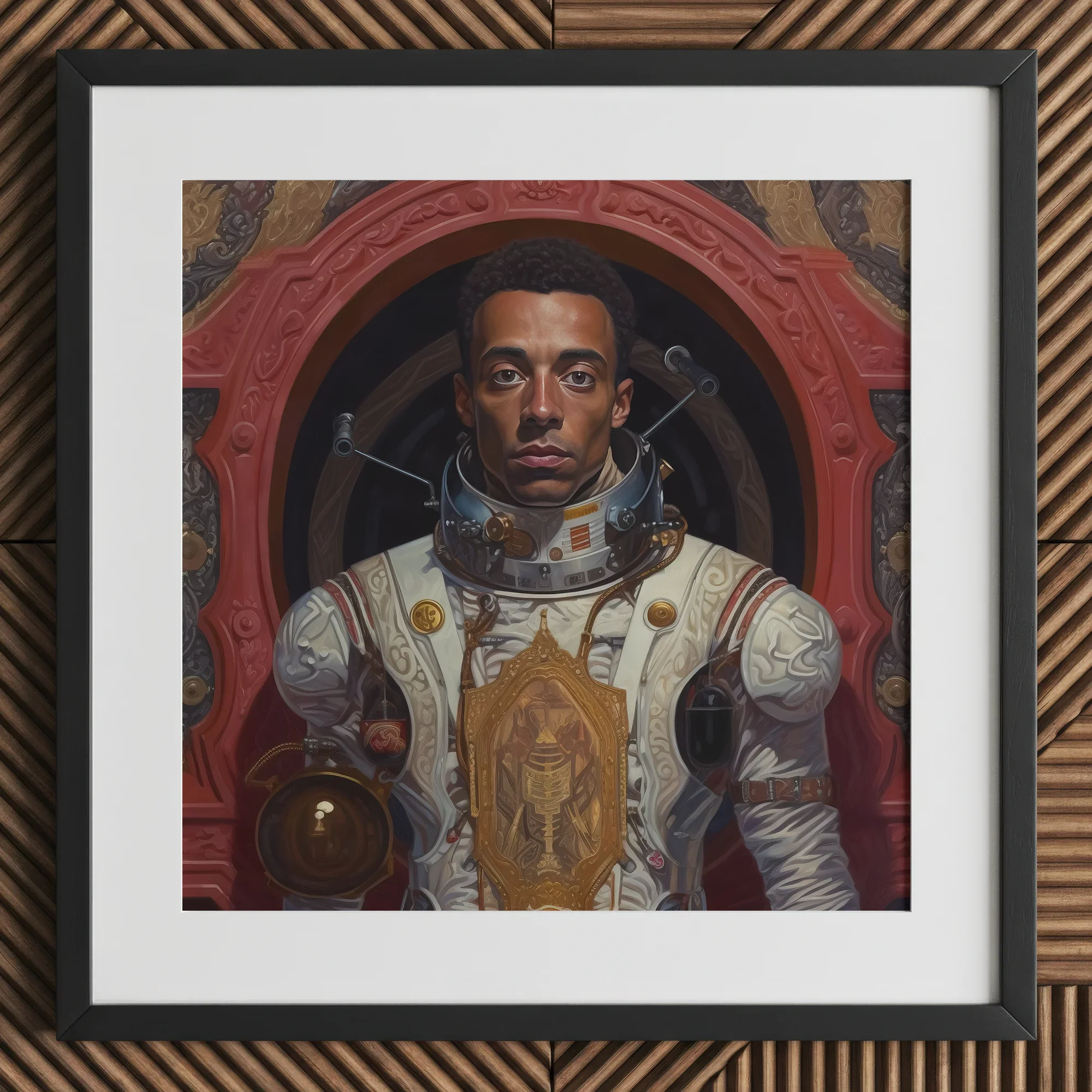 Every line of his form speaks—a testament to Harlem Renaissance dreams launched into the void, to Bayard Rustin’s unbreakable spirit translated into orbital motion. The deep mahogany of his skin, radiant against the ivory and bronze of his suit, reclaims the narrative of who belongs among the constellations. This is not just space travel; this is liberation, a rewriting of cosmic mythology.