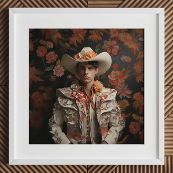 Andrés is a striking Hispanic gay vaquero where queer identity converges with the rich equestrian traditions of Iberian and Southwestern cowboy heritage. This museum-quality fine art print captures a moment of radical beauty—a modern vaquero adorned in rococo-inspired filigree, standing against a backdrop of baroque floral opulence. His traje de luces, sculpted in ivory leather and embroidered with delicate azahar blossoms, is a love letter to both the gilded traditions of Spanish vaquero culture and the unapologetic self-expression of gay artistry.