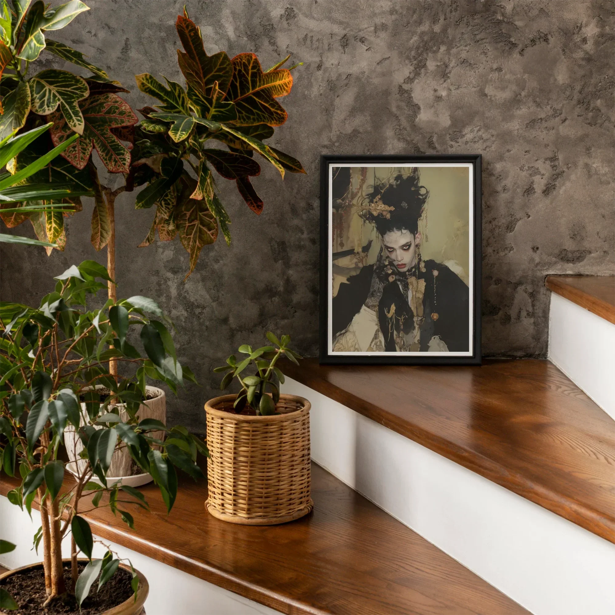 In this portrait, we find Antoine, a gay French vampire wrapped in the opulence and decadence of gothic couture. His pale, almost translucent skin contrasts sharply against the deep black velvet of his ornate attire, while the striking red of his eyes seems to pierce through the shadows.