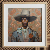 Apollo doesn’t just wear the West—he reinvents it. A Black dandy cowboy draped in gay opulence, standing at the crossroads of forgotten history and radical self-possession. His pearl silk cravat flutters like a whispered rebellion, his wide-brimmed Stetson casting shadows over a lineage too long erased. The Black gay cowboy tradition pulses through every thread of his brocade jacket, its pattern a whispered hymn to Harlem ballrooms and the open prairie alike.
