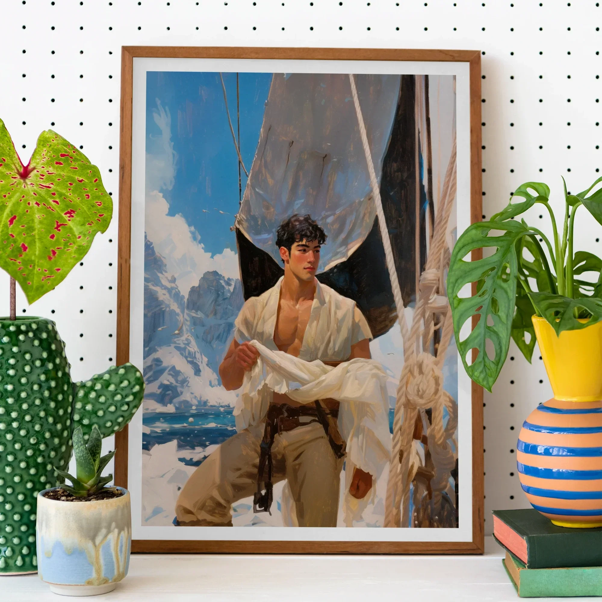 You're transported to a world where icy grandeur meets sun-kissed adventure. This evocative art print thrusts you into the heart of an Arctic odyssey, where a young gay seaman stands as a beacon of queer exploration and resilience. His bronzed skin and sultry dark hair defying the frigid landscape. His heartbeat a love letter to the human spirit.