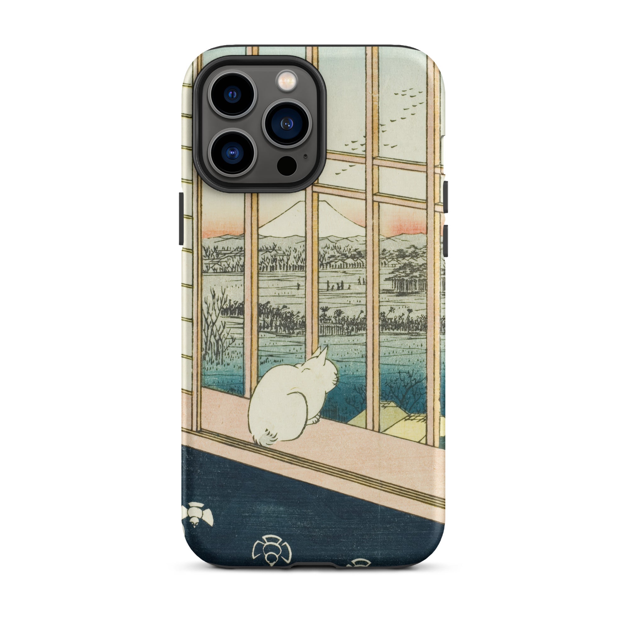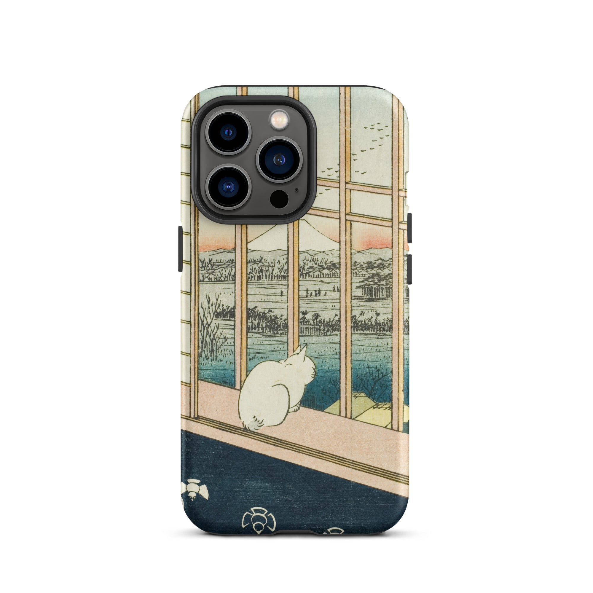 Edo-period woodblock printing techniques hum beneath each color gradient and line, encoded with ukiyo-e mastery and the Rinpa school’s crisp clarity. A visual haiku stitched in ink on washi paper. The cat remains—unmoving, unnamed, absorbing the floating world.