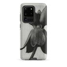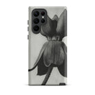 A towering botanical effigy looms across the smooth Samsung shell—Karl Blossfeldt’s lens capturing Asclepias Syriaca in stark monochrome. Petals curve like sculpted cuirasses, their shadows pressing into pale ground. The stem rises with quiet authority, every fiber etched into focus.