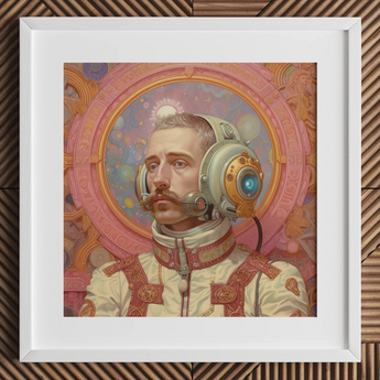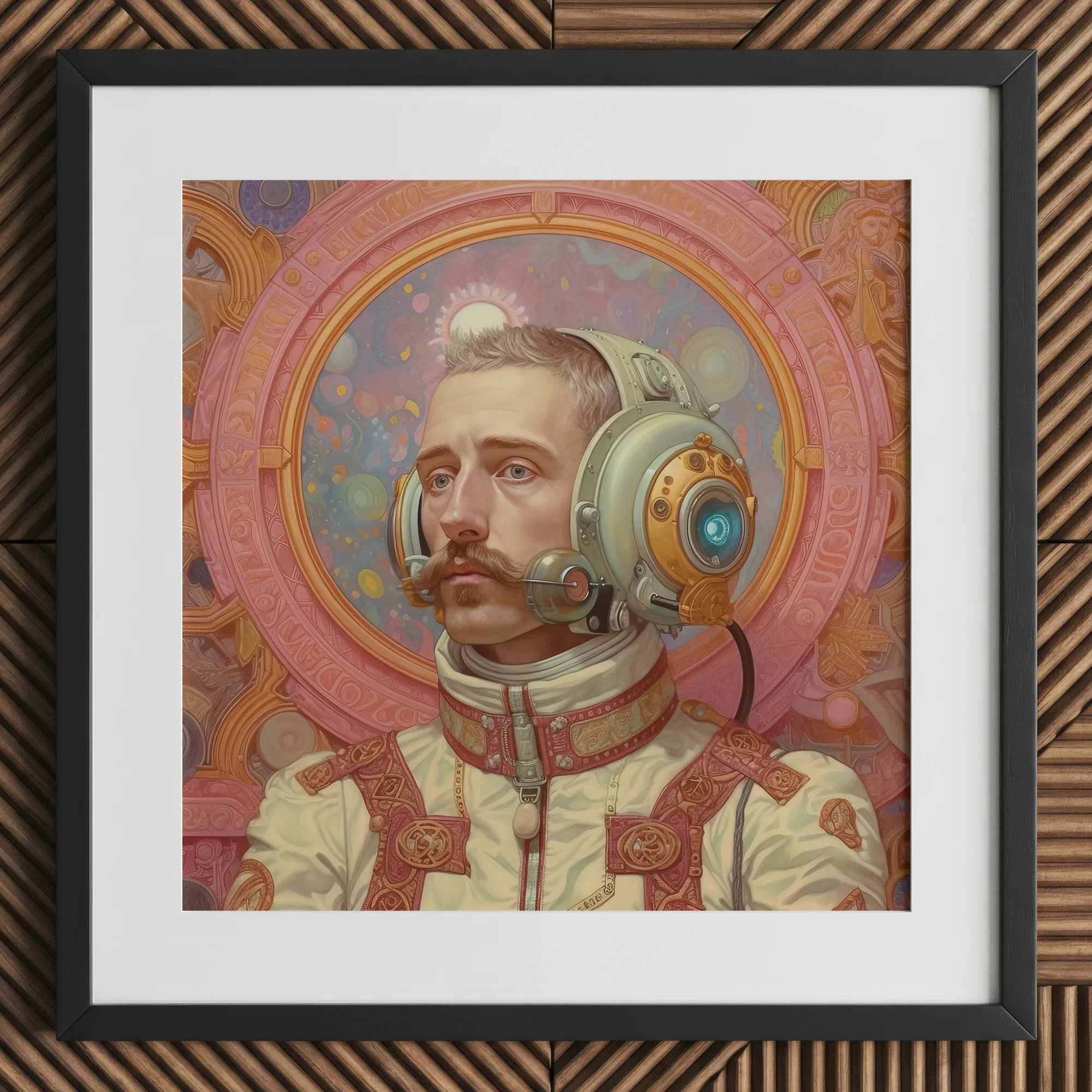 The curve of his helmet mirrors the celestial rings behind him. A cosmic halo, anointed with queer mythology, a baptism of moonlight and stardust. The orbiting planets are not just celestial bodies; they are silent witnesses to every hidden love story in a Prussian officer’s quarters, every whispered vow in Berlin’s cabarets, every act of defiance against laws that tried to erase men like him. Axel wears his legacy boldly—his waxed mustache a nod to 19th-century dandyism, his tailored suit a manifesto of resistance.