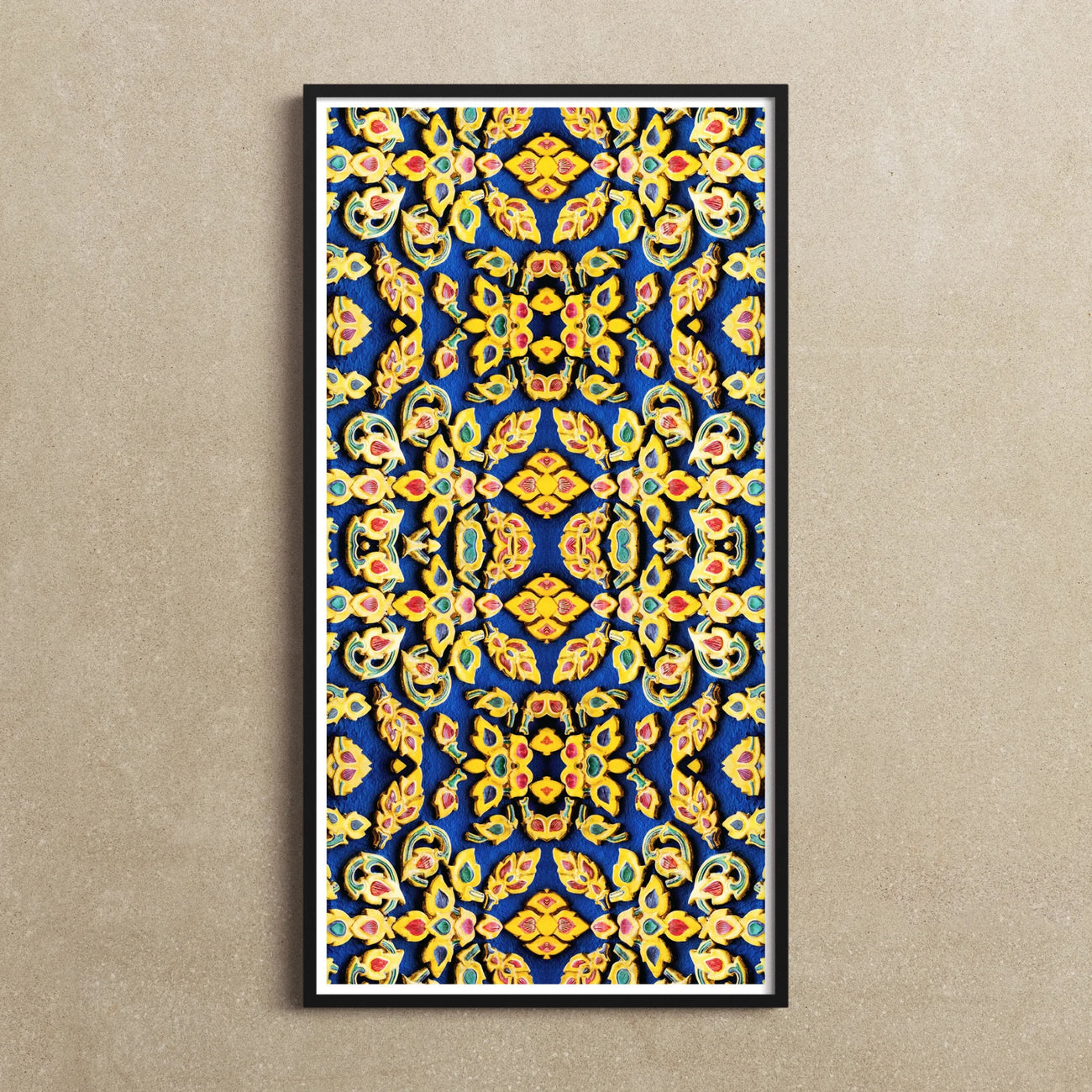Immerse yourself in the opulent, kitschy grandeur of Ayodhya — a mesmerizing Thai mosaic that pulsates with cultural resonance. This intricate traditional design, awash in regal cobalt and gilded hues, weaves a tapestry of Thailand's spiritual essence.