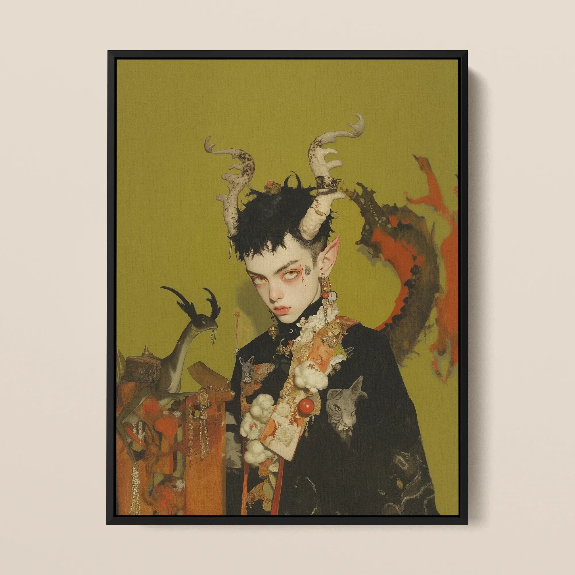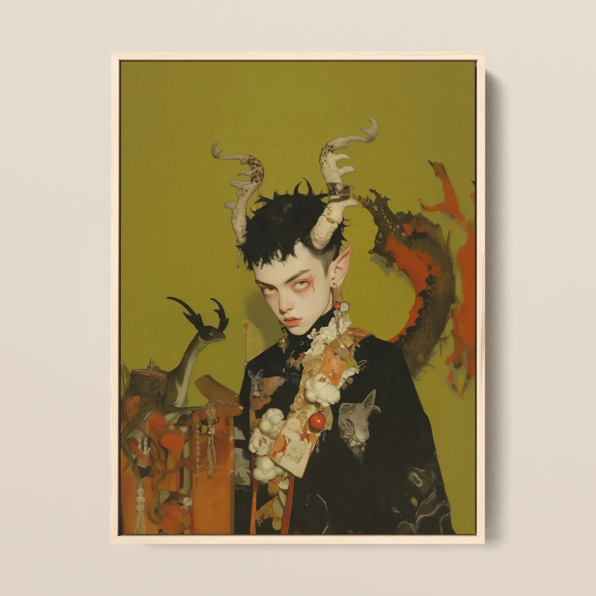 He stands on the precipice of prophecy—Baphomet’s heir, an illegitimate gay demon prince draped in the velvet hush of forgotten rituals. Horns curved like eldritch sigils, spiralling from a crown of blackened curls. Their bone-white ridges whispering of Gothic surrealism and Satanic mythology. His eyes rimmed in smoldering ochre, bearing the weight of occult prophecy, a gaze that sears through time itself.