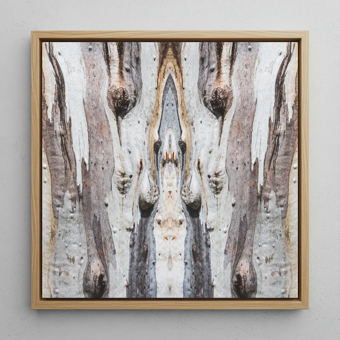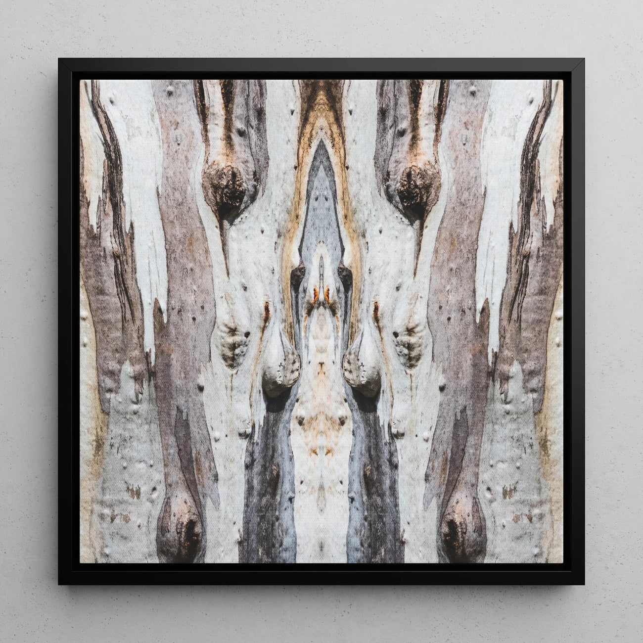 Barking Mad trippy tree trunk canvas transcends mere botanical representation. Offering a hypnotic journey into the heart of arboreal abstraction. This framed canvas elevates Australian tree bark to surrealist heights, creating a Rorschach-like symmetry that challenges perception.
