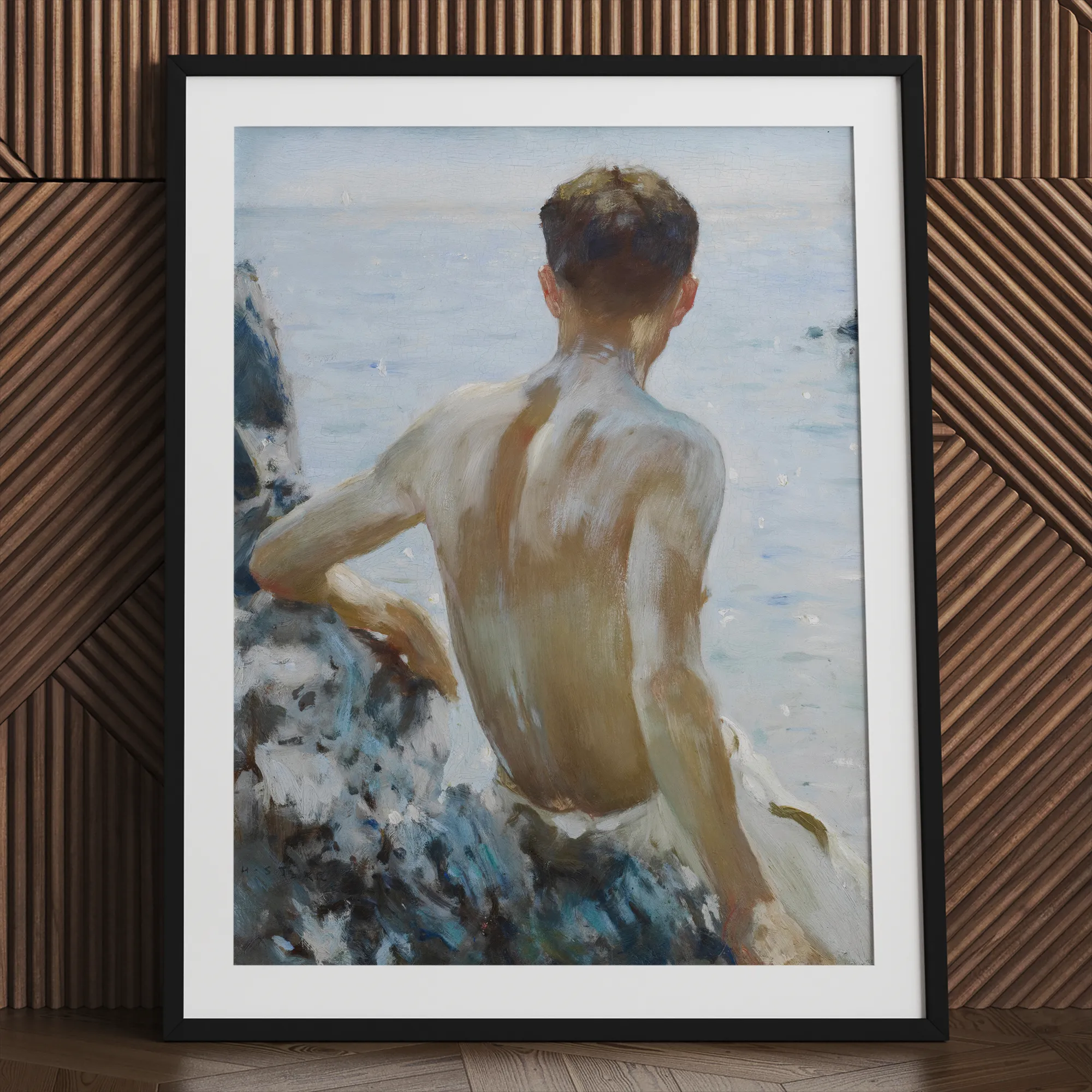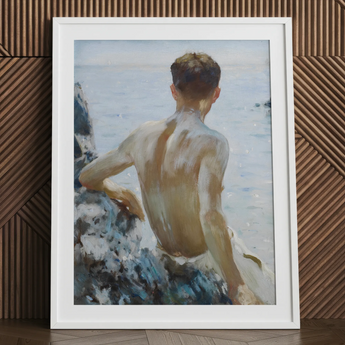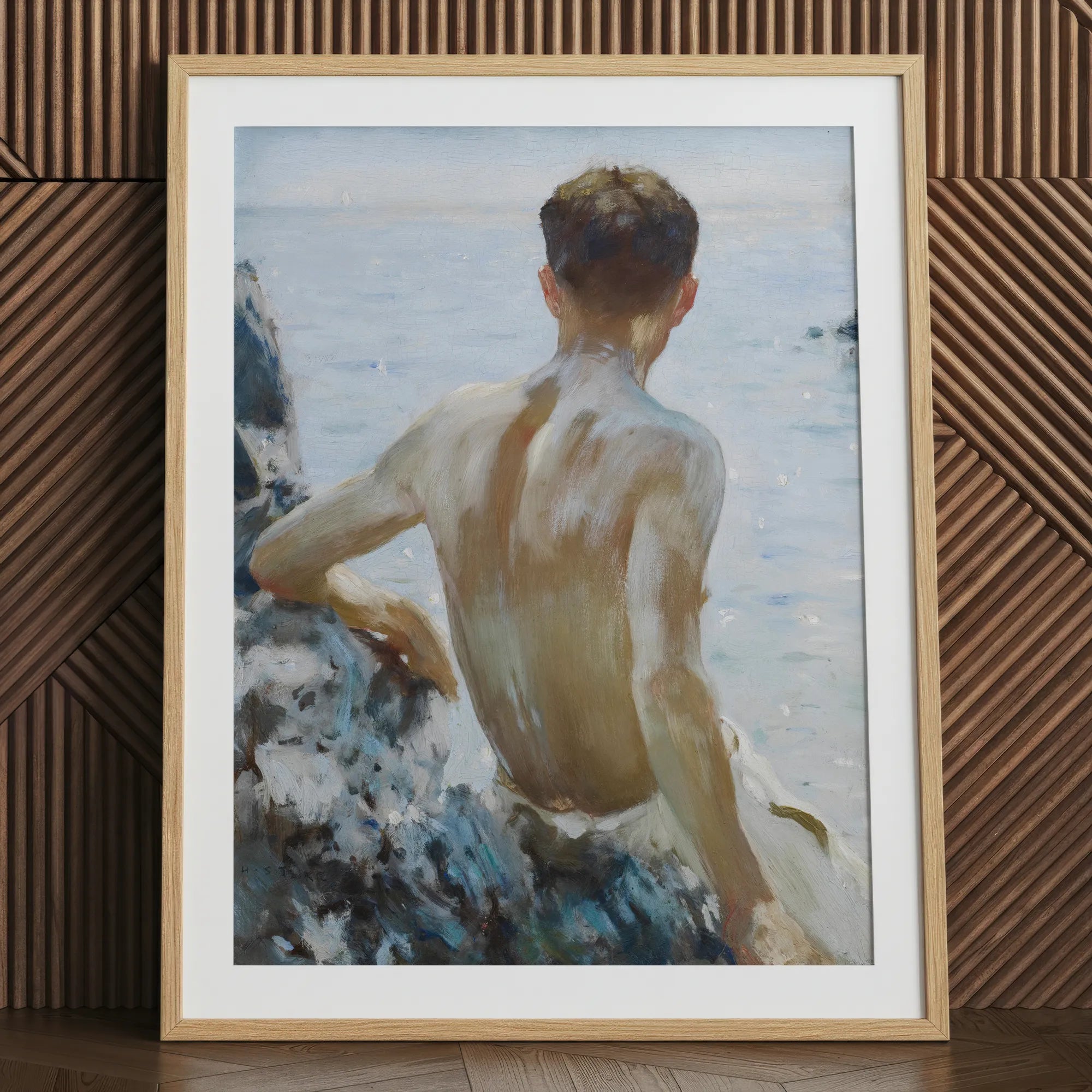 Charlie Mitchell, the painter’s final muse, rests in sculpted poise on roughened stone—a body transfixed in mid-contemplation, poised between the sea’s infinite hush and the painter’s own mortal end.