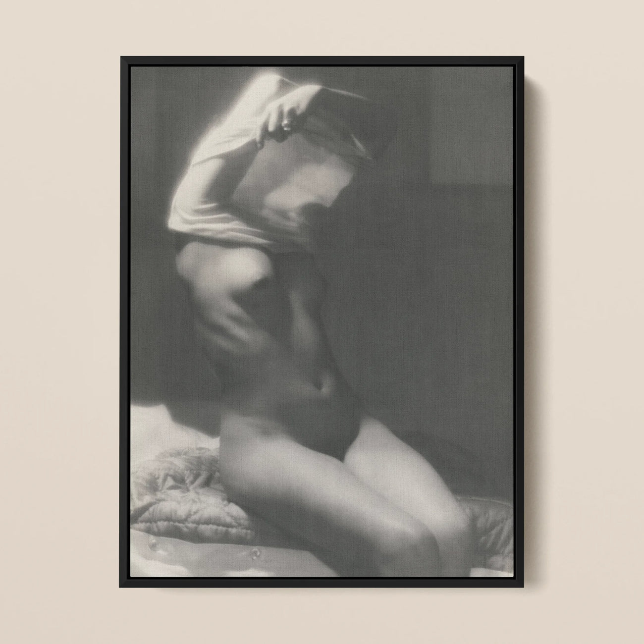 This striking monochrome image exemplifies the avant-garde photography techniques of the mid-20th century. The photographer's masterful manipulation of light and shadow creates a dreamlike quality, blurring the lines between realism and abstraction as a lithe woman disrobes — pulling a white t-shirt over her head to reveal her lithe form. Soft focus effects and deliberate motion blur add to the ethereal atmosphere, inviting you to contemplate the nature of perception, memory and desire.