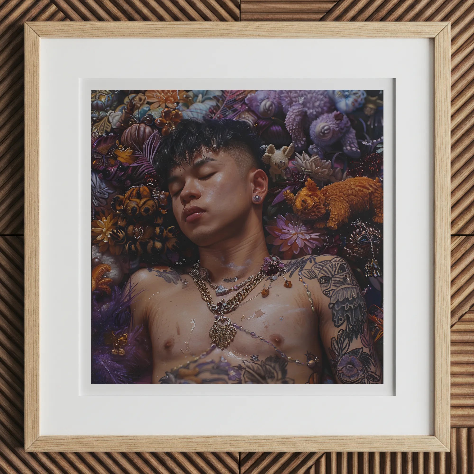 This isn’t just an art print. This Bent & Spent Thai twunk commands attention. Raw sensuality oozing from the frame. Pulling you into his wet dreamspace. A space that feels erotic and sacred at once. His vulnerability, layered under that cool exterior, makes you question your own. Are you watching him, or is he letting you in?