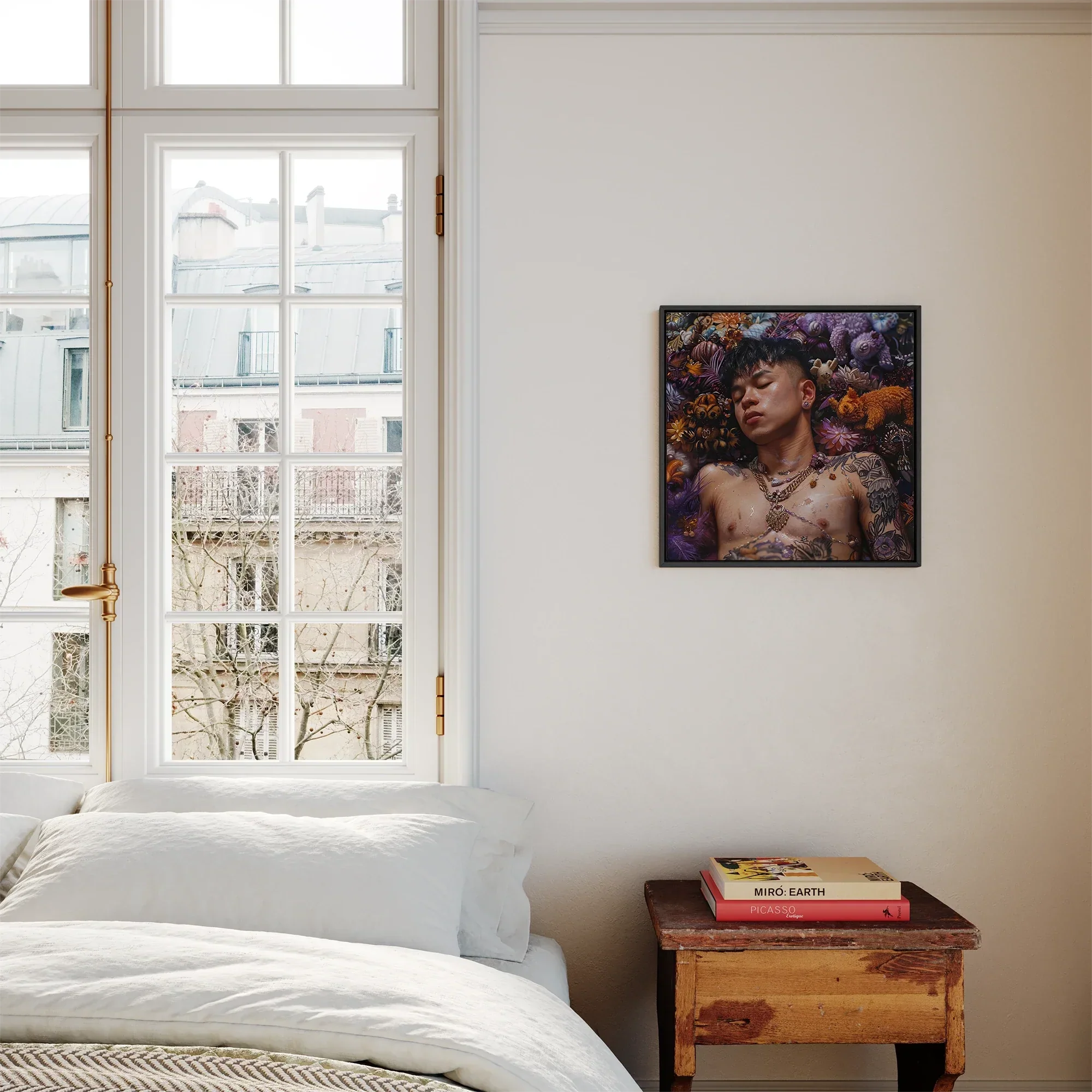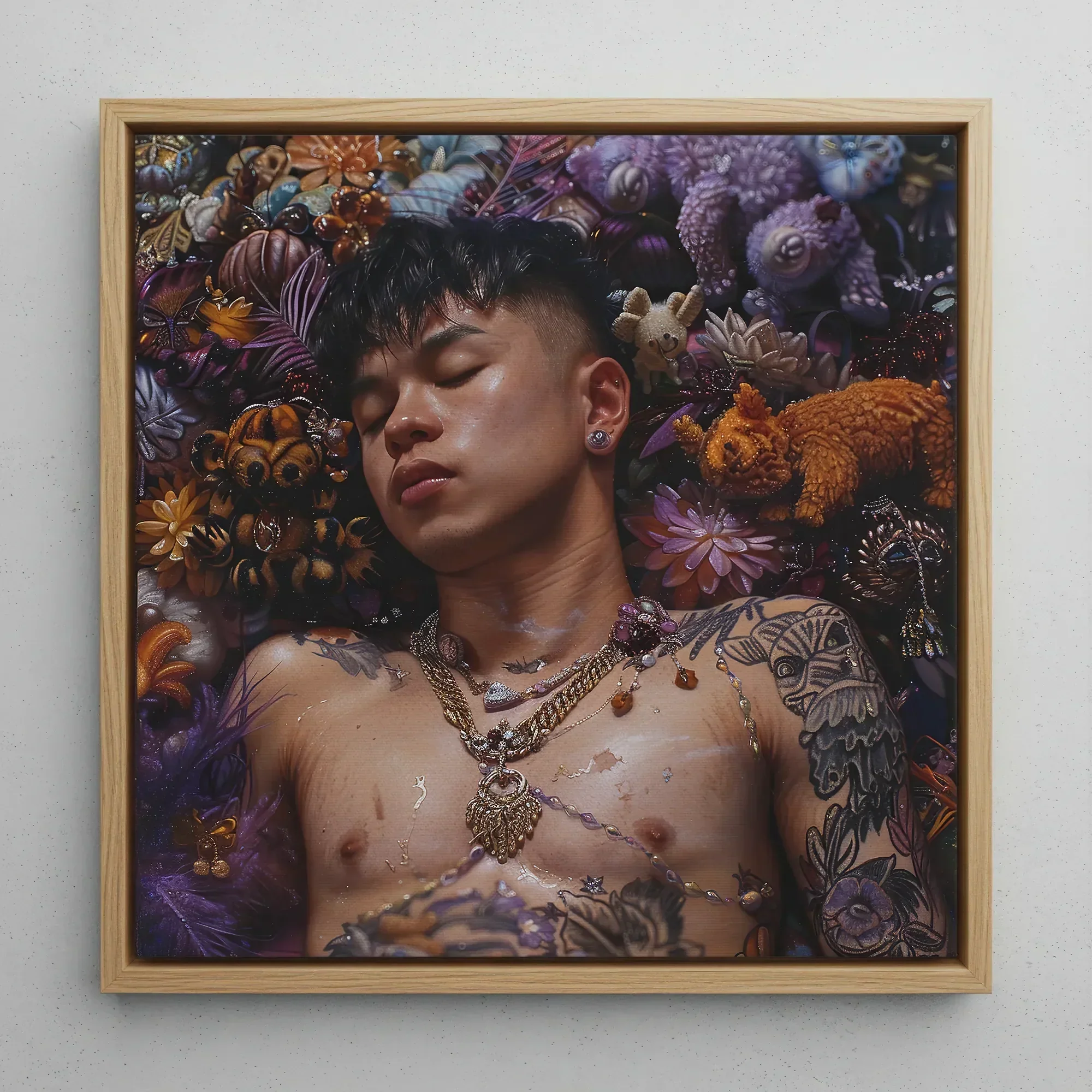 His eyes are closed, but everything around him is awake—riotous, tangled wildflowers in molten purples and smoldering oranges, creeping toward his warmth. Plush, uncanny stuffed animals stare from the bloom, their beaded eyes gleaming, a surreal fusion of innocence and eroticism. A space of queer longing, a soft-lit fever dream. Do they belong here? Do you?