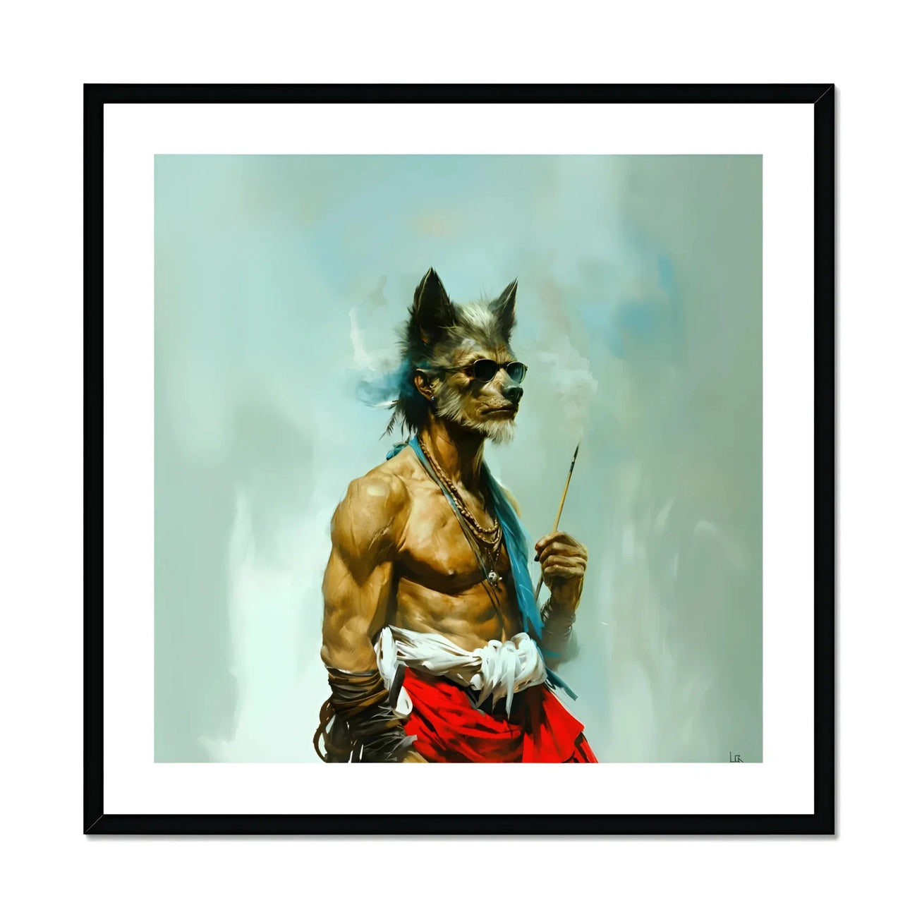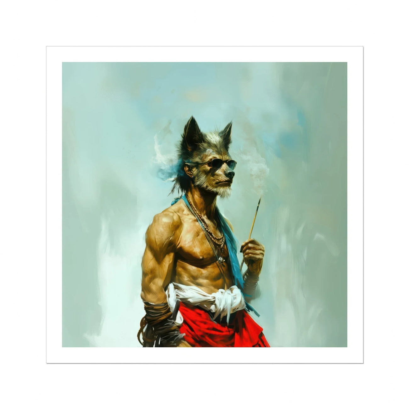 Bhediya's a spectral elder bound in smoke and stories. A figure of timeless grace, this gay wolf sadhu's carved from sinew and scarlet cloth. Fur etched with age and wisdom. Catching the light as he peers into worlds beyond. Eyes hidden behind shades that reflect nothing yet see everything.