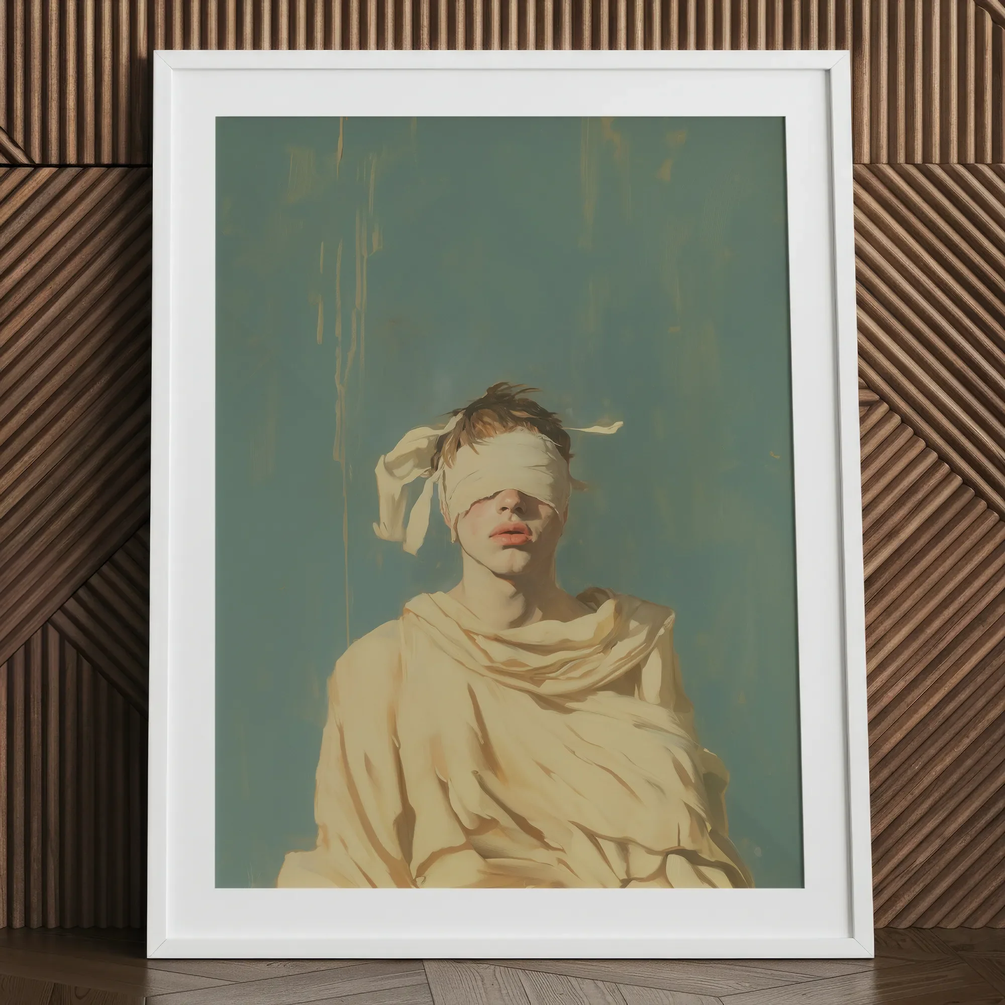 Veiled in ivory folds, a blindfolded gay saint hovers between the sacred and the sensual—a neoclassical martyr reborn in oil and light. Shadows kiss the contours of their face, a Greco-Roman apparition with lips poised between silence and confession. The cream-draped fabric cascades like the robes of Renaissance angels, but the backdrop bleeds modernity—abstract teal, streaked like memory dissolving into pigment.