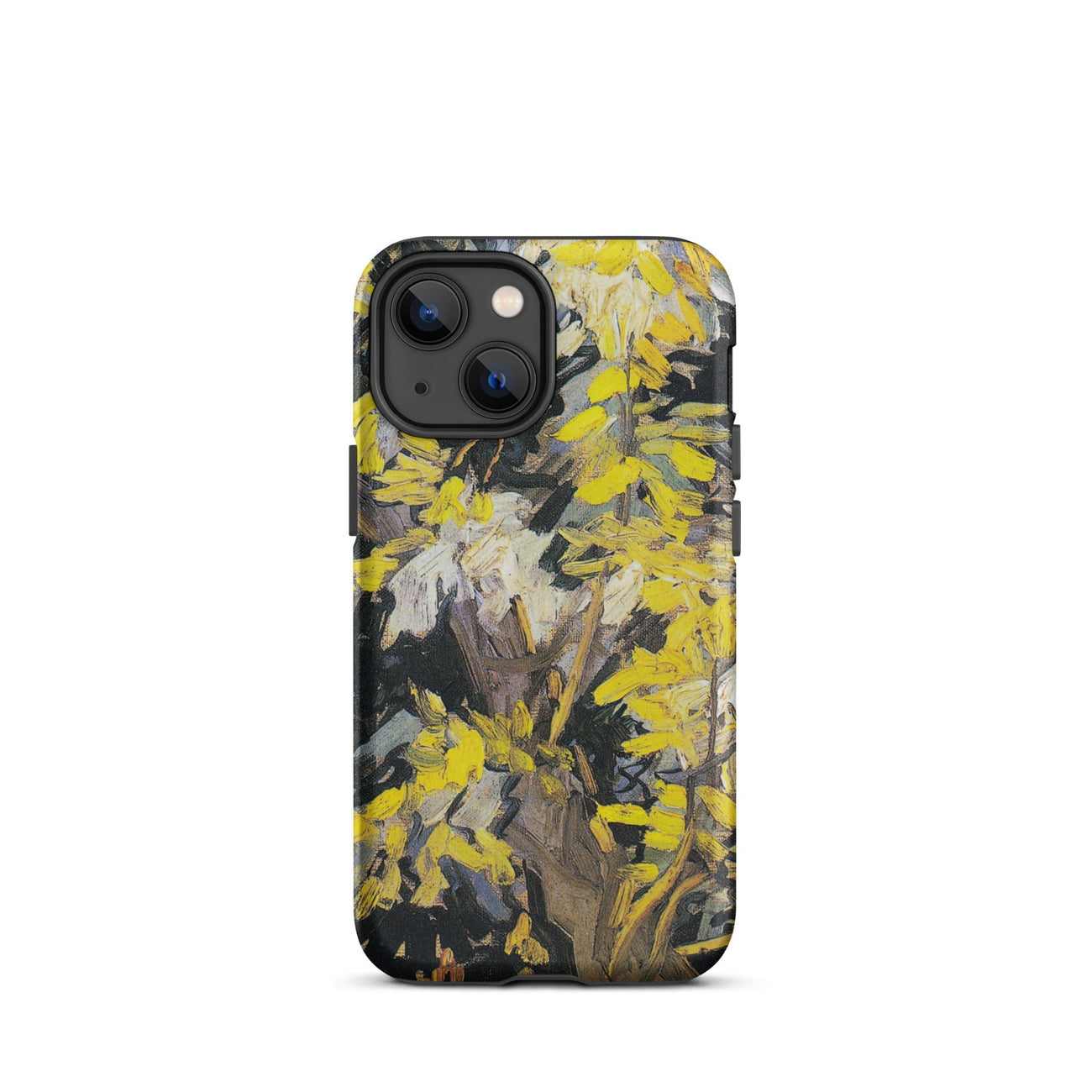 This iPhone case captures the wild, golden riot of Van Gogh’s Blossoming Acacia, where sunlit blossoms flare like stars colliding in a restless sky. Each petal seems to hum with frenetic life, suspended between creation and Autumn's cool kiss. The acacia’s branches twisting in a labyrinth of tangled vitality that refuses to yield to the shadows looming behind.
