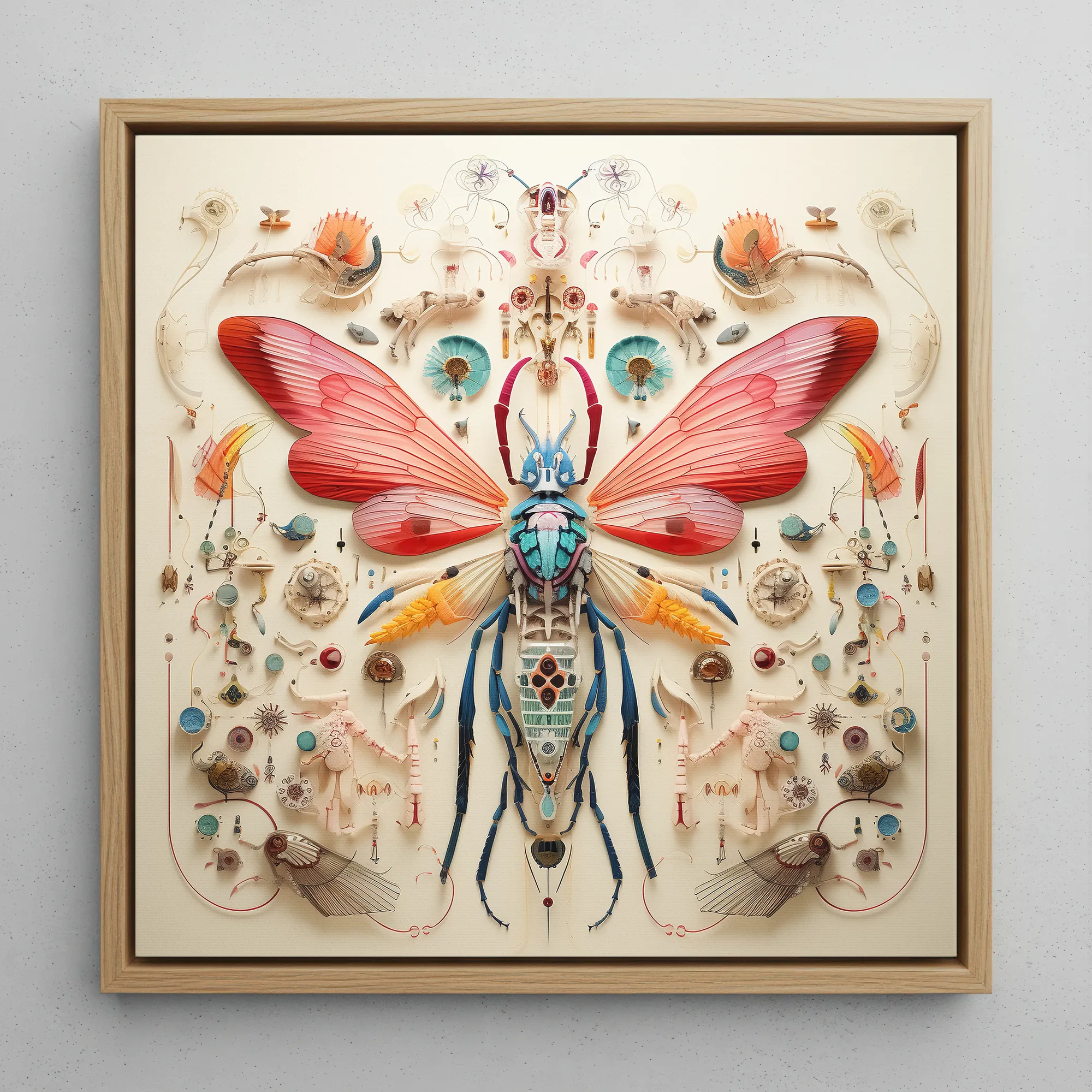 Surrounding this interstellar lifeform, a taxonomic mandala unfolds—extraterrestrial flora with fractal symmetry, fossilized chitin from deep-space arthropods, and molecular diagrams of speculative alien physiology. A relic of speculative xenozoology, this surreal scientific illustration blurs the line between digital entomology and avant-garde biological surrealism.