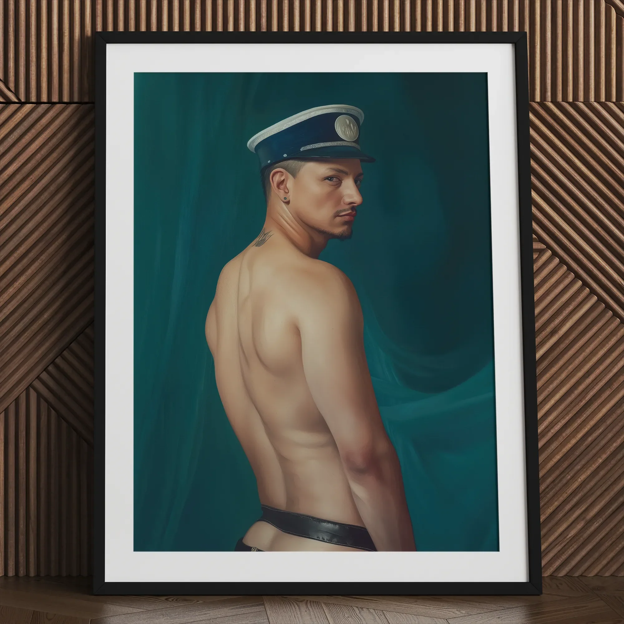 You're adrift in his gaze, pulled into uncharted waters where rugged masculinity and raw vulnerability dock side by side. This homoerotic marvel transcends the frame - it's a siren song to queer beauty, celebrating the eroticism that lurks beneath the surface of every sailor's story. In this bold, minimalist harbor, it's just you and him, locked in an unspoken voyage of longing and liberation.