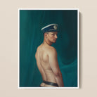 The naval fetish aesthetic unfurls in every detail: that vintage-inspired sailor cap, the leather strap slipping below his waistline, the sensual realism of a body sculpted by both labor and longing. His bare-chested masculinity is a paradox—stoic yet inviting, rigid yet raw. Contemporary queer wall art honoring the power and vulnerability of homoerotic desire.