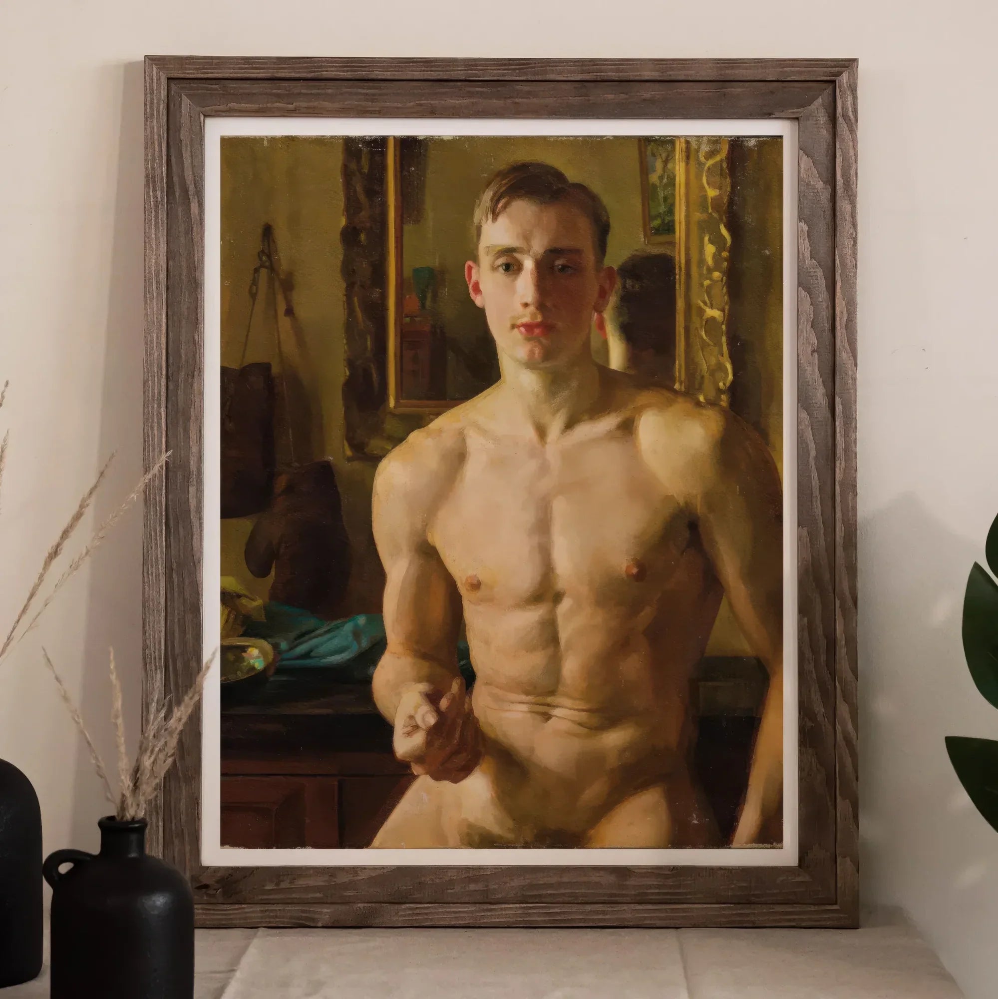 Konstantin Somov’s The Boxer is a mesmerizing oil portrait of Boris Snezhkovsky, a frequent model and muse for the artist. This painting, an epitome of Somov's fascination with light and form, showcases Snezhkovsky's muscular physique in a half-length nude pose. The still life elements—a mirror, a chest of drawers, and boxing gloves—add layers of narrative and introspection, offering a glimpse into the model’s daily life.