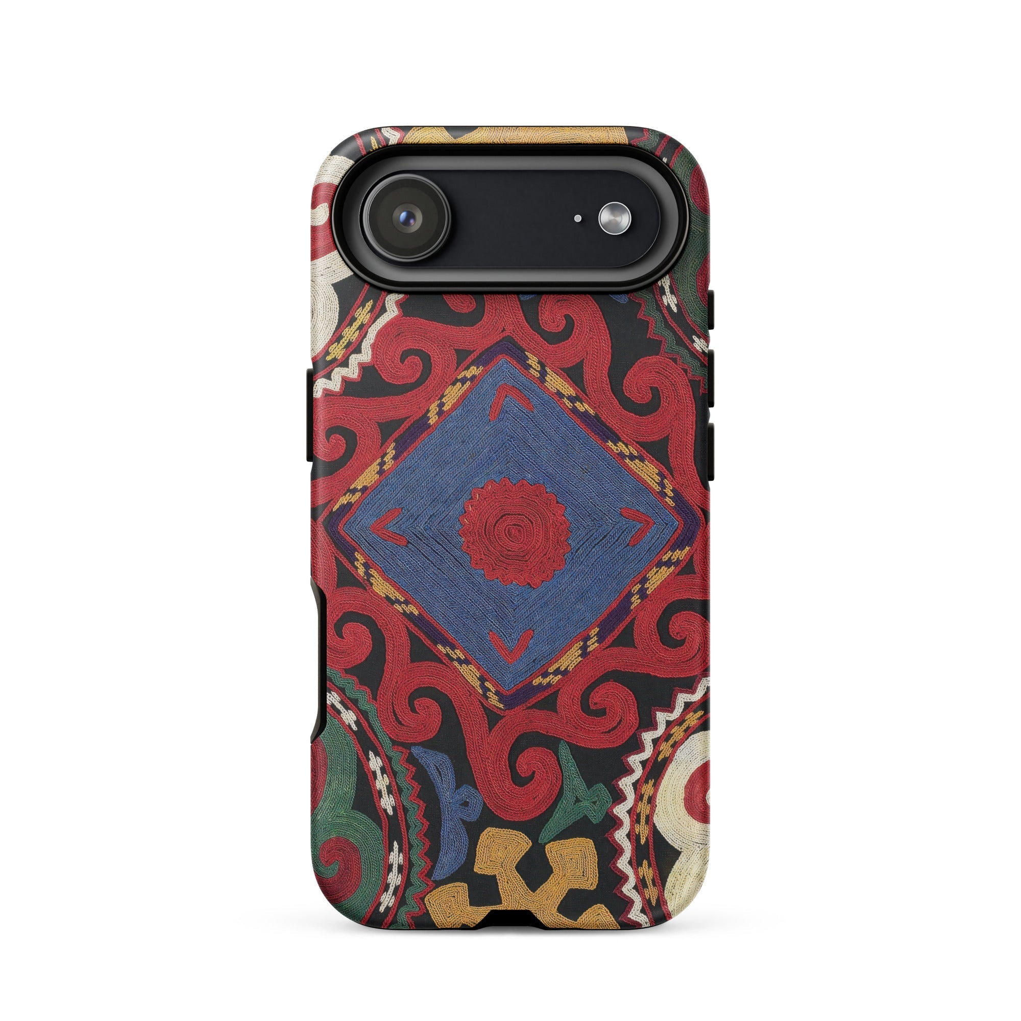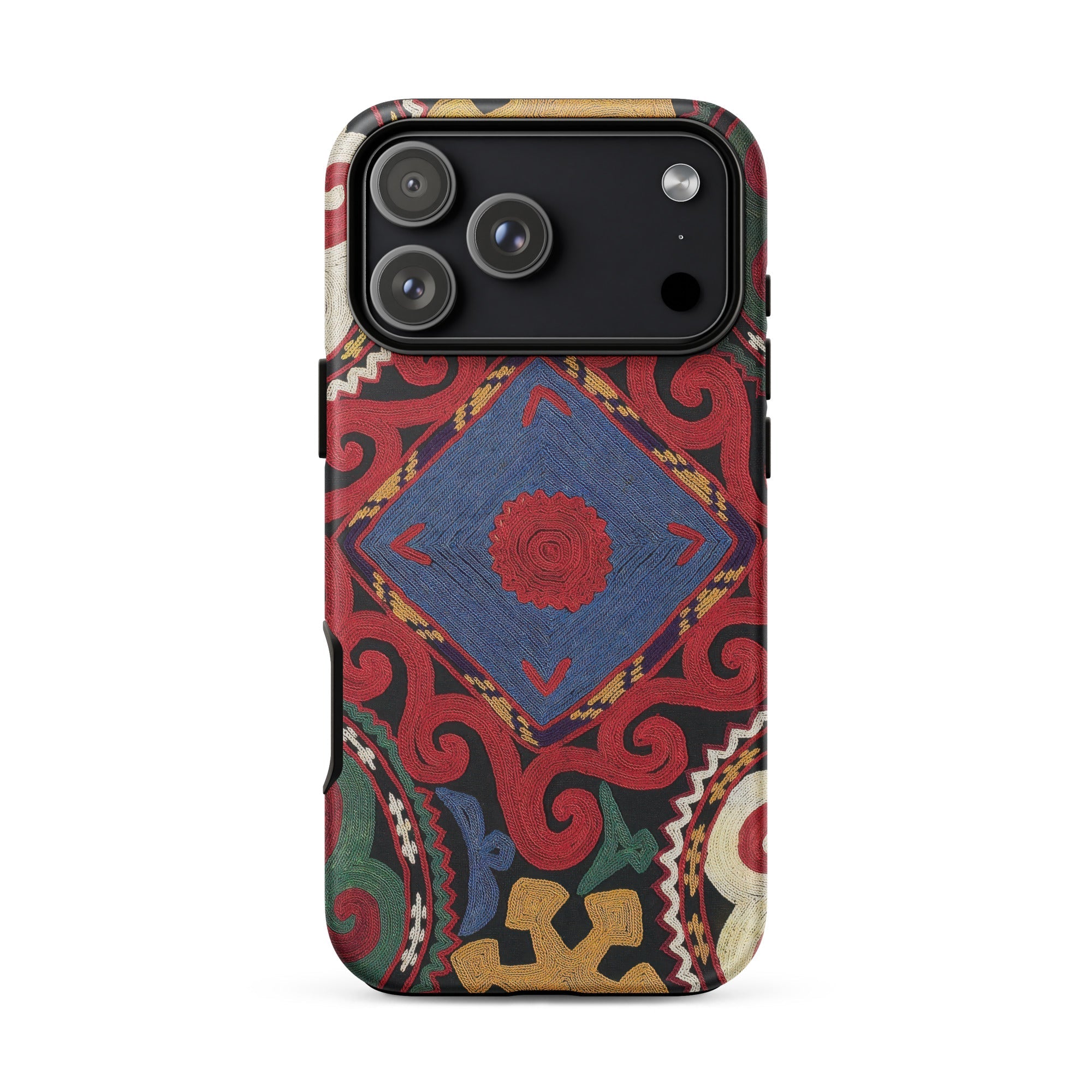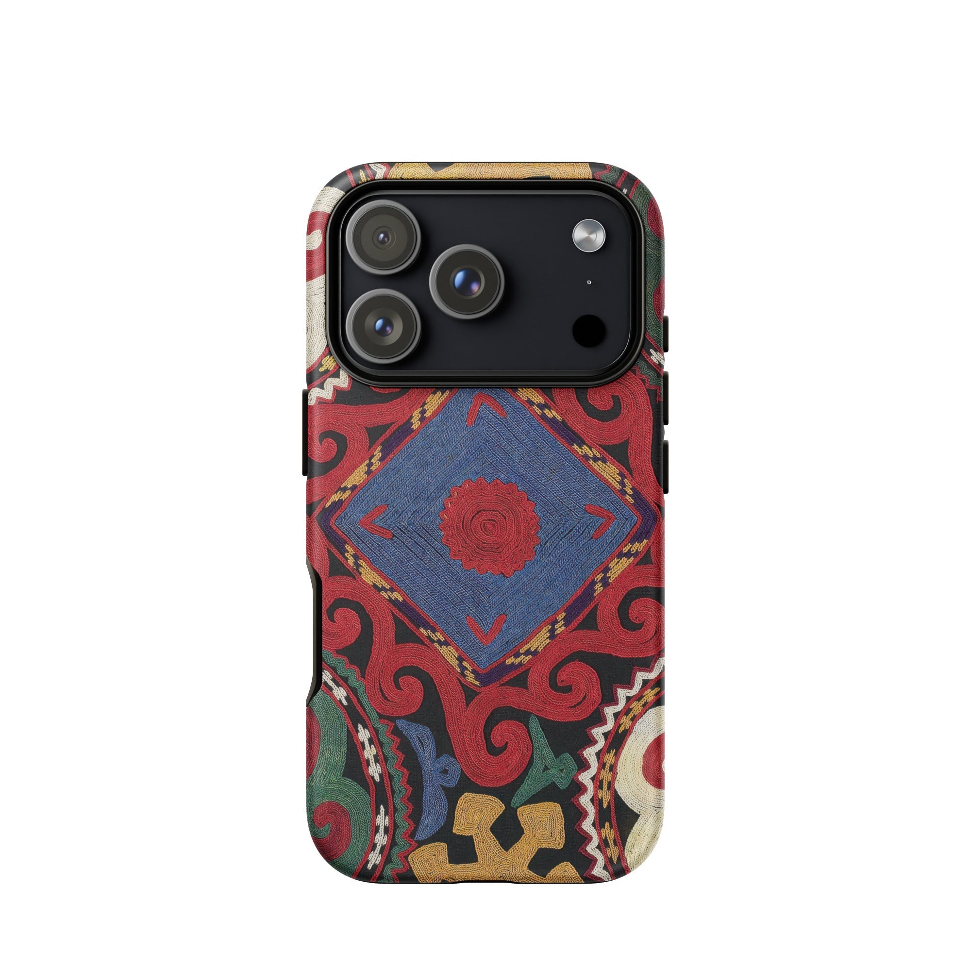 A lattice of memory, woven in the language of thread—this Ilgich-braided iPhone case does not merely enshrine pattern, but speaks in the dialect of centuries. Wool entwines in a choreography of color: scarlet tendrils unfurl like ancient songlines, deep cerulean glows with the hush of twilight over desert steppe, gold flickers like firelight against the night’s abyss. A constellation of motifs unfurls—a diamond talisman, sinuous arabesques—all steeped in the quiet wisdom of Durmen hands.