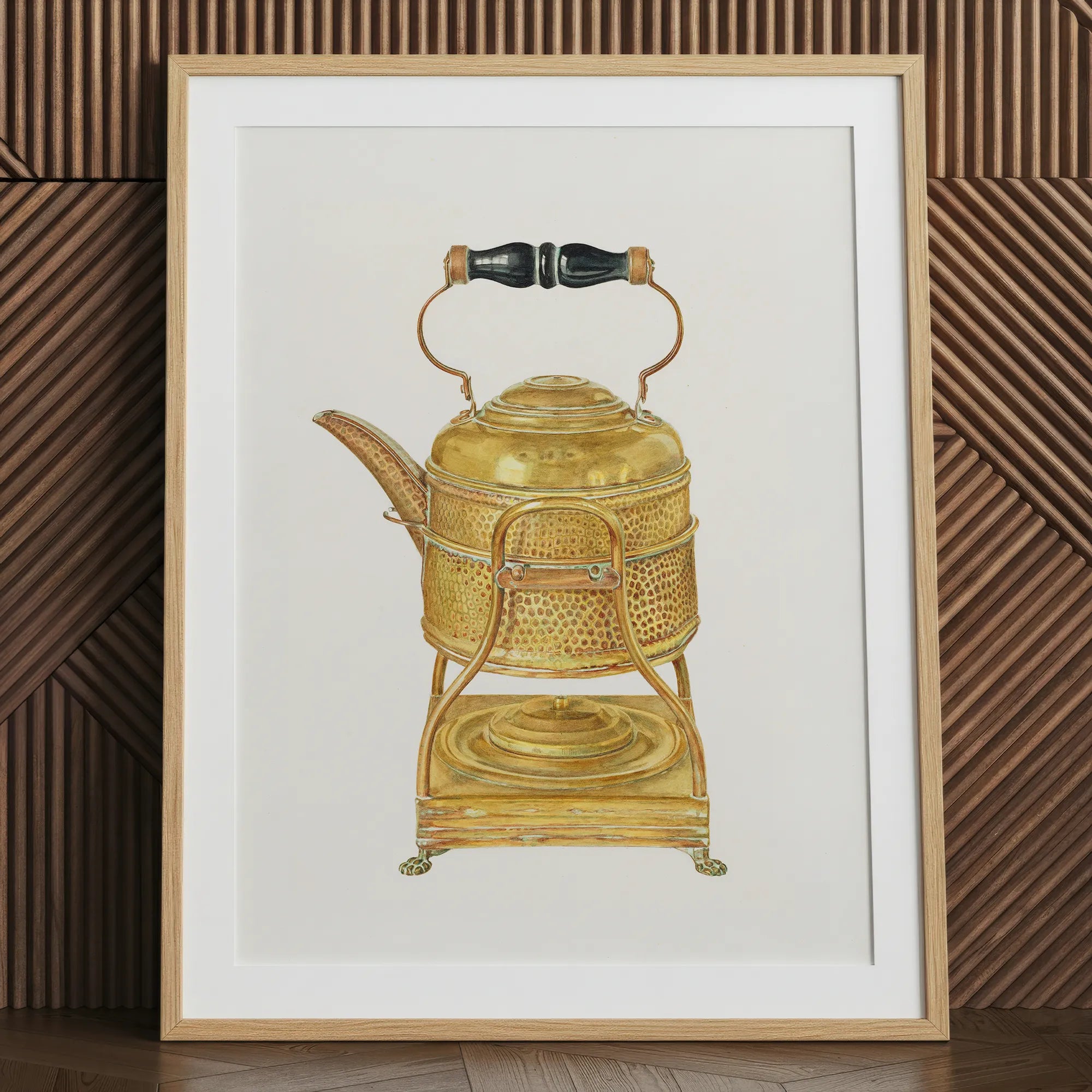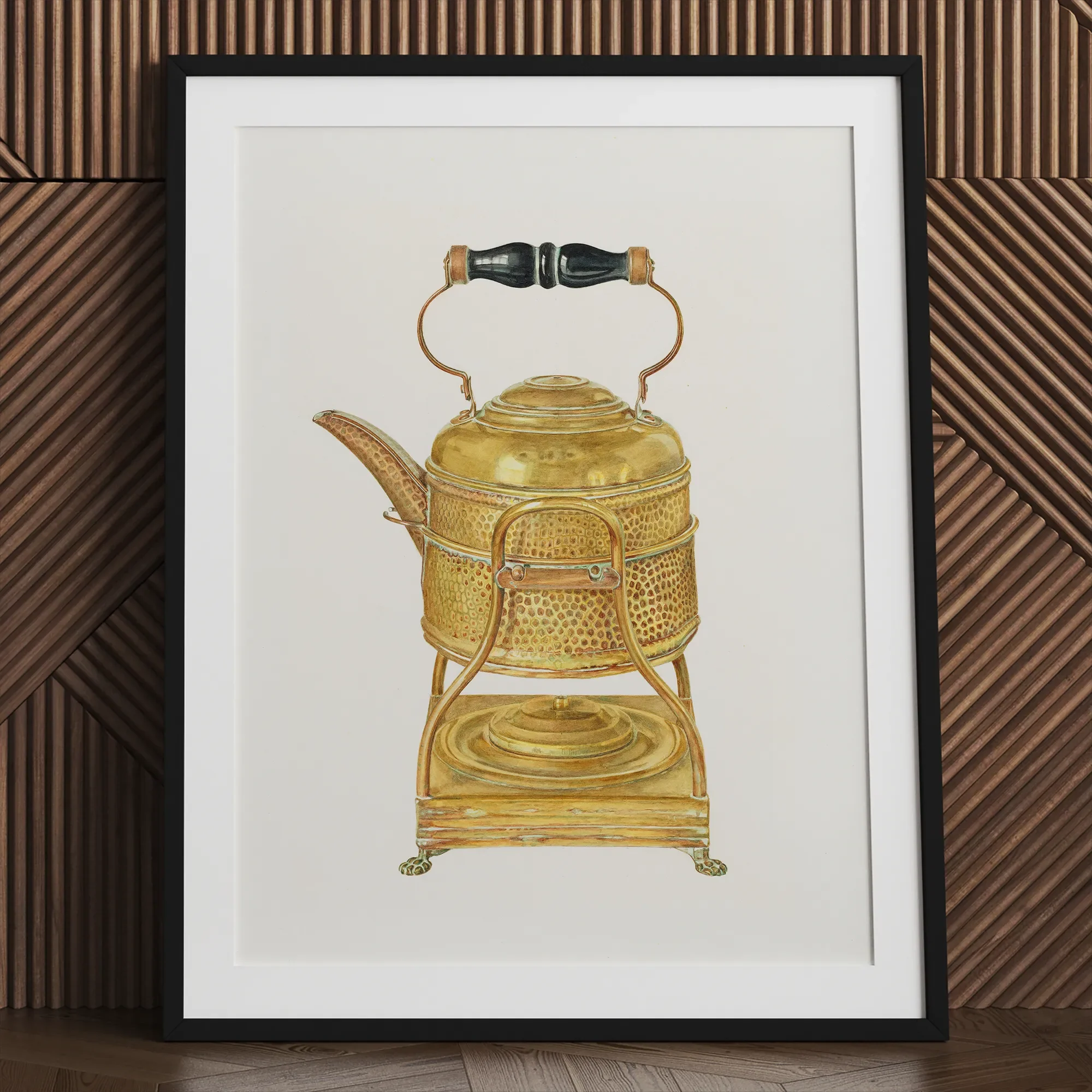 Frank M. Keane's masterful brushstrokes bring to life a vintage stovetop companion, its golden patina gleaming with timeless charm. Transporting you to a bygone era with this enchanting brass kettle print.