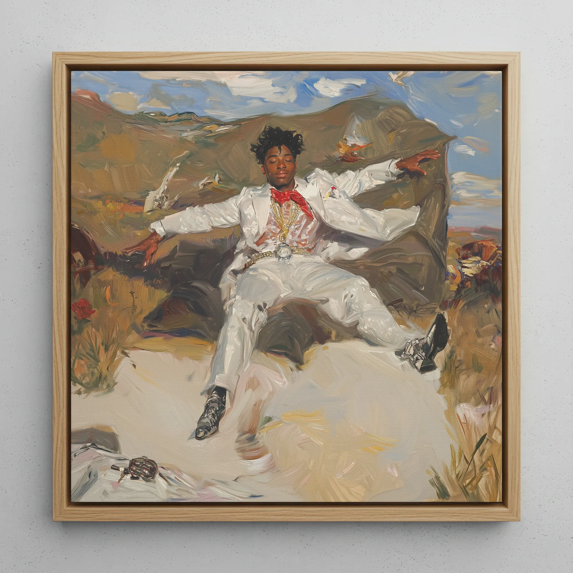 He spreads his arms like he owns the horizon, the suit a sheet of light over umber shadow, the red knot pulsing at the throat. Bright White Light takes the Black cowboy into contemporary figurative art, blending oil painting swagger with fashion precision.