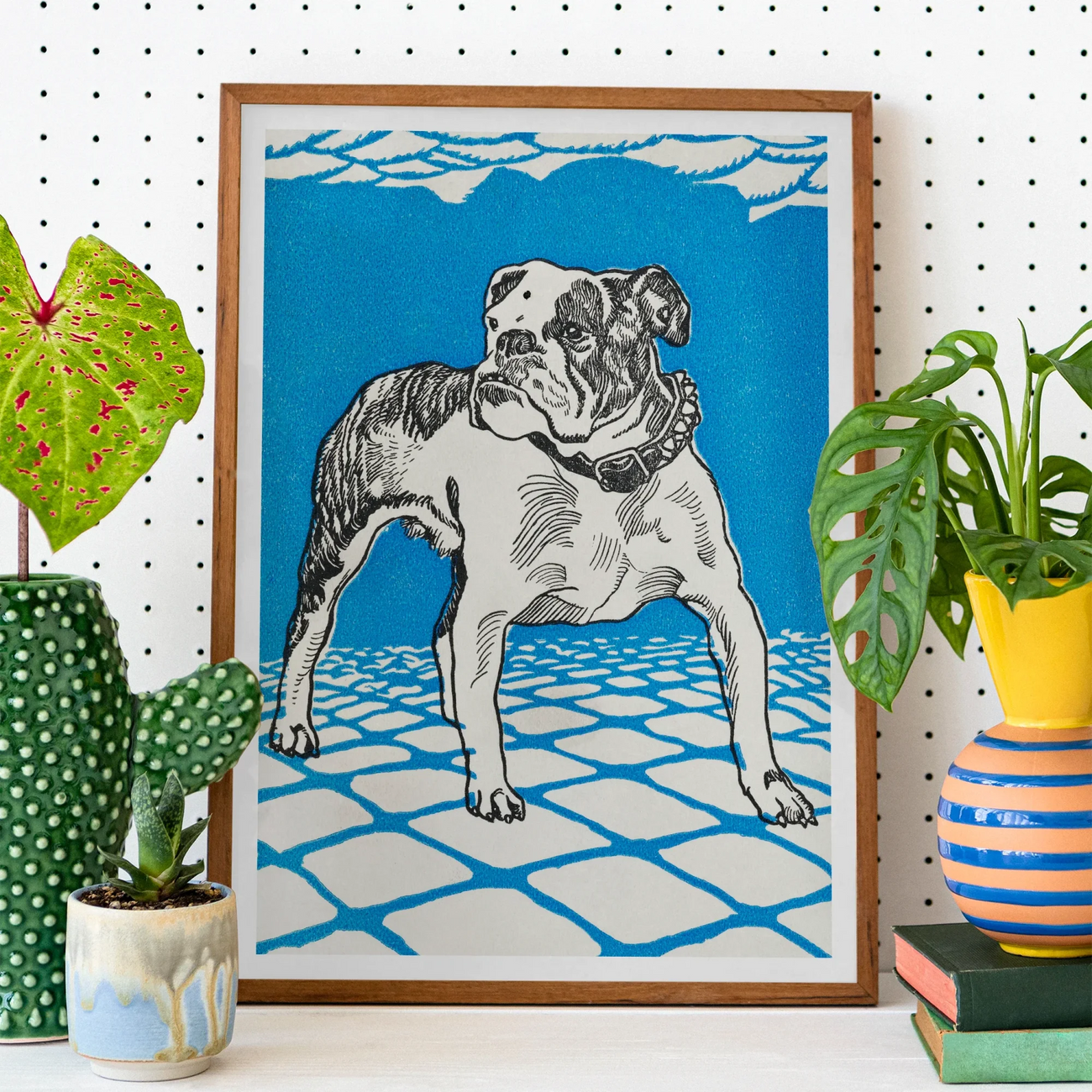 In this striking lithograph, Moriz Jung's Bulldog leaps from the frame with electric vitality, embodying the avant-garde spirit of early 20th-century Vienna. Set against a hypnotic azure backdrop, the canine's muscular form commands attention, its every sinew rendered with Jung's trademark precision.