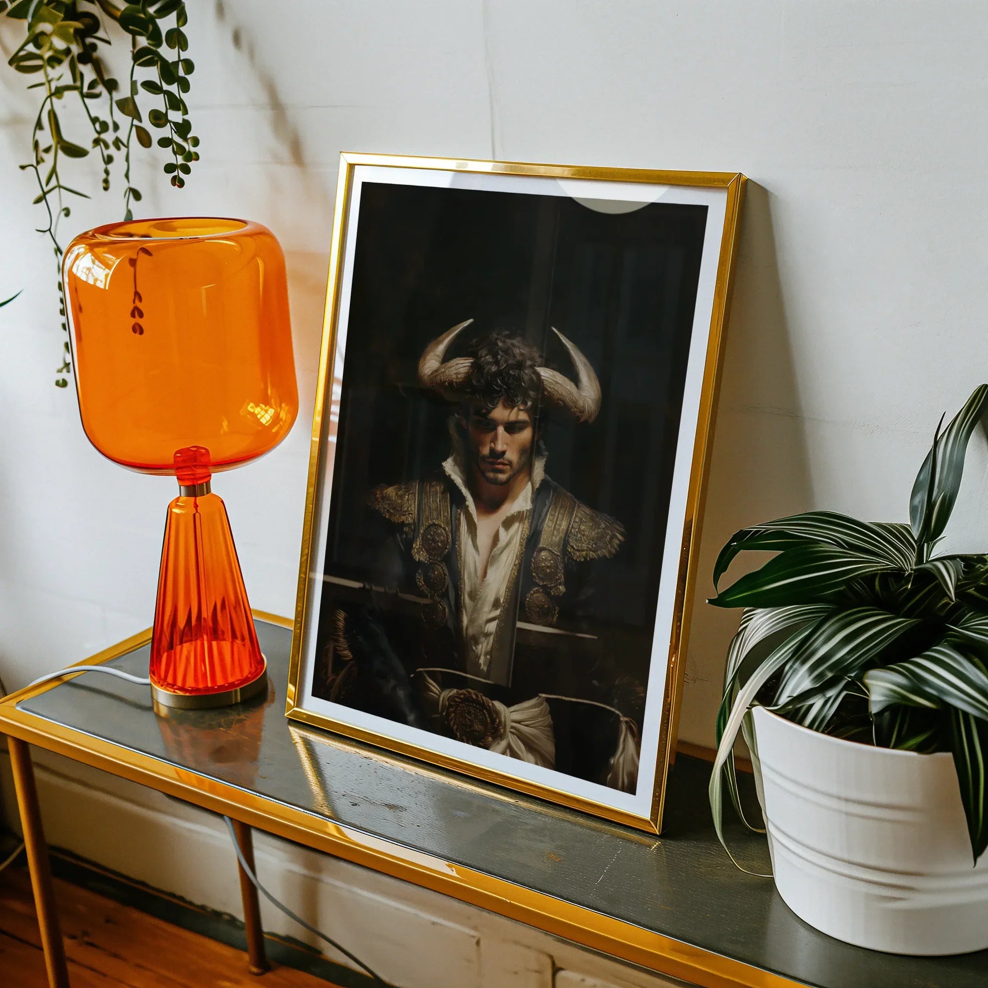 In the shadowy realm where myth meets masculinity, you encounter this vision of queer power incarnate. This hyperrealistic portrait merges the raw sensuality of a gay matador with the primal strength of a horned deity. Golden ornaments adorn his dark, richly textured attire, echoing the theatrical elegance of Spanish bullfighting culture. But there's more here than mere pageantry.