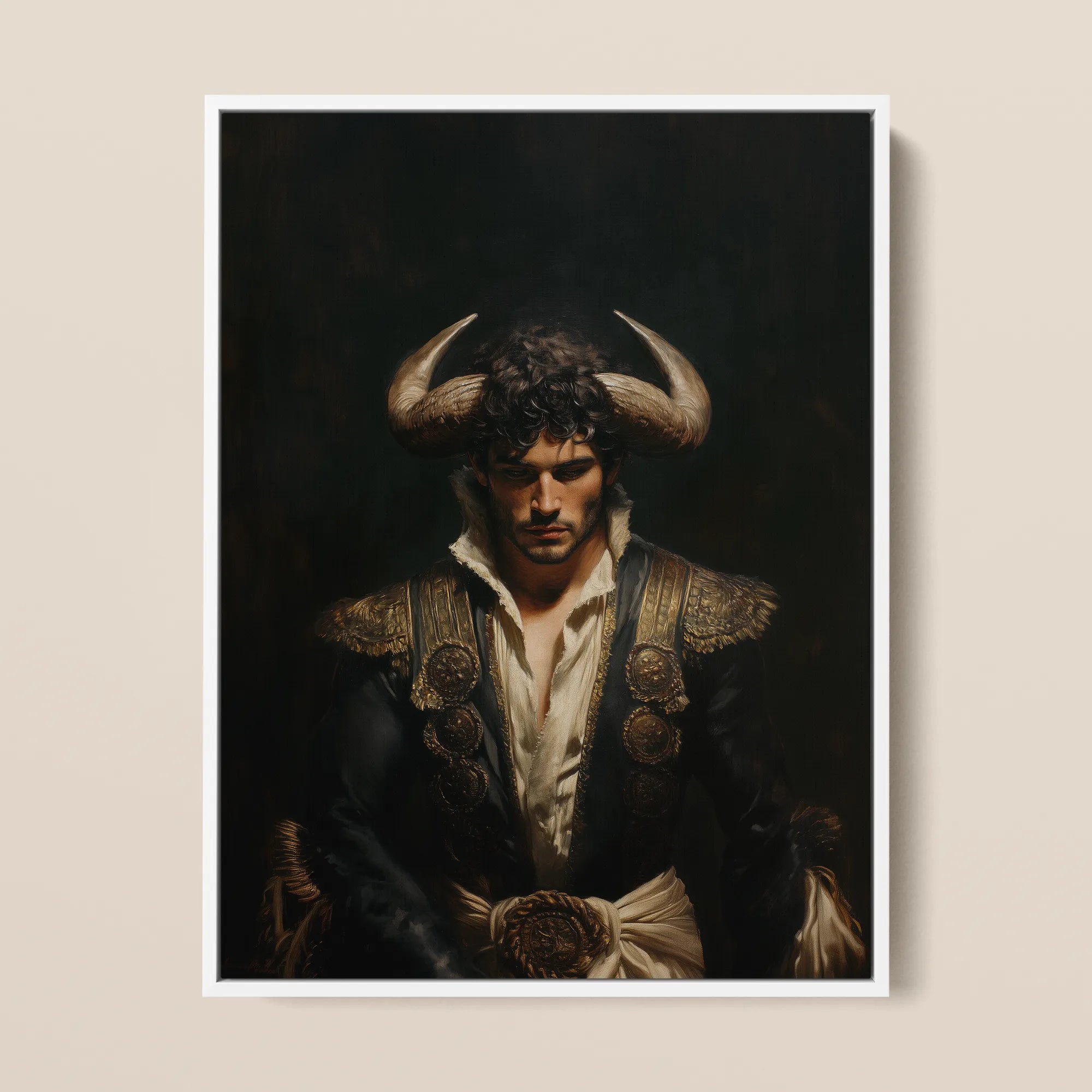 This is Spanish mythological wall art with the weight of centuries behind it. Chiaroscuro canvas art evoking the drama of Velázquez and Caravaggio, yet pulsing with a modern fantasy of gay erotica, where bullfighter and beast are one. His ornate gold-embroidered torero jacket glows against the abyss, a symbol of power, fragility, and defiance.