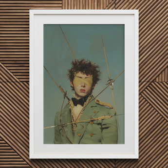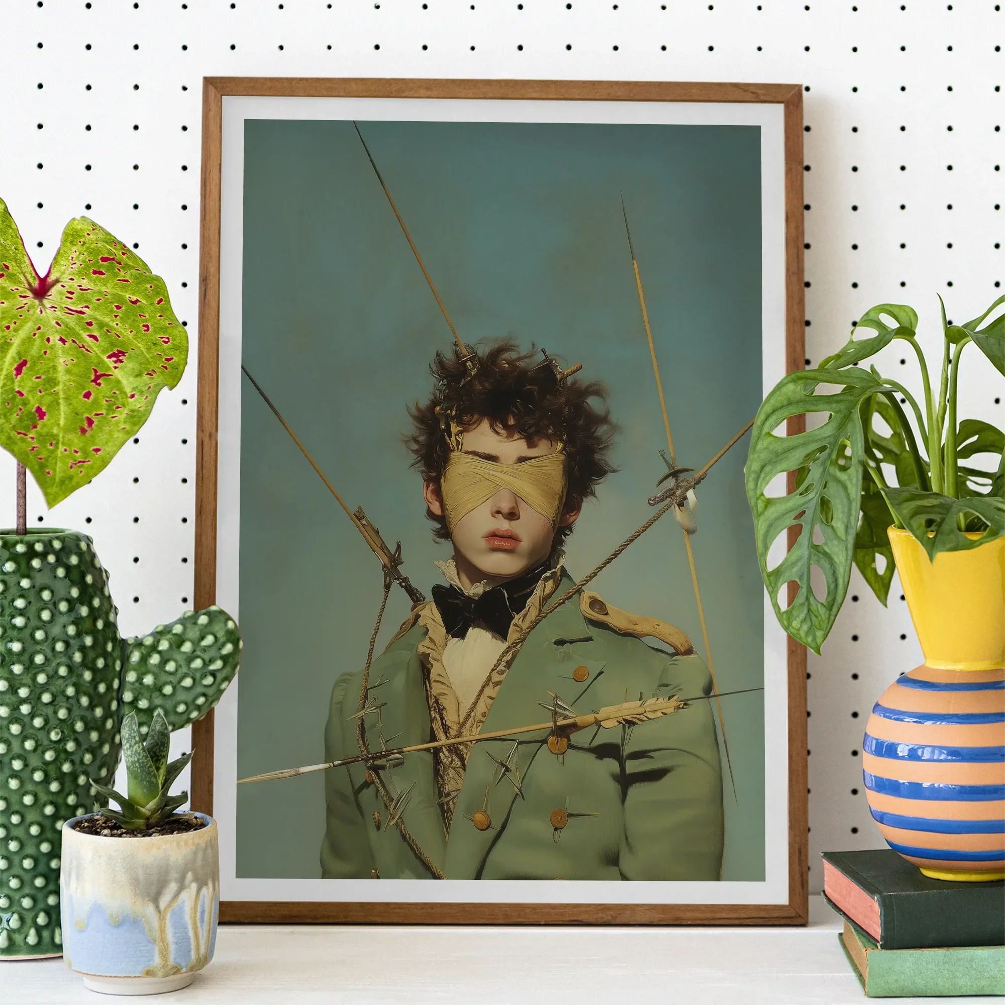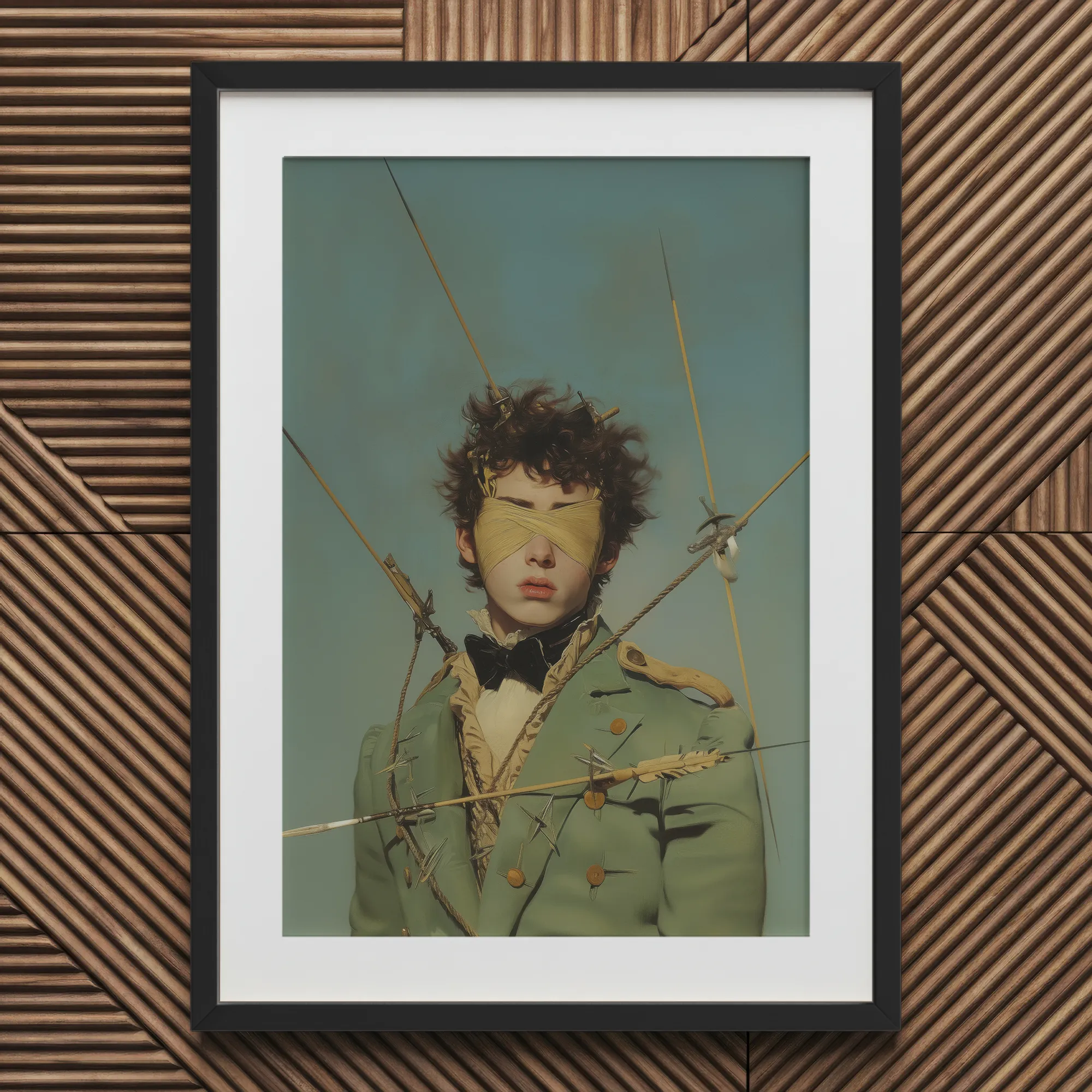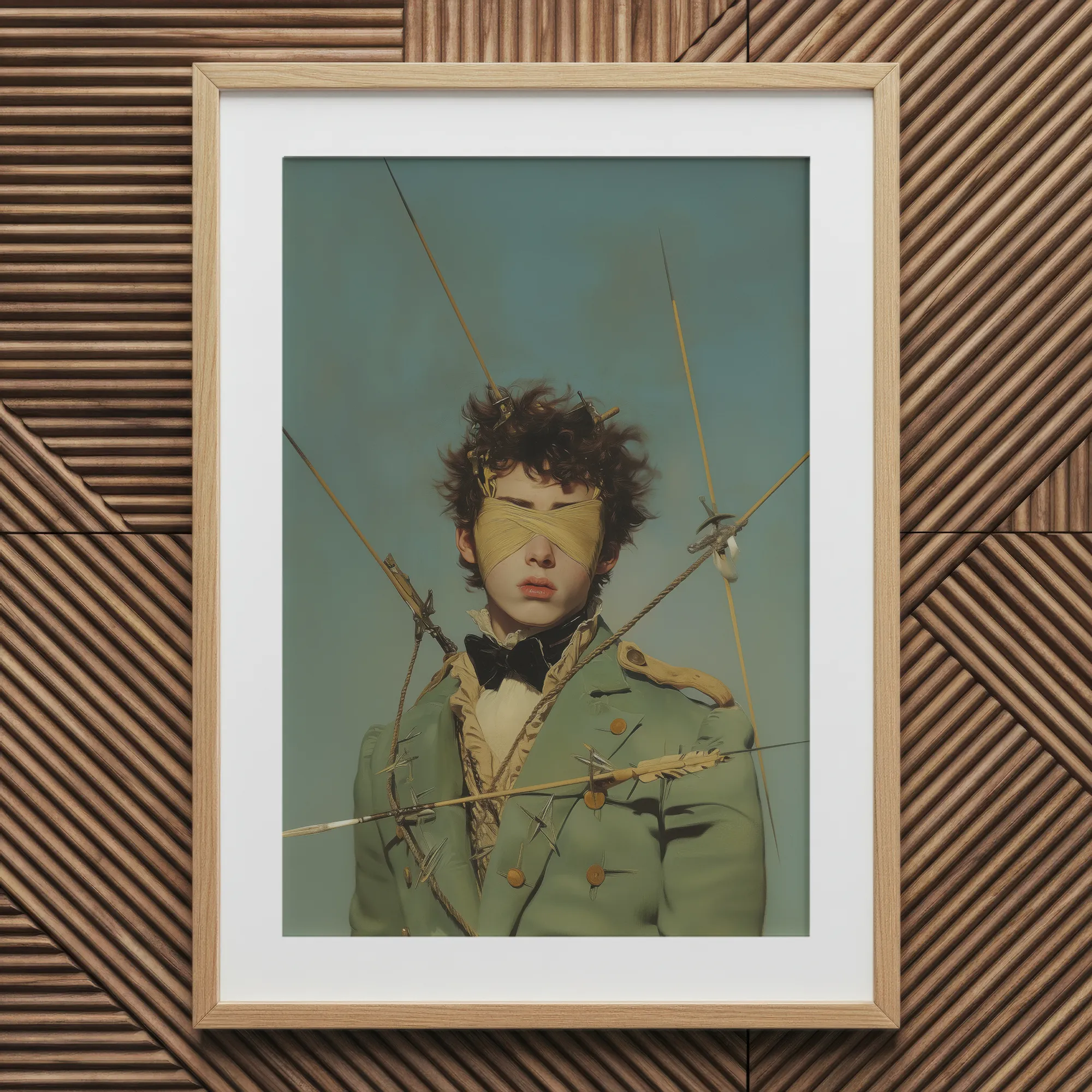 Bullseye's a surrealist icon. A supple gay military man arrested mid-metaphor. Blindfolded in ochre and bound by golden spears that do not wound but orchestrate. Draped in an oxidized-copper military coat. Their 18th century epaulets gleaming like relics from a war fought in dreams. Floating in a turquoise sky where gravity has no jurisdiction and judgment wears velvet gloves.