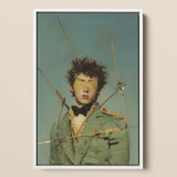 Bullseye's a myth tangled mid-metamorphosis. Half martyr, half dandy, with a whiff of celestial prank. Fresh and androgynous, the bright gay soldier stands as if summoned to a ritual trial. Dressed in an 18th-century military jacket dipped in the hue of oxidized copper. A uniform stitched from nostalgia and hallucination. Epaulets and brass buttons suggest rank, but this is a sacrificial fop, a holy fool in the theatre of precision.