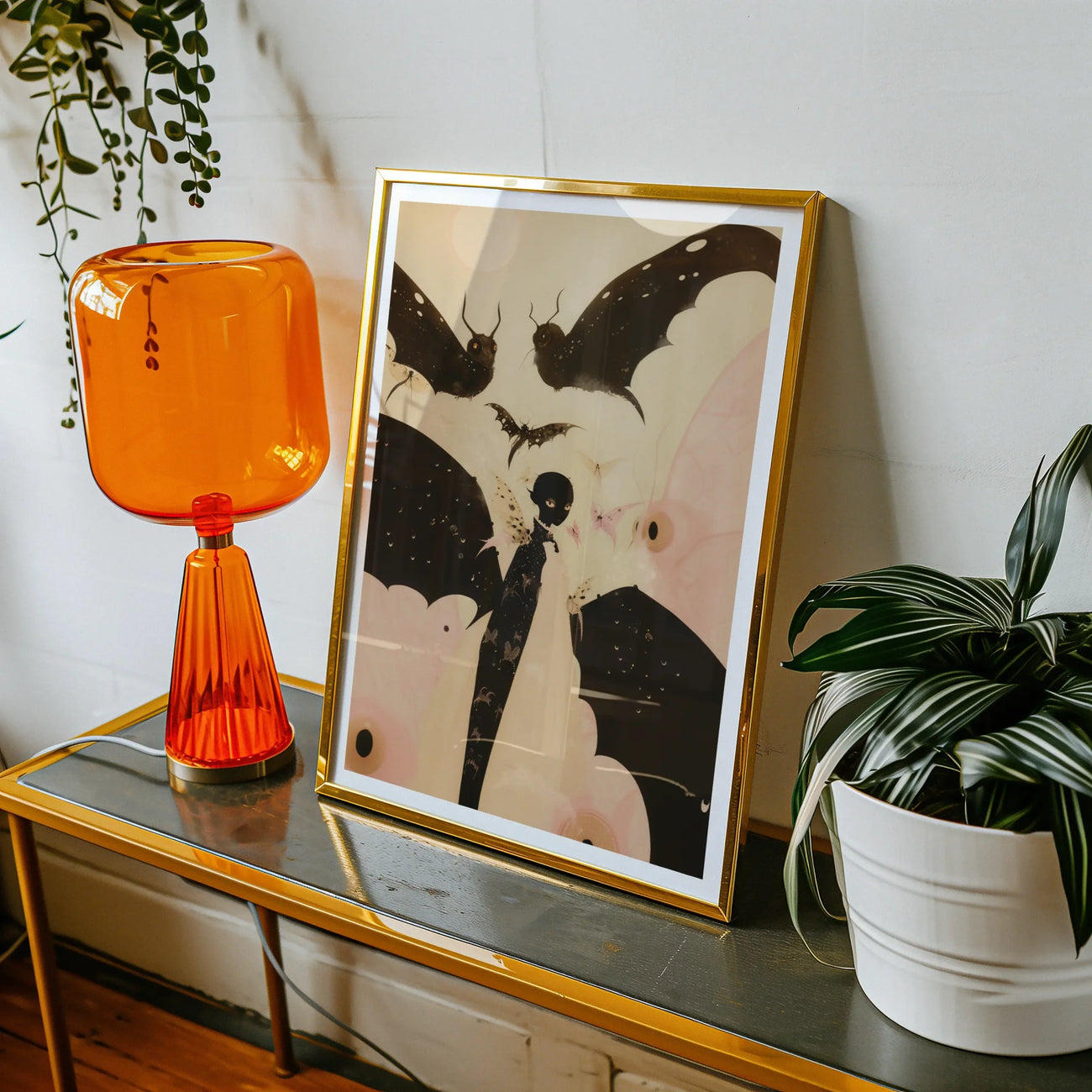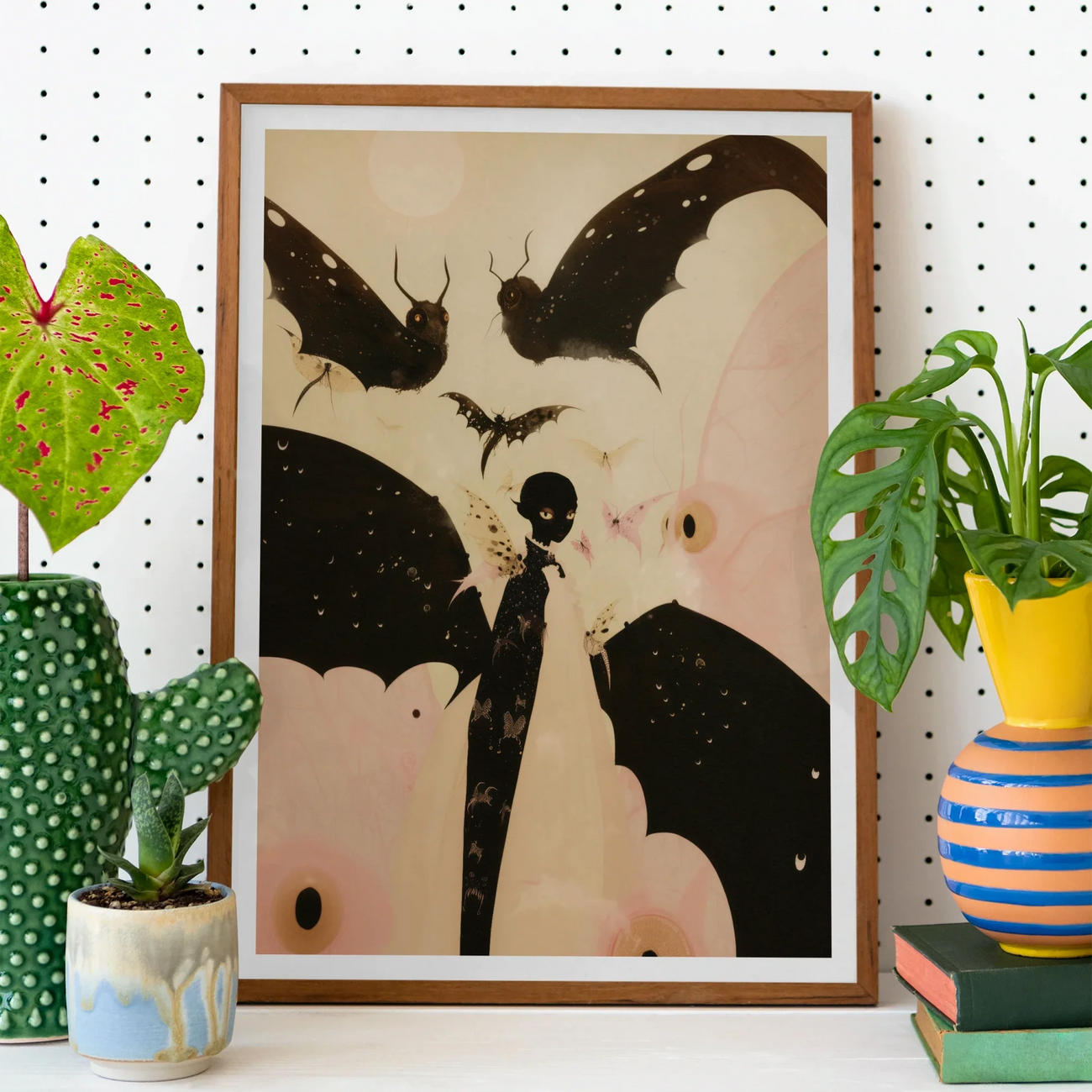 We're witnessing the crossroads of her journey—the moment where fantasy and nature fuse in silent, graceful rebellion. In this surreal butterfly art print, transformation is not just an idea; it is the heartbeat of the story. The dark fantasy of her wings, the softness of the pink sky, and the timeless echo of the creatures that swirl around her, are all threads of a world where even the smallest change can reshape the universe.