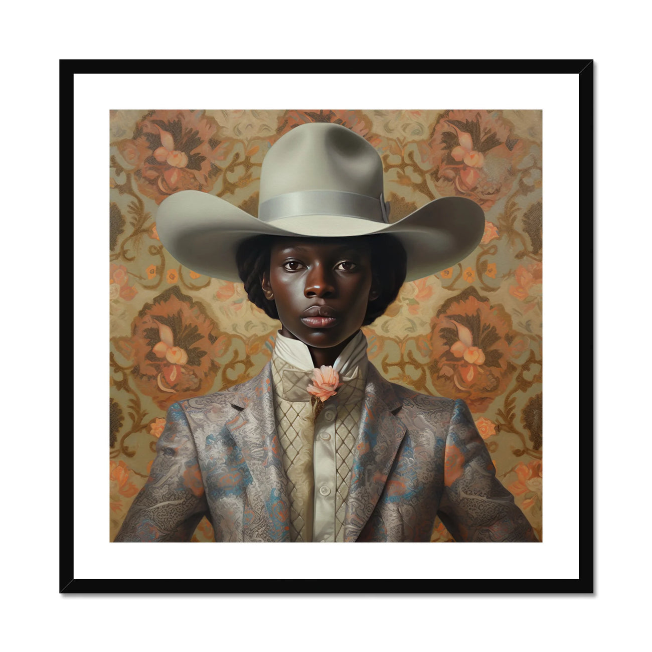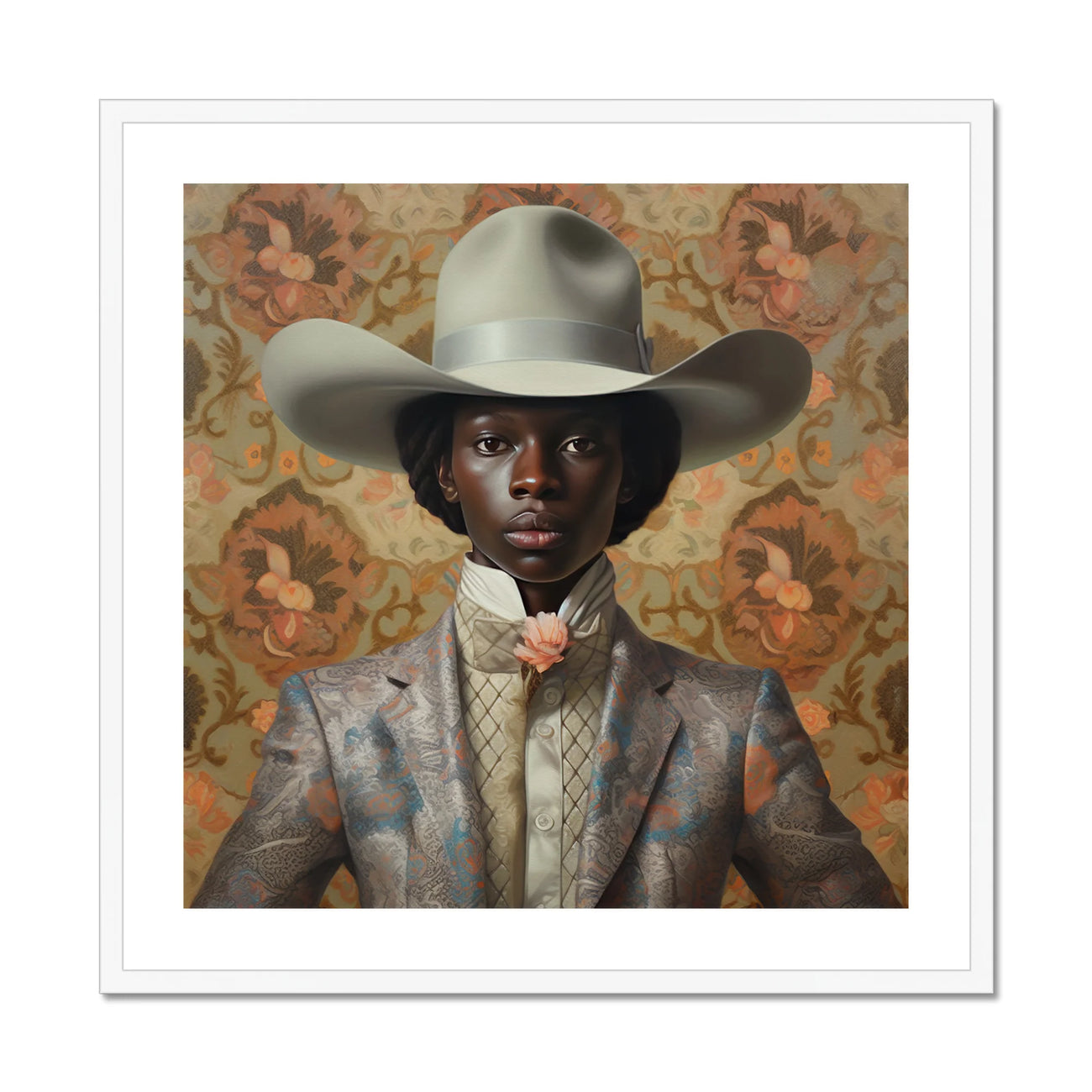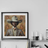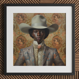 Caesar doesn't ride into legend—he owns in it. Unwavering, unbothered, a black dandy cowboy draped in the weight of histories rewritten, futures reclaimed. The alabaster Stetson tilts just so, a crown of defiance against a frontier that once tried to erase him. Beneath its brim, his gaze—dark as storm-washed mahogany—meets the world unflinchingly, a quiet challenge to the myth of the West as monochrome and unbending.
