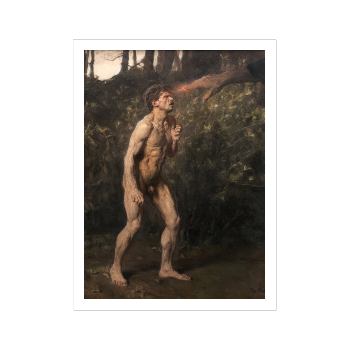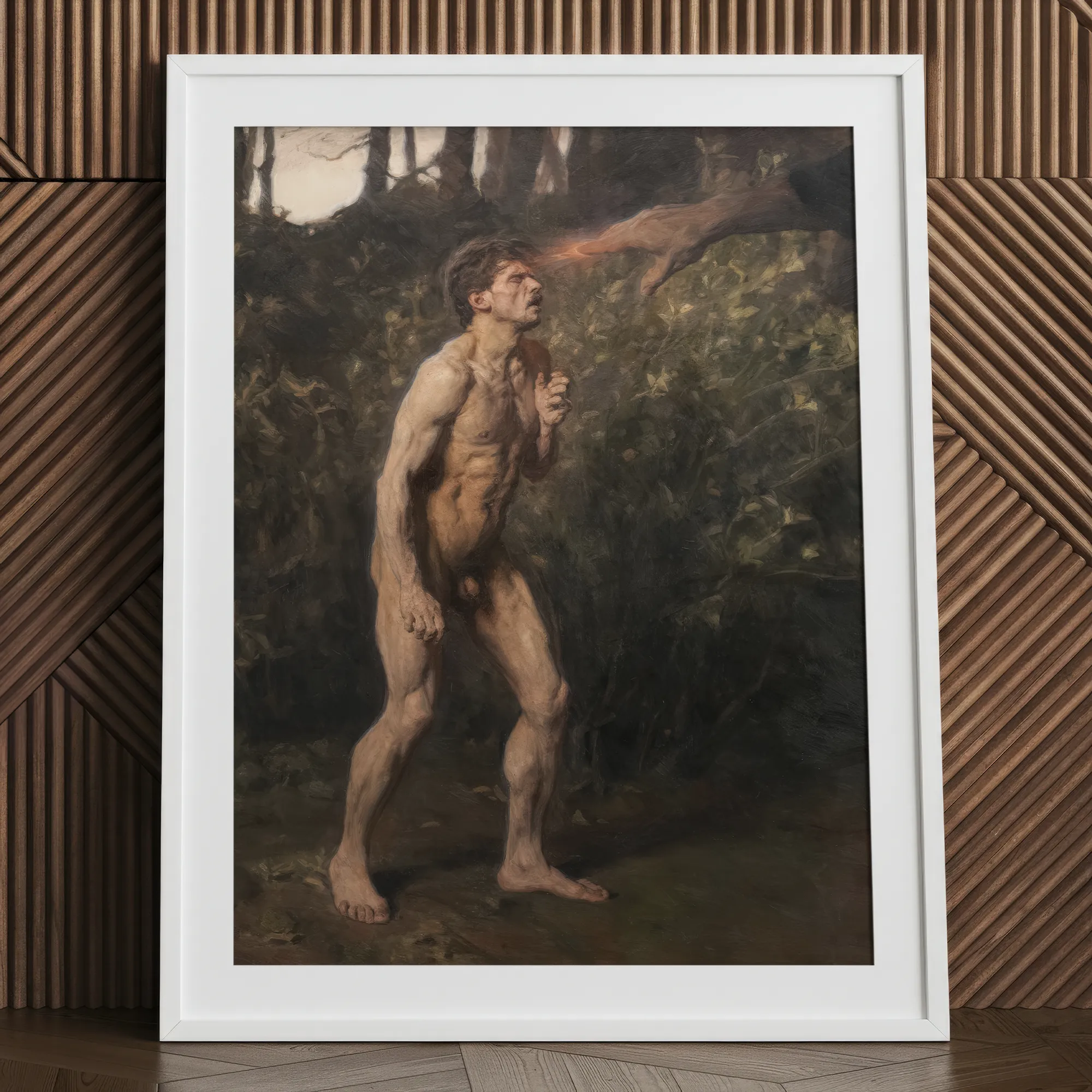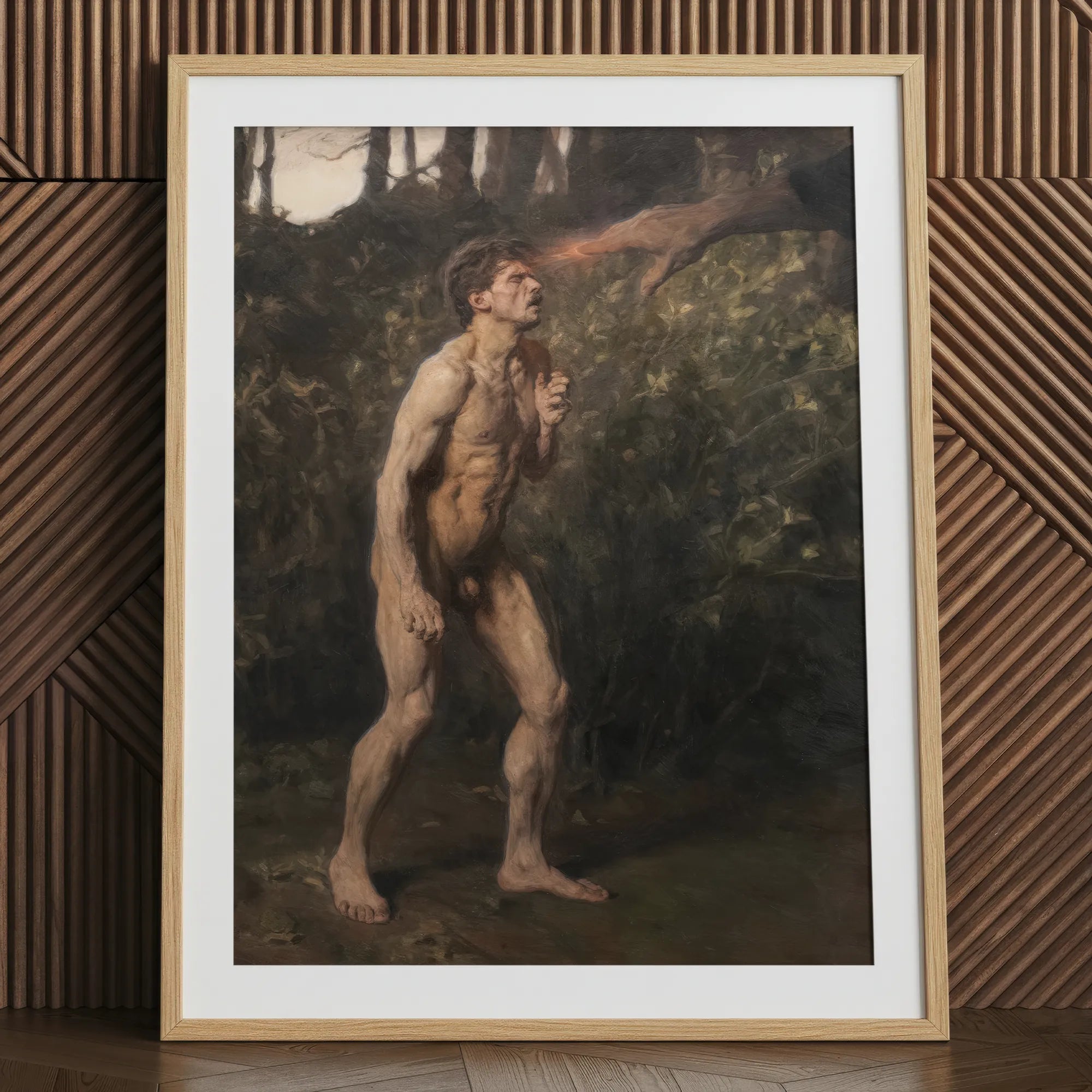 You catch linen grain along the thigh, a faint impasto ridge by the ear, a slate undertow across the path. Oil glazes coax flesh from an ochre base, with underpainting whisper-thin around the ribs. Fin-de-siècle Copenhagen meets biblical exile in a single stance. Cain hears the forest hold its breath, then chooses the road that waits.