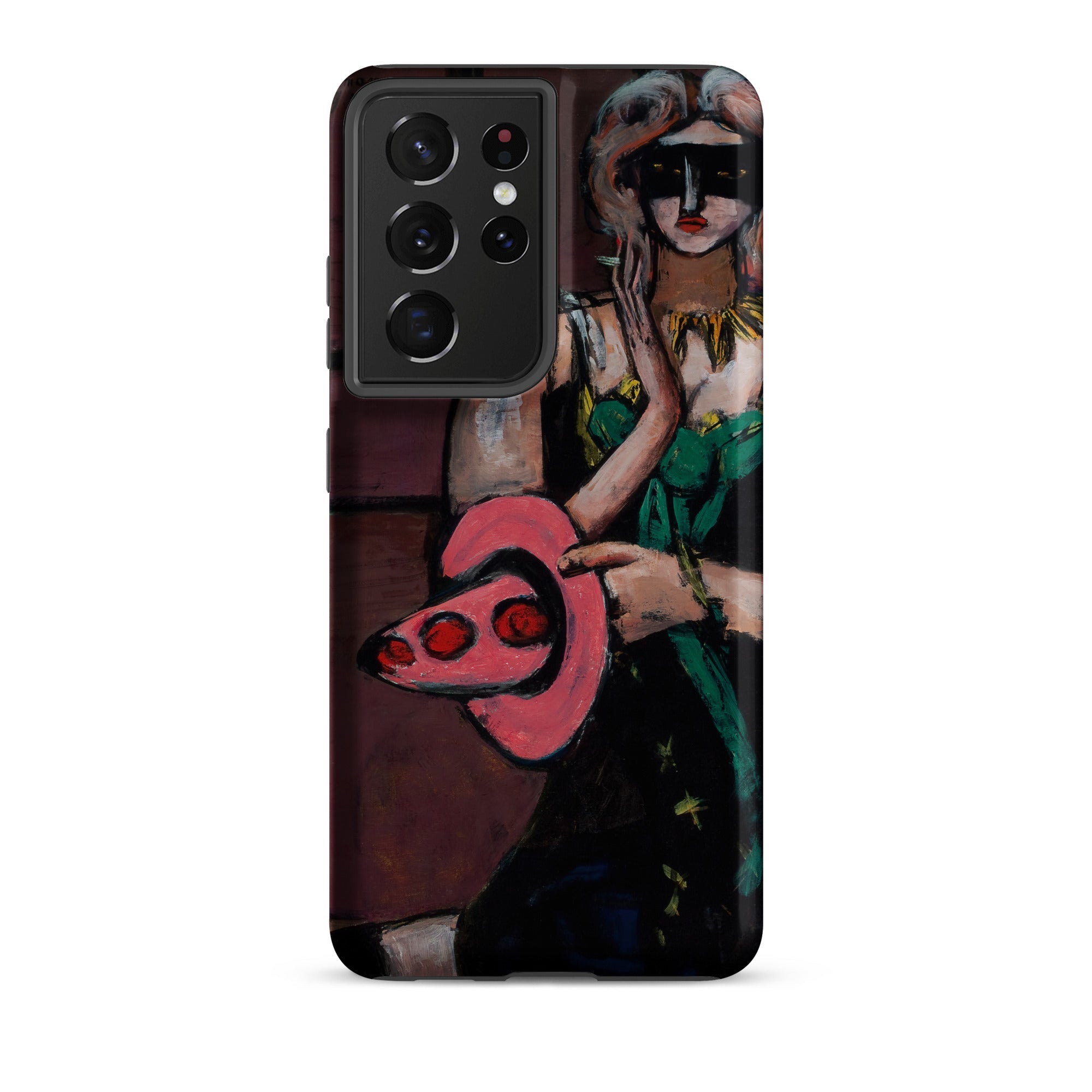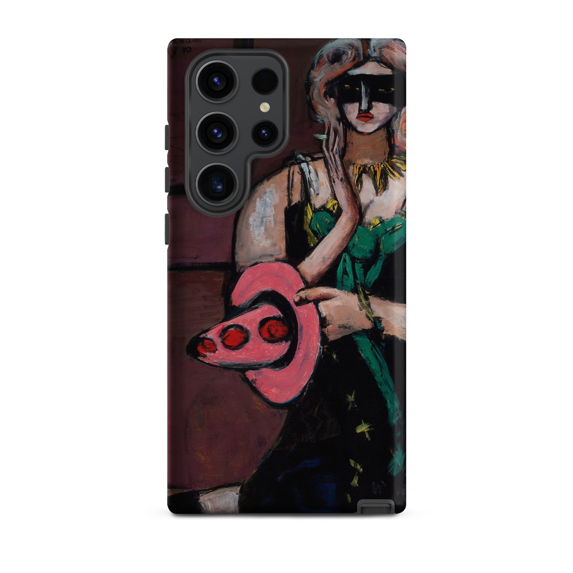 The flattened perspective and decisive contours speak the language of German Expressionism, each color block a chord in the painting’s psychological score. On this Samsung case, the composition’s theatrical restraint meets tactile intensity—brush-built skin, costume, and backdrop rendered in portable scale.