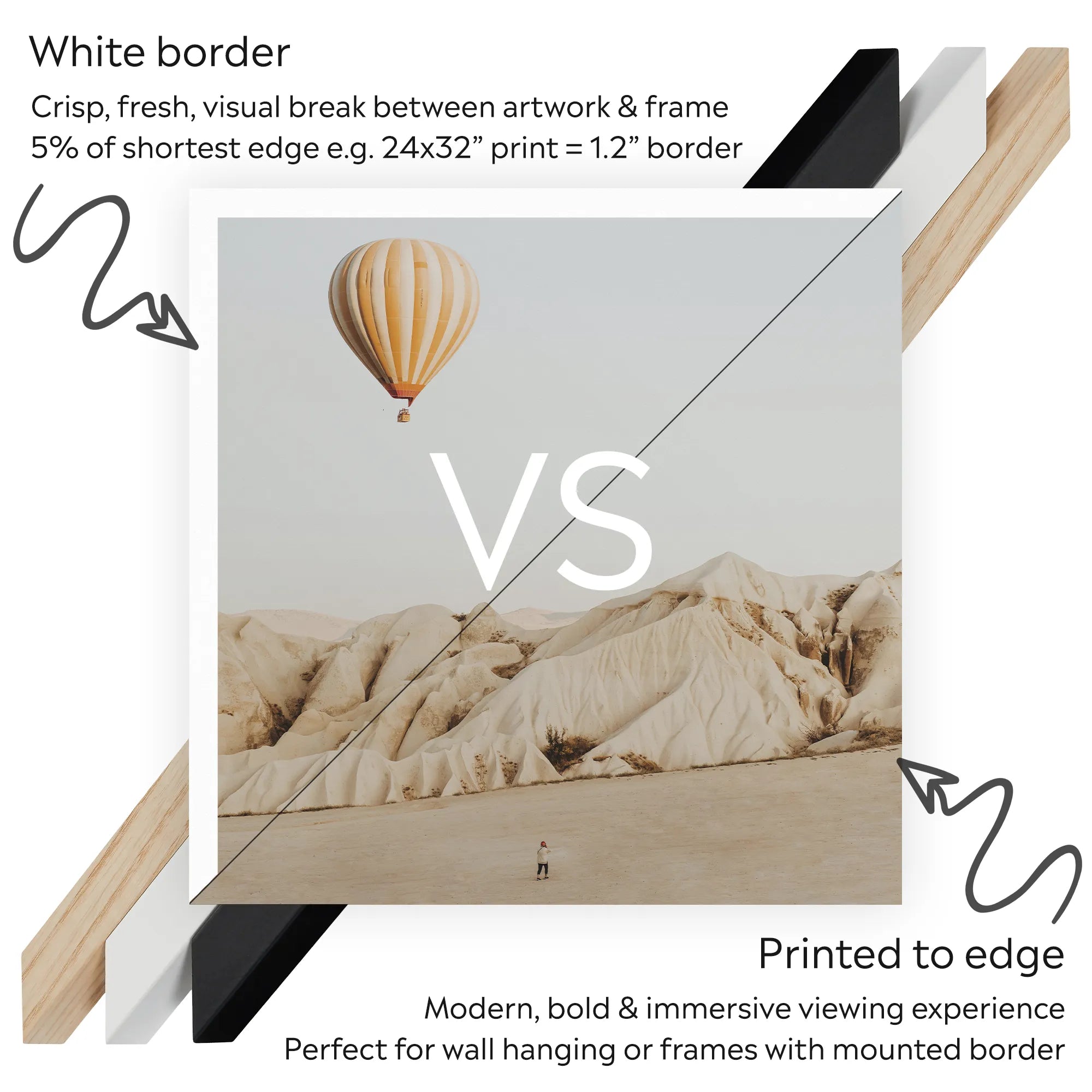 Choose a white border for a fresh and refined visual break between artwork & frame. Or no border for a bold, immersive viewing experience.