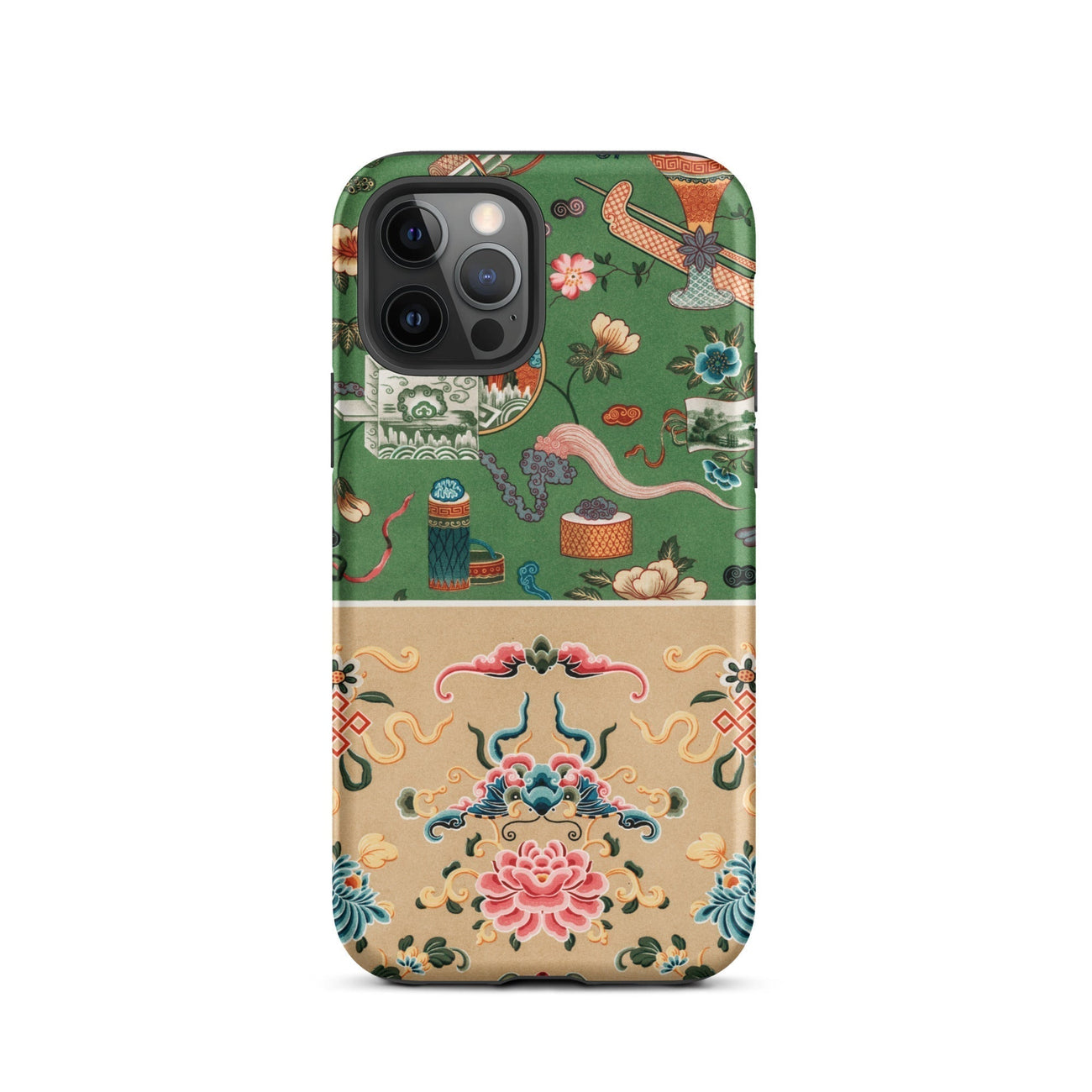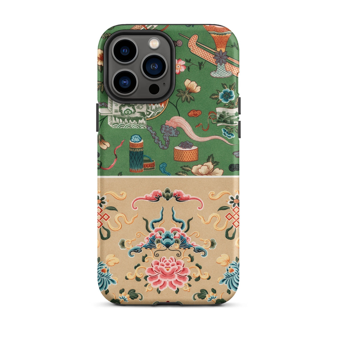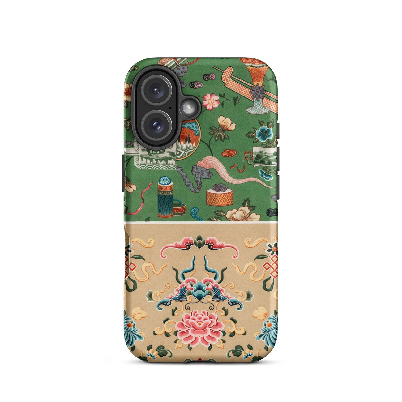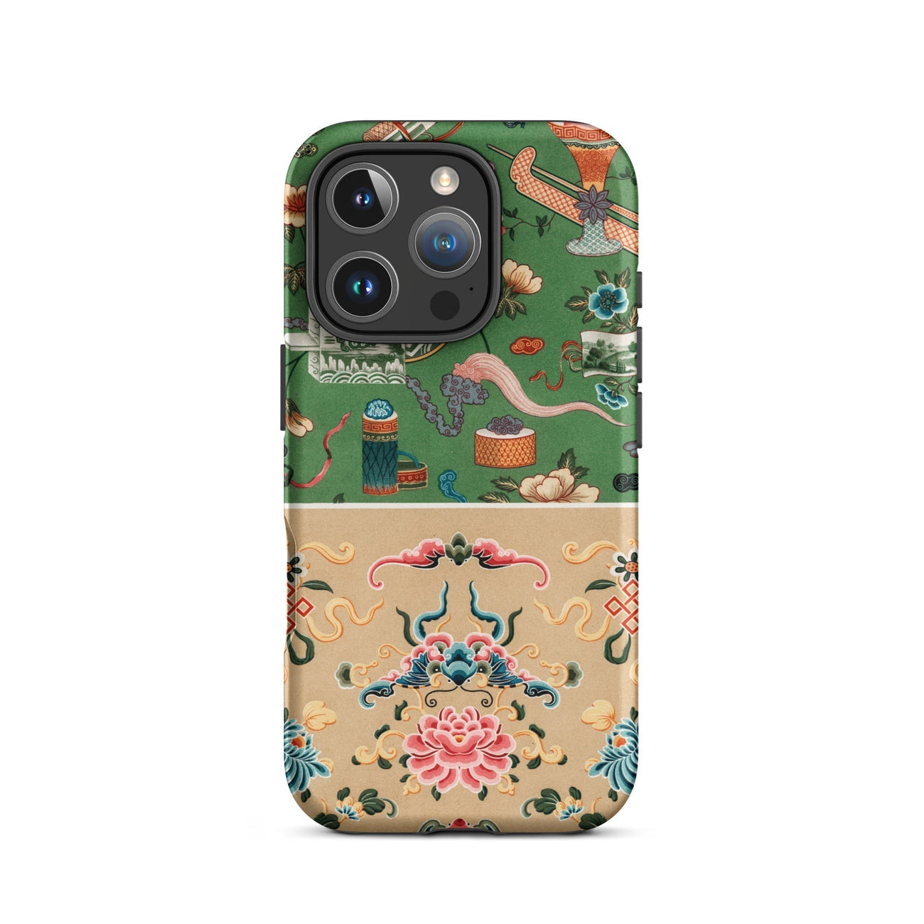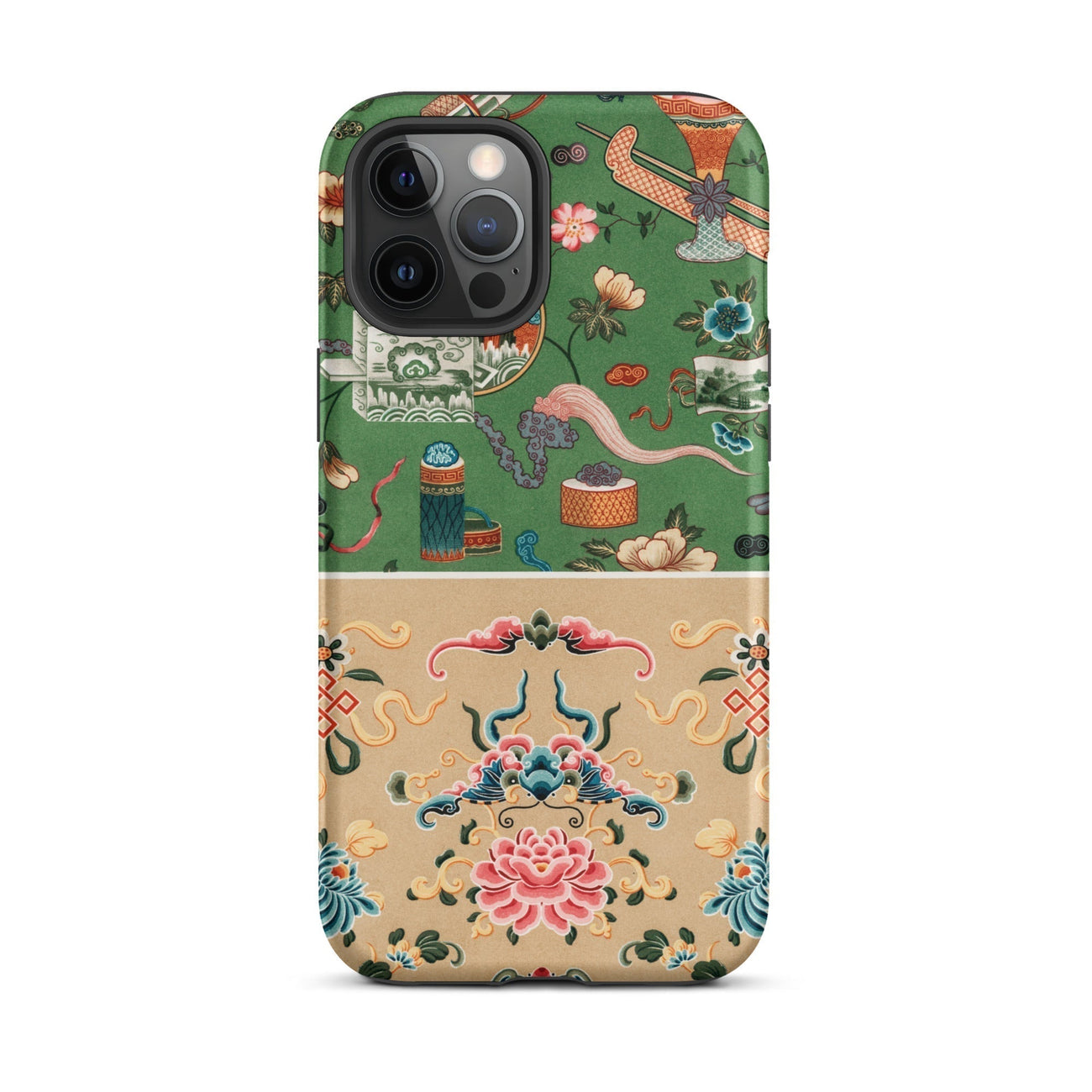 Chinoiserie chic meets iPhone sleek. You're not just protecting your device; you're wielding a pocket-sized portal to the Qing dynasty. Auguste Racinet's double act dances on your screen, a verdant tapestry of Eastern elegance. Jade-hued backdrop cradles delicate blooms, while ornate vessels whisper tales of silk roads and imperial courts.